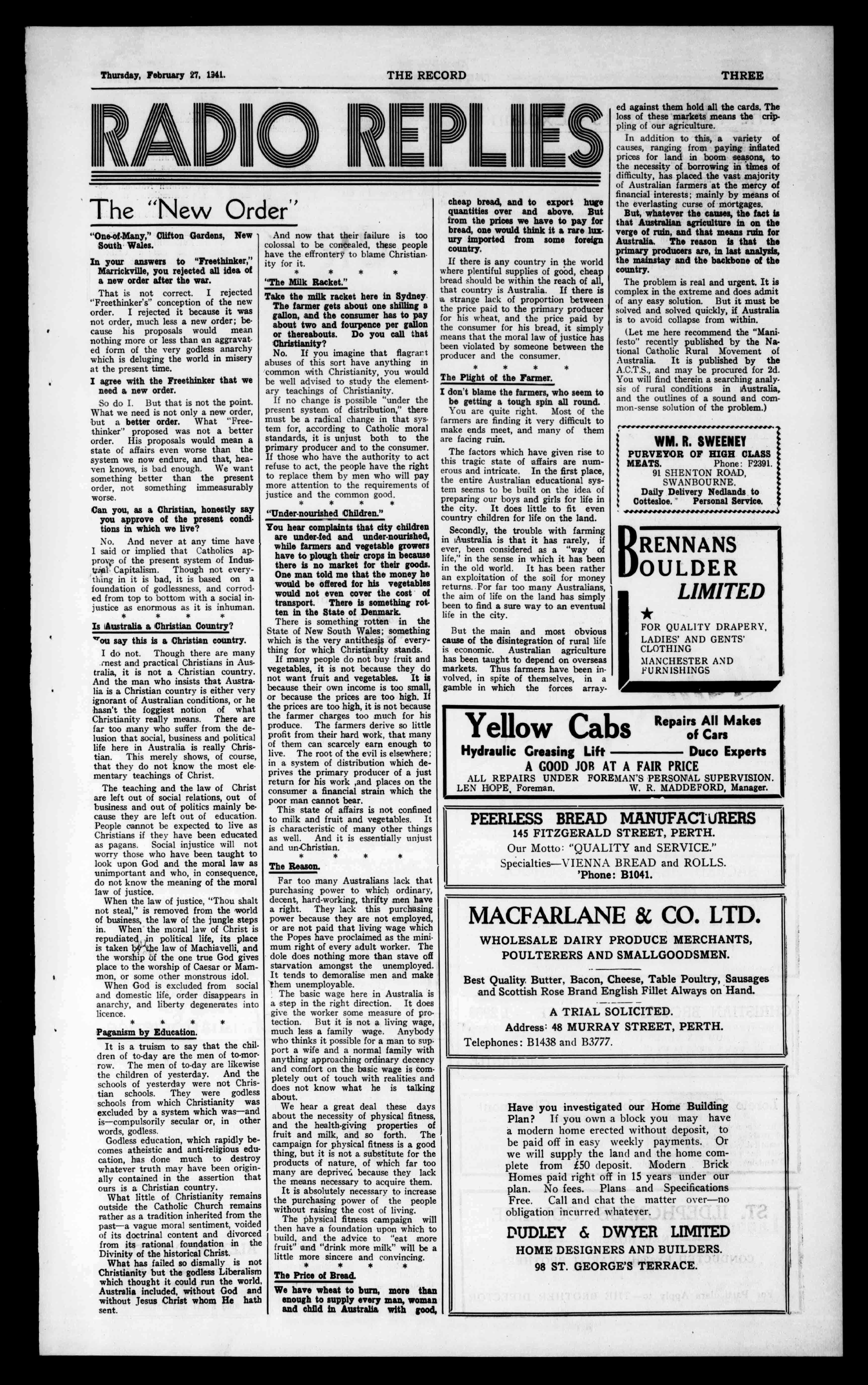 3d. NO.2,961. PERTH,THURSDAY,num:num27,1941. SUITS HANDTAILORED, £5-5-0 SamplesandS.M. FormsFree. MdtAN& KtATING LADIES'&GENT'S TAILORS. NotetheAddress: 569aILAYSTREET, PERTH Opp.Criterion Hotel). Established42Years. Tel:84594. 3d. SIXTY-EIGHTHYEAR.