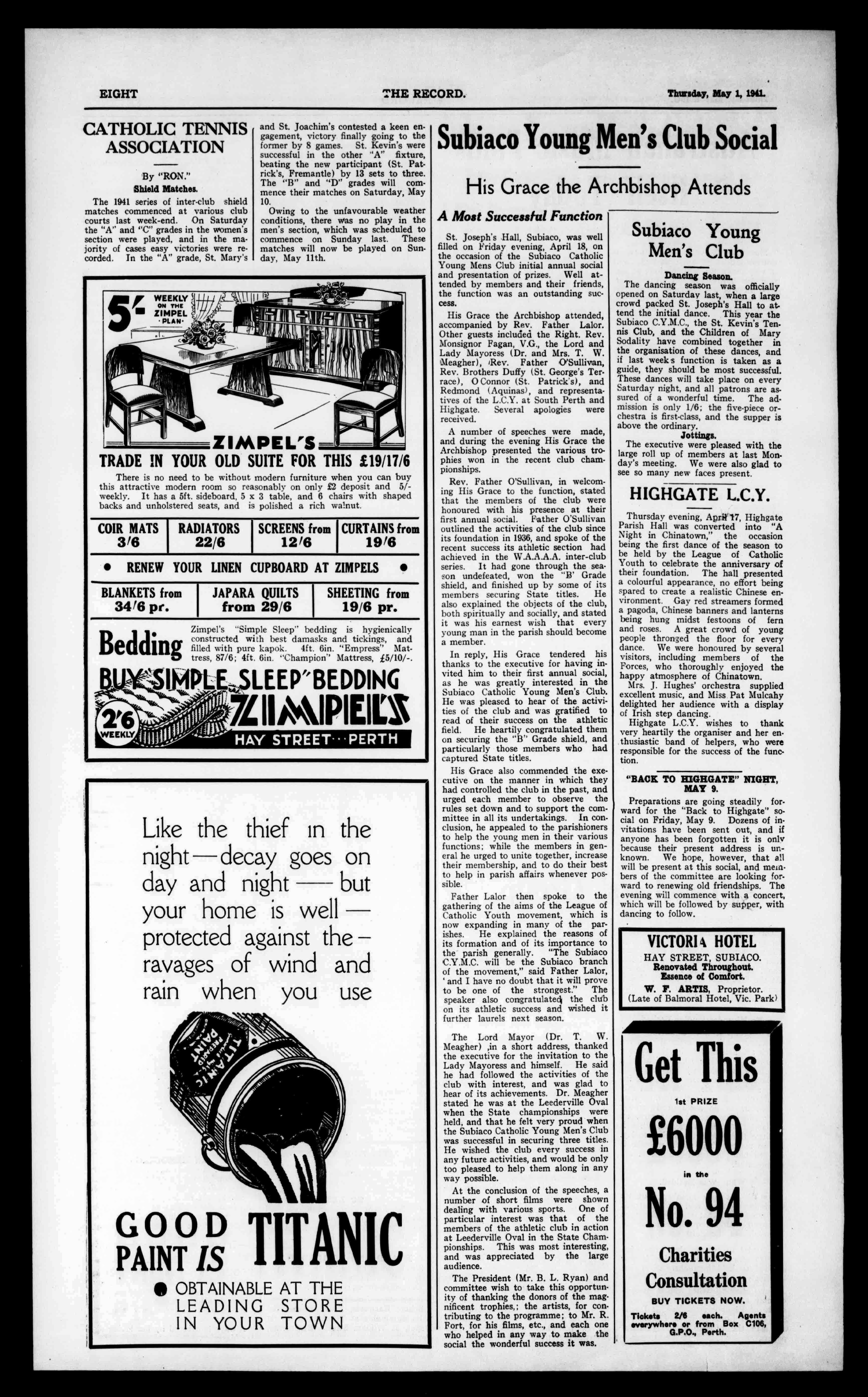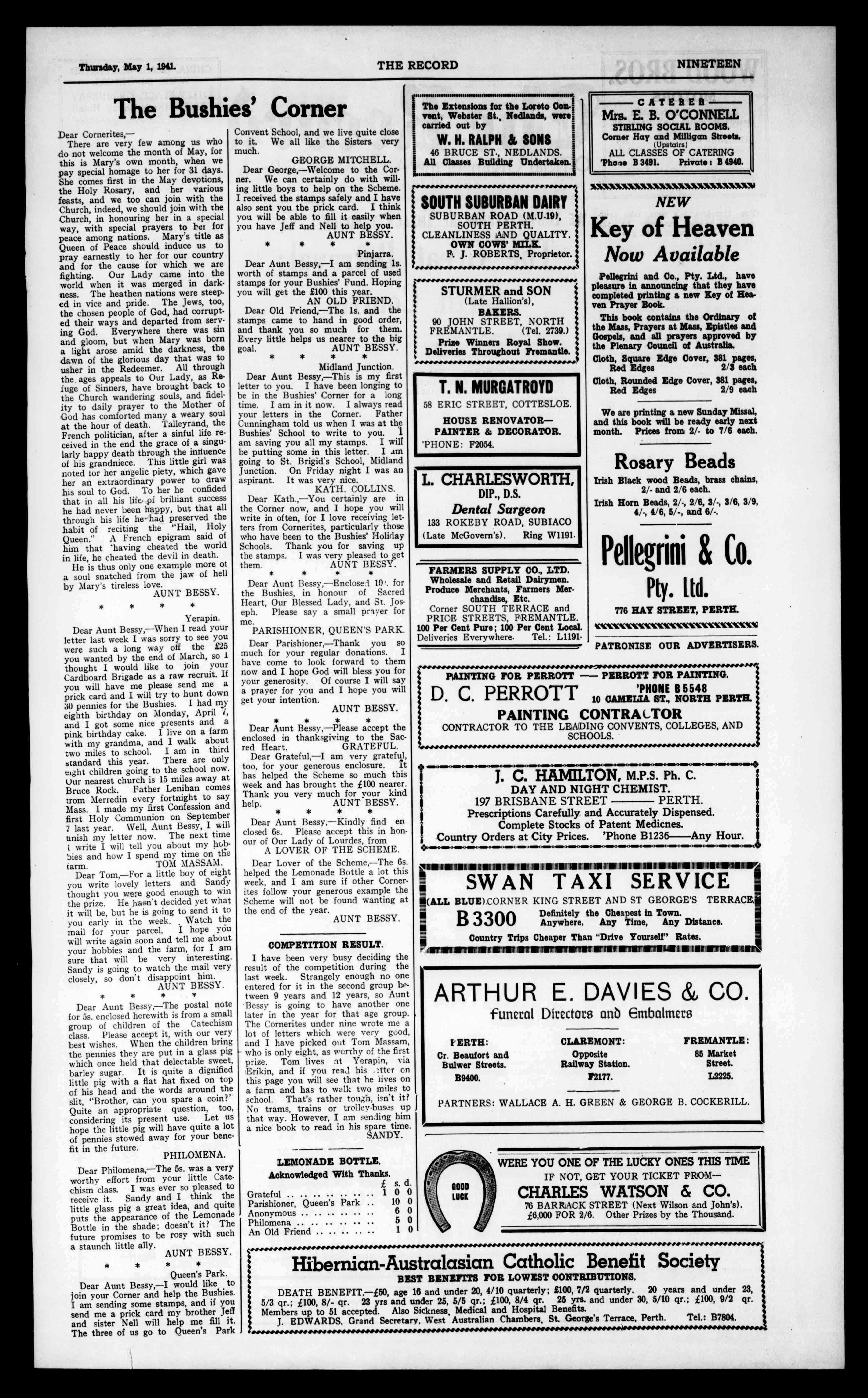CATERER Mrs.E.B.O'CONNELL STIRLINGSOCIALROOMS, CornerHayandMilliganStreets. (Upmaus) ALLCLASSESOFCATERING 'PhoneB3491. PrivateB4940. NEW KeyofHeaven NowAvailable PellegriniandCo.,Pty.Ltd.,have pleasureinannouncingthattheyhave completedprintinganewKeyofHeavenPrayerBook. ThisbookcontainstheOrdinaryof theMass,PrayersatMass,Epistlesand Gospels,andallprayersapprovedby thePlenaryCouncilofAustralia. Cloth,SquareEdgeCover,381pages, RedEdges 2/3each Cloth,RoundedEdgeCover,381pages, RedEdges 2/9each WeareprintinganewSundayMissal, andthisbookwillbereadyearlynext month.Pricesfrom2/-to7/6each. RosaryBeads IrishBlackwoodBeads,brasschains, 2/-and2,6each. IrishHornBeads,2/-,2/6,3/-,3/6.39, 4/-,4/6,5/-,and6/.. Pellegrini& Pty.ltd. 776HAYSTREET,PERTH. vimincionciocuirocuimmocuiame PATRONISEOURADVERTISERS. 04.0.4,4P PUNTINGFORPERROTT PERROTTFORPAINTING. D.C.PERROTT 'PHONE85548 10CAMELIAST.,NORTHPERTH. PAINTINGCONTRACTOR CONTRACTORTOTHELEADINGCONVENTS,COLLEGES,AND SCHOOLS. T.C.HAMILTON,M.P.S.Ph.C. DAYANDNIGHTCHEMIST. 197BRISBANESTREET PERTH. PrescriptionsCarefully.andAccuratelyDispensed. CompleteStocksofPatentMedicnes. CountryOrdersatCityPrices.'PhoneB1236-AnyHour. a SWANTAXISERVICE g !(ALLBLUE)CORNERKINGSTREETANDSTGEORGE'STERRACE. a B3300 DefinitelytheCheapestinTown. I Anywhere,AnyTime,AnyDistance. a j CountryTripsCheaperThan"DriveYourself"Rates. ForsitiarmanuminarirmlirirrinnrilloirrumillultaalarmuzaI ARTHURE.DAVIES&CO. funeralDirectorsandEmbalmers IERTH: Cr.Beaufortand BulwerStreets. B9400. CLAREMONT: Opposite RailwayStation. F2177. FREMANTLE: 85Market Street. L2225. PARTNERS:WALLACEA.H.GREEN&GEORGEB.COCKERILL. WEREYOUONEOFTHELUCKYONESTHISTIME IFNOT,GETYOURTICKETFROMCHARLESWATSON&CO. 76BARRACKSTREET(NextWilsonandJohn's). 0,000FOR2/6.OtherPrizesbytheThousand. Hibernian-AustralasianCatholicBenefitSociety BESTBENEFITSFORLOWESTCONTRIBUTIONS. DEATHBENEFIT-DO,age16andunder20,4/10quarterly;£100,7/2quarterly.20yearsandunder23, 5/3qr.;1100,8/-qr.23yrsandunder25,5/5qr.:1100,8/4qr.25yrs.andunder30,5/10qr.;1100,9/2qr. Membersupto51accepted.AlsoSickness,MedicalandHospitalBenefits. J.EDWARDS,GrandSecretary.WestAustralianChambers,St.George'sTerrace,Perth. Tel.:B7804.