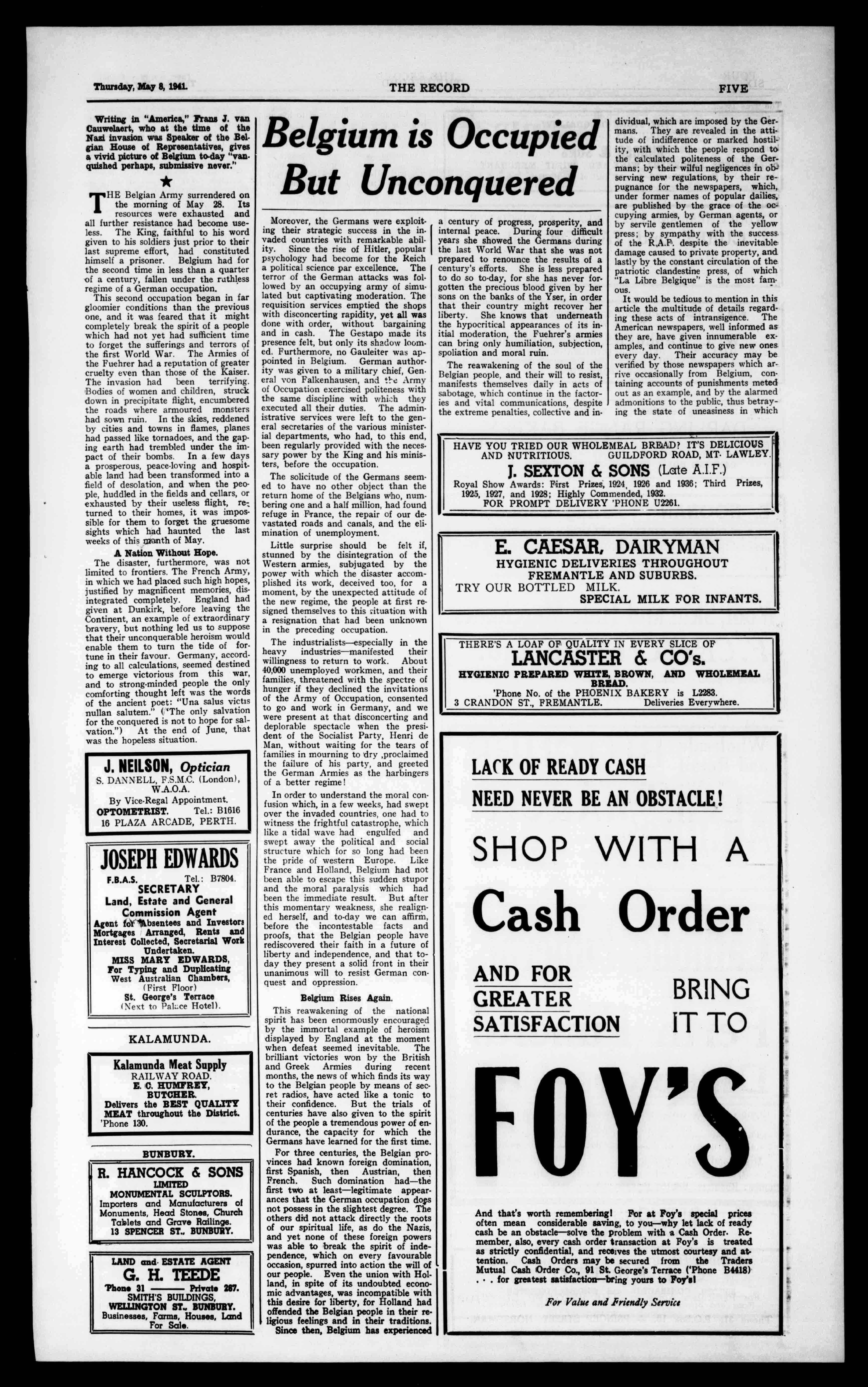 111,41,.".4" ,e743-27 RegisteredattheG.P.O.,Perth,ftransmissionbypostuanewspaper. dire,, dr OP. ,170#7.11P; I "Taste Tells" Johnston's ;SAUSAGES and FRANKFURTS 3d. NO.2,971. -Y s\ 4 4, SUITS HANDTAILORED, 5-5-0 SamplesandSAL FormsTree. MdtAN& KEATING LADIES'&OMITS TAILORS. NotetheAddress: 569aHAYSTREET, PERTH (Opp.Criterion Hotel). Established42Years. Tel:B4594. PERTH,THURSDAY,MAY8,1941. SIXTY-EIGHTHYEAR.