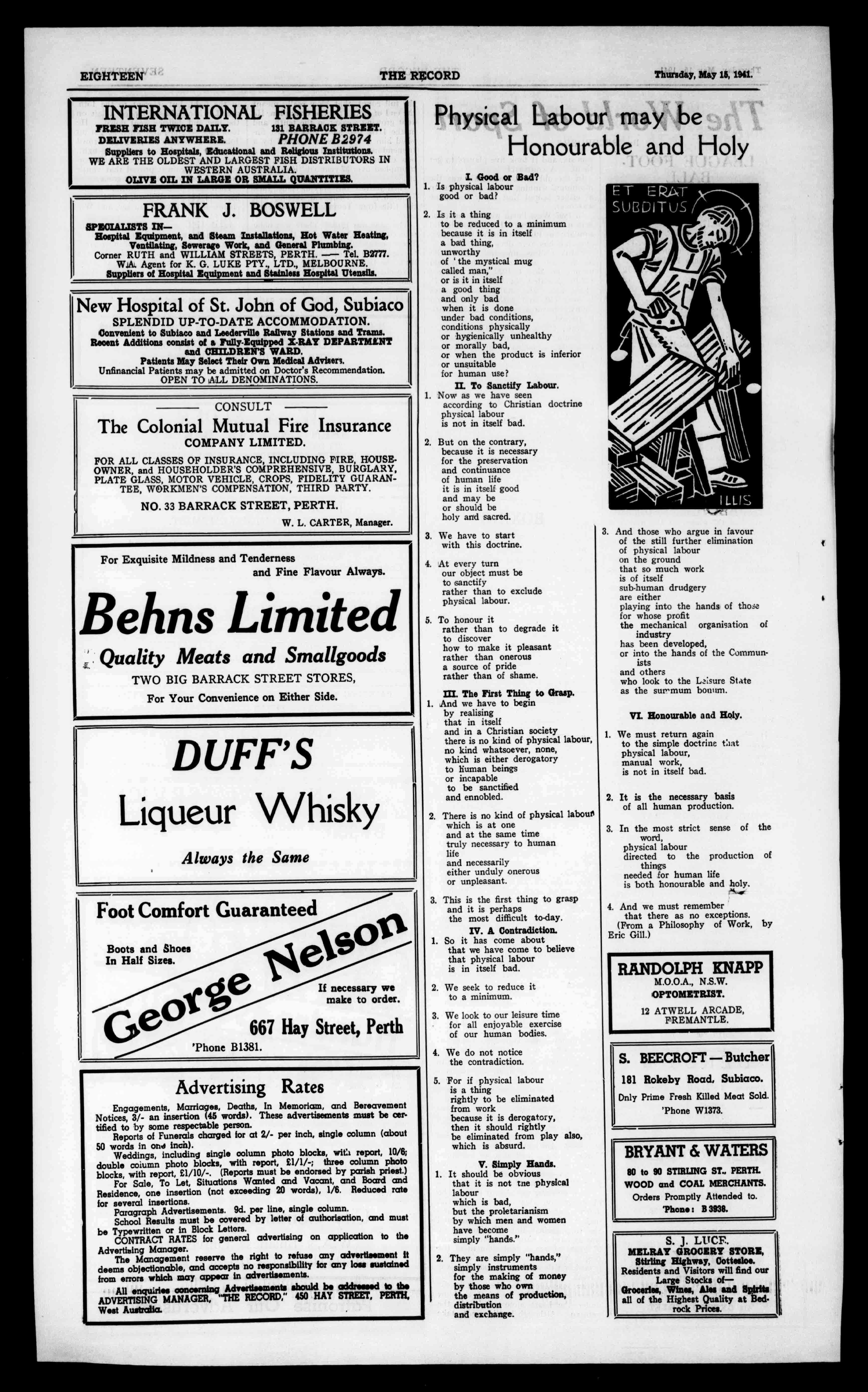 EIGHTEEN THERECORD Thursday,May16,1941. INTERNATIONALFISHERIES FRESHFISHTWICEDAILY. 131BARRACKSTREET. DELIVERIESANYWHERE. PHONEB2974 SupplierstoHospitals,EducationalandReligiousInstitutions. WEARETHEOLDESTANDLARGESTFISHDISTRIBUTORSIN WESTERNAUSTRALIA. OLIVEOILINLARGEORSMALLQi111114TITIES. FRANKJ.BOSWELL SPECIALISTSINHospitalEquipment,andSteamInstallations,HotWaterHeating, Ventilating,SewerageWork,andGeneralPlumbing. CornerRUTHandWILLIAMSTREETS,PERTH.-Tel.B2777. W.A.AgentforK.G.LUKEPTY.,LTD.,MELBOURNE. SuppliersofHospitalEquipmentandStainlessHospitalUtensils. NewHospitalofSt.JohnofGod,Subiaco SPLENDIDUP-TO-DATEACCOMMODATION. ConvenienttoSubiacoandLeedervilleRailwayStationsandTrams. RecentAdditionsconsistofaFully-EquippedX-RAYDEPARTMLNT andCHILDREN'SWARD. PatientsMaySelectTheirOwnMedicalAdviser;. UnfinancialPatientsmaybeadmittedonDoctor'sRecommendation. OPENTOALLDENOMINATIONS. CONSULT TheColonialMutualFireInsurance COMPANYLIMITED. FORALLCLASSESOFINSURANCE,INCLUDINGFIRE,HOUSEOWNER,andHOUSEHOLDER'SCOMPREHENSIVE,BURGLARY, PLATEGLASS,MOTORVEHICLE,CROPS,FIDELITYGUARANTEE,WORKMEN'SCOMPENSATION,THIRDPARTY. NO.33BARRACKSTREET,PERTH. W.L.CARTER,Manager. ForExquisiteMildnessandTenderness andFineFlavourAlways. BehnsLimited QualityMeatsandSmallgoods TWOBIGBARRACKSTREETSTORES, ForYourConvenienceonEitherSide. DUFF'S LiqueurWhisky AlwaystheSame FootComfortGuaranteed BootsandShoes InHalfSizes. .seSO° GeOVe Ifnecessarywe maketoorder. 667HayStreet,Perth 'PhoneB1381. AdvertisingRates Engagements,Marriages,Deaths,InMemoriam,andBereavement Notices,3/-aninsertion(45words).Theseadvertisementsmustbecertifiedtobysomerespectableperson. ReportsofFuneralschargedforat2/-perinch,singlecolumn(about 50wordsinandinch). Weddings,includingsinglecolumnphotoblocks,witiireport,10/6; doublecolumnphotoblocks,withreport,£1/1/-;threecolumnphoto blocks,withreport,11/10/-.(Reportsmustbeendorsedbyparishpriest.) ForSale,ToLet,SituationsWantedandVacant,andBoardand Residence,oneinsertion(notexceeding20words),1/6.Reducedrate forseveralinsertions. ParagraphAdvertisements.9d.