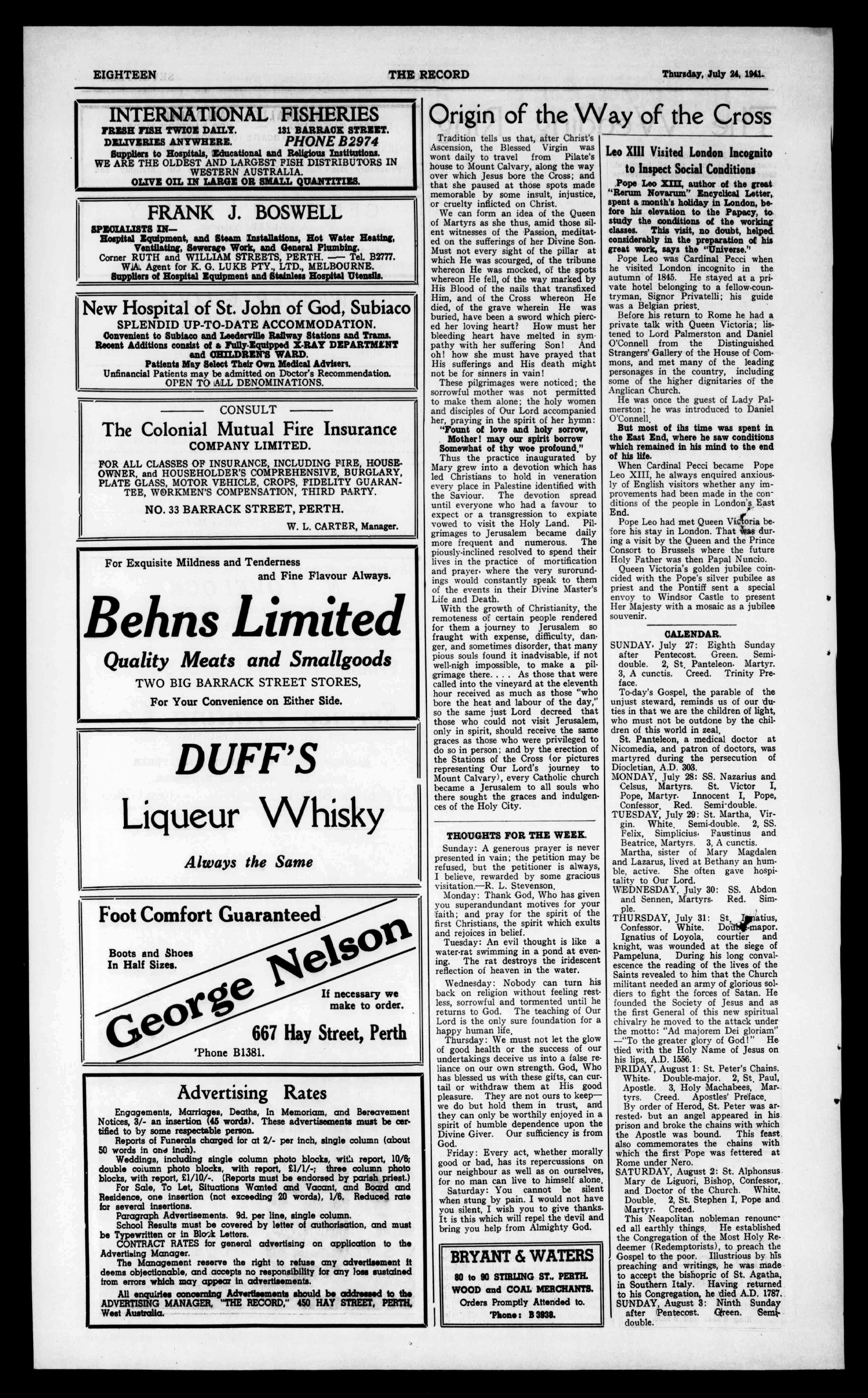 EIGHTEEN THERECORD Thursday,July24,1941. INTERNATIONALFISHERIES FRESHFISHTWICEDAILY. 191BARRACKSTREET. DELIVERIESANYWHERE. PHONEB2974 SupplierstoHospitals,EducationalandReligiousInstitutions. WEARETHEOLDESTANDLARGESTFISHDISTRIBUTORSIN WESTERNAUSTRALIA. OLIVEOILINLARGEORSMALLQUANTITIES. FRANKJ.BOSWELL SPECIALISTSINHospitalEquipment,andSteamInstallations,HotWaterHeating, Ventilating,SewerageWork,andGeneralPlumbing. CornerRUTHandWILLIAMSTREETS,PERTH.-Tel.B2777. WA.AgentforK.G.LUKEPTY.,LTD.,MELBOURNE. SuppliersofHospitalEquipmentandStainlessHospitalUtensils. NewHospitalofSt.JohnofGod,Subiaco SPLENDIDUP-TO-DATEACCOMMODATION. ConvenienttoSubiacoandLeedervilleRailwayStationsandTrams. RecentAdditionsconsistofaFully-EquippedX-RAYDEPARTMLNT andCHILDREN'SWARD. PatientsMaySelectTheirOwnMedicalAdvisers. UnfinancialPatientsmaybeadmittedonDoctor'sRecommendation. OPENTOALLDENOMINATIONS. CONSULT TheColonialMutualFireInsurance COMPANYLIMITED. FORALLCLASSESOFINSURANCE,INCLUDINGFIRE,HOUSEOWNER,andHOUSEHOLDER'SCOMPREHENSIVE,BURGLARY, PLATEGLASS,MOTORVEHICLE,CROPS,FIDELITYGUARANTEE,WORKMEN'SCOMPENSATION,THIRDPARTY. NO.33BARRACKSTREET,PERTH. W.L.CARTER,Manager. ForExquisiteMildnessandTenderness andFineFlavourAlways. BehnsLimited QualityMeatsandSmallgoods TWOBIGBARRACKSTREETSTORES, ForYourConvenienceonEitherSide. DUFF'S LiqueurWhisky AlwaystheSame FootComfortGuaranteed BootsandShoes InHalfSizes. GeVgee Ifnecessarywe maketoorder. 667HayStreet,Perth 'PhoneB1381. AdvertisingRates Engagements,Marriages,Deaths,InMemoriam,andBereavement Notices,3/-aninsertion(45words).Theseadvertisementsmustbecertifiedtobysomerespectableperson. ReportsofFuneralschargedforat2/-perinch,singlecolumn(about 50wordsinandinch). Weddings,includingsinglecolumnphotoblocks,wit'sreport,10/6; doublecoiumnphotoblocks,withreport,£1/1/-;threecolumnphoto blocks,withreport,£1/10/-.(Reportsmustbeendorsedbyparishpriest.) ForSale,ToLet,SituationsWantedandVacant,andBoardand Residence,oneinsertion(notexceeding20words),1/6.Reducedrate forseveralinsertions. ParagraphAdvertisements.9d.
