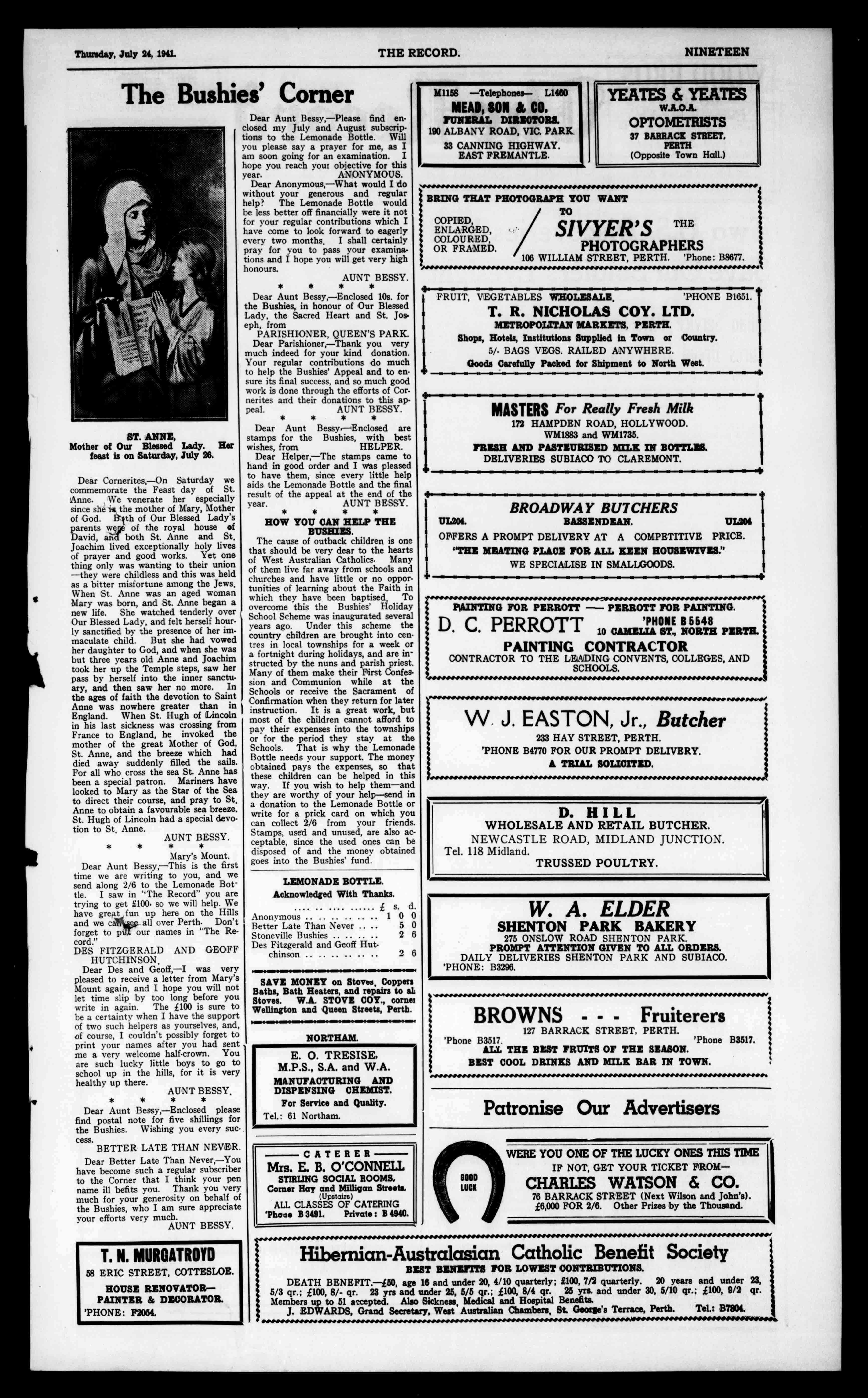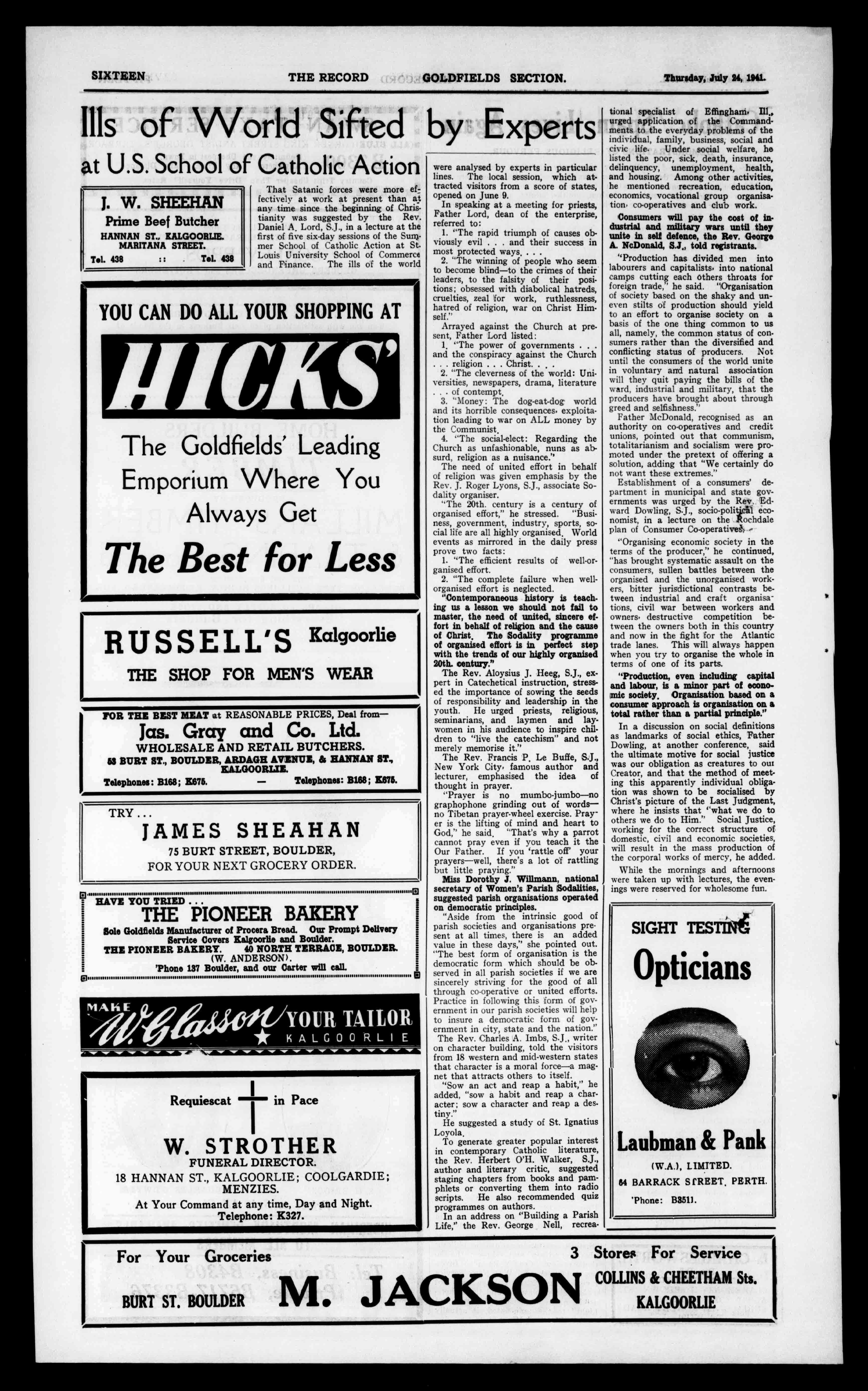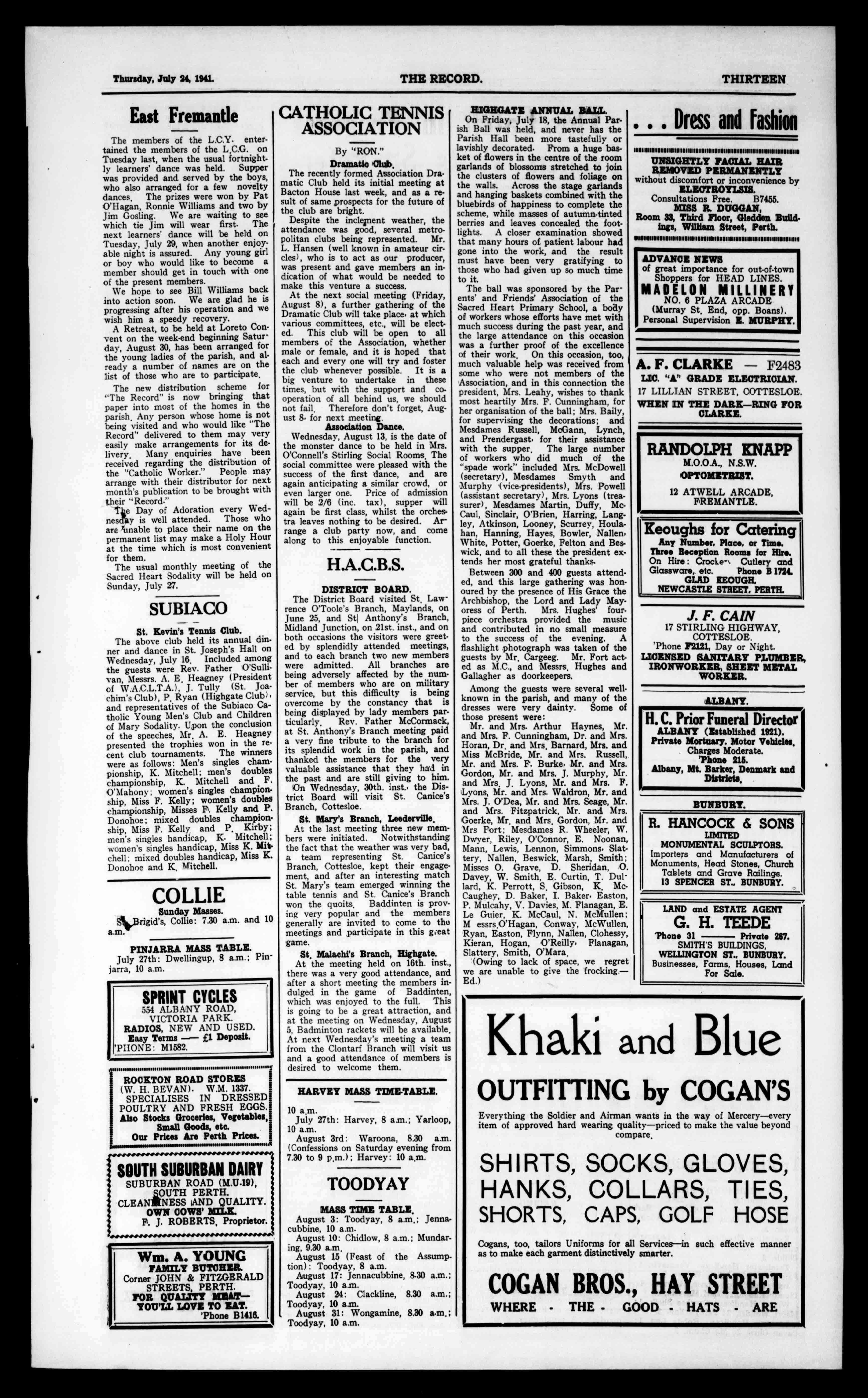 DISPENSINGCHEMIST. ForServiceandQuality. Tel.:61Northam. CATERER Mrs.E.B.O'CONNELL STIRLINGSOCIALROOMS, CornerHayandMilliganStreets, (UpstaIrs) ALLCLASSESOFCATERING 'PhoneB3491. Private:B4940. M1158-Telephones-L1460 MEAD,SON&CO. FUNERALDIRECTOR& 190ALBANYROAD,VIC.PARK 33CANNINGHIGHWAY. EASTFREMANTLE. YEATES&YEATES W.A.O.A. OPTOMETRISTS 37BARRACKSTREET, PERTH (OppositeTownHall.) BRINGTHATPHOTOGRAPHYOUWANT TO COPIED, ENLARGED, COLOURED, ORFRAMED. SIVYER'S PHOTOGRAPHERS 106WILLIAMSTREET,PERTH.'Phone:B8677. THE FRUIT,VEGETABLESWHOLESALE, 'PHONEB1651. T.R.NICHOLASCOY.LTD. METROPOLITANMARKETS,PERTH. Shops,Hotels,InstitutionsSuppliedinTownorCountry. 5/-BAGSVEGS.RAILEDANYWHERE. GoodsCarefullyPackedforShipmenttoNorthWest. MASTERSForReallyFreshMilk 172HAMPDENROAD,HOLLYWOOD. WM1883andWM1735. 'RuaANDPASTEURISEDMILKINBOTTLES. DELIVERIESSUBIACO'POCLAREMONT. BROADWAYBUTCHERS 17L204. BASSENDEAN. UL204 OFFERSAPROMPTDELIVERYATACOMPETITIVEPRICE. "THEMELTINGPLACEFORALLKEENHOUSEWIVES." WESPECIALISEINSMALLGOODS. 11.1111,111111.11111 PAINTINGFORPERROTT PERROTTFORPAINTING. D.C.PERROTT 'PHONE85548 10CAMELIAST.,NORTHPERTH. PAINTINGCONTRACTOR CONTRACTORTOTHELEADINGCONVENTS,COLLEGES,AND SCHOOLS. W.J.EASTON,Jr.,Butcher 233HAYSTREET,PERTH. 'PHONEB4770FOROURPROMPTDELIVERY. ATRIALSOLICITED. D.HILL WHOLESALEANDRETAILBUTCHER. NEWCASTLEROAD,MIDLANDJUNCTION. Tel.118Midland. TRUSSEDPOULTRY. W.A.ELDER SHENTONPARKBAKERY 275ONSLOWROADSHENTONPARK. PROMPTATTENTIONGIVENTOALLORDERSDAILYDELIVERIESSHENTONPARKANDSUBIACO. 'PHONE:B3296. BROWNS---Fruiterers 127BARRACKSTREET,PERTH. 'PhoneB3517 'PhoneB3517. ALLTHEBESTFRUITSOFTHESEASON. BESTCOOLDRINKSANDMILKBARTNTOWN. PatroniseOurAdvertisers WEREYOUONEOFTHELUCKYONESTHISTIME IFNOT,GETYOURTICKETFROMCHARLESWATSON&CO. 76BARRACKSTREET(NextWilsonandJohn's). 16,000FOR2/6.OtherPrizesbytheThousand. ....4,04.44.0.11411.414041, Hibernian-AustralasianCatholicBenefitSociety BESTBENEFITSFORLOWESTCONTRIBUTIONS. DEATHBENEFIT.-j50,age16andunder20,4/10quarterly;£100,7/2quarterly.20yearsandunder23, 5/3qr.;£100,8/-qr.23yrsandunder25,5/5qr.;£100,8/4qr.25yrs.andunder30,5/10qr.;f100,9/2qr. Membersupto51accepted.AlsoSickness,MedicalandHospitalBenefits. J.EDWARDS,GrandSecretary,WestAustralianChambers,St.Geode'sTerrace,Perth. Tel.:B7804.