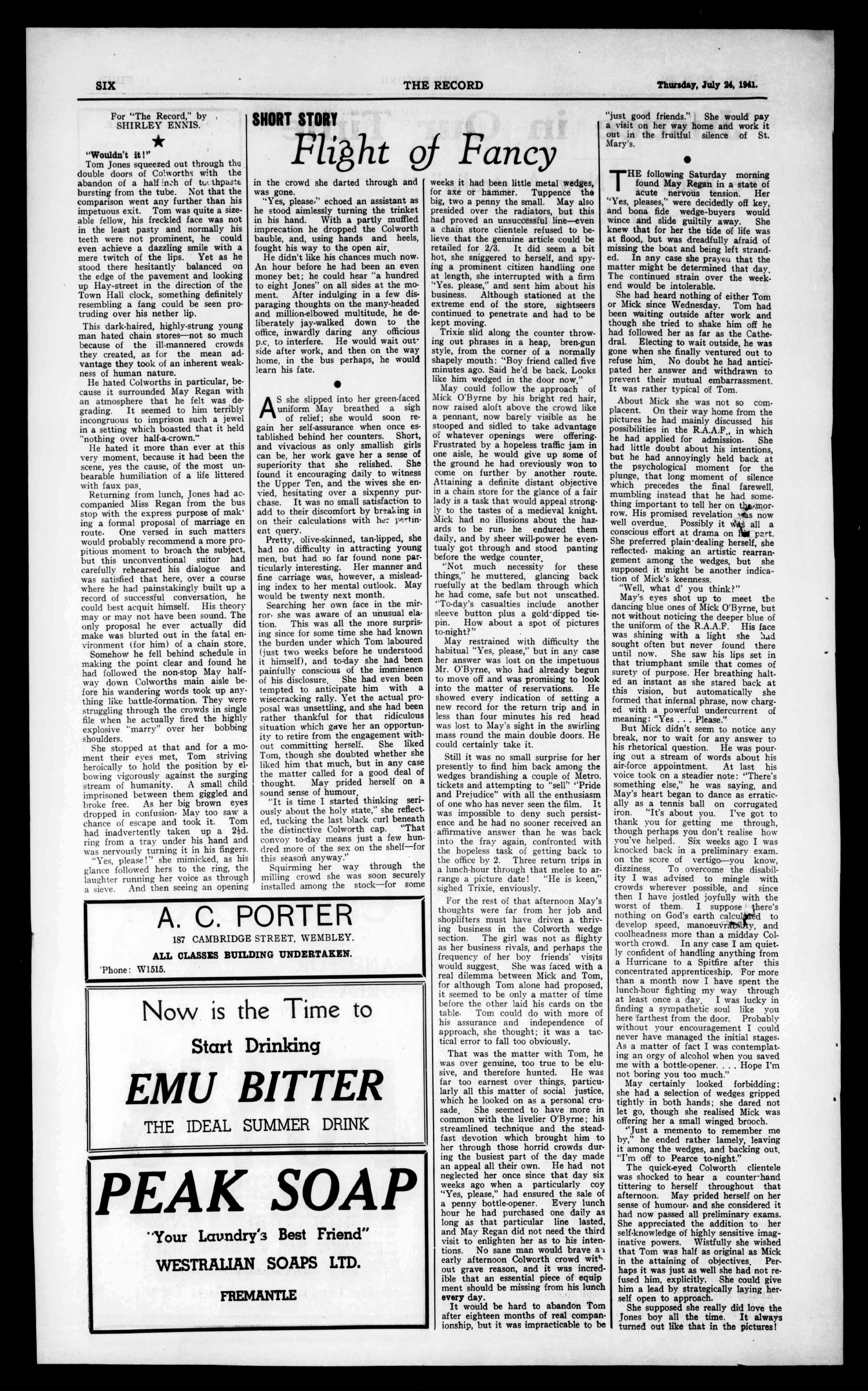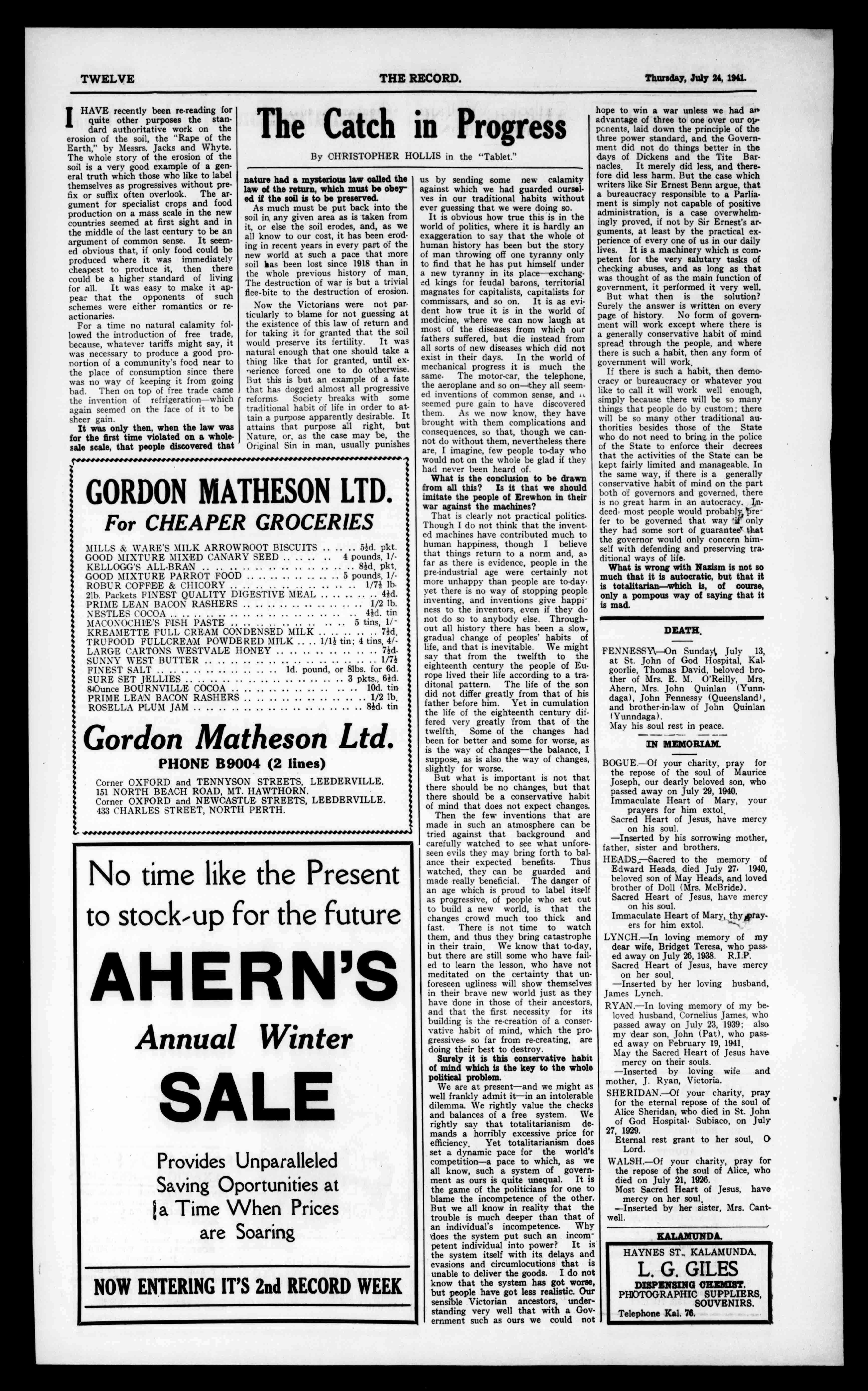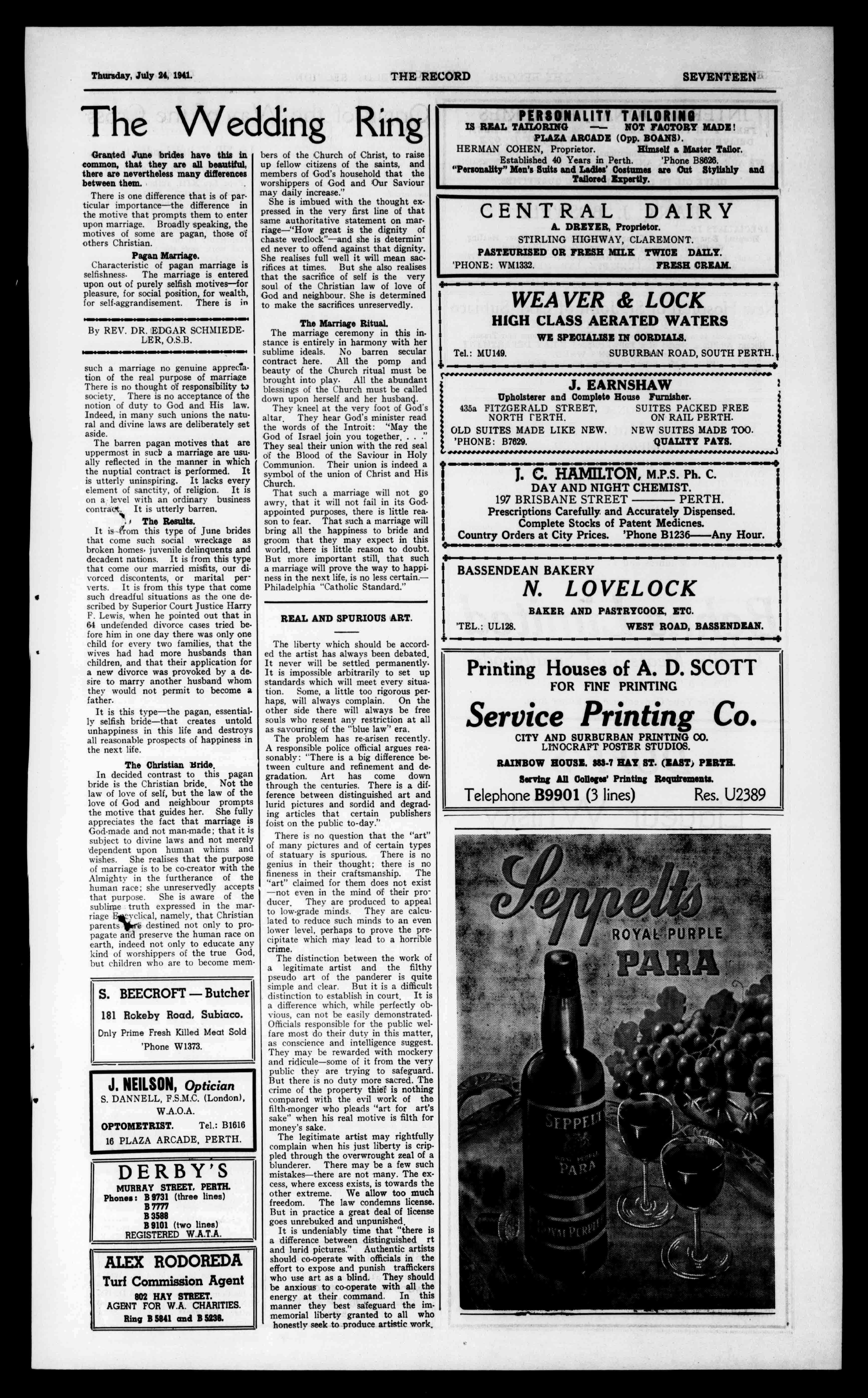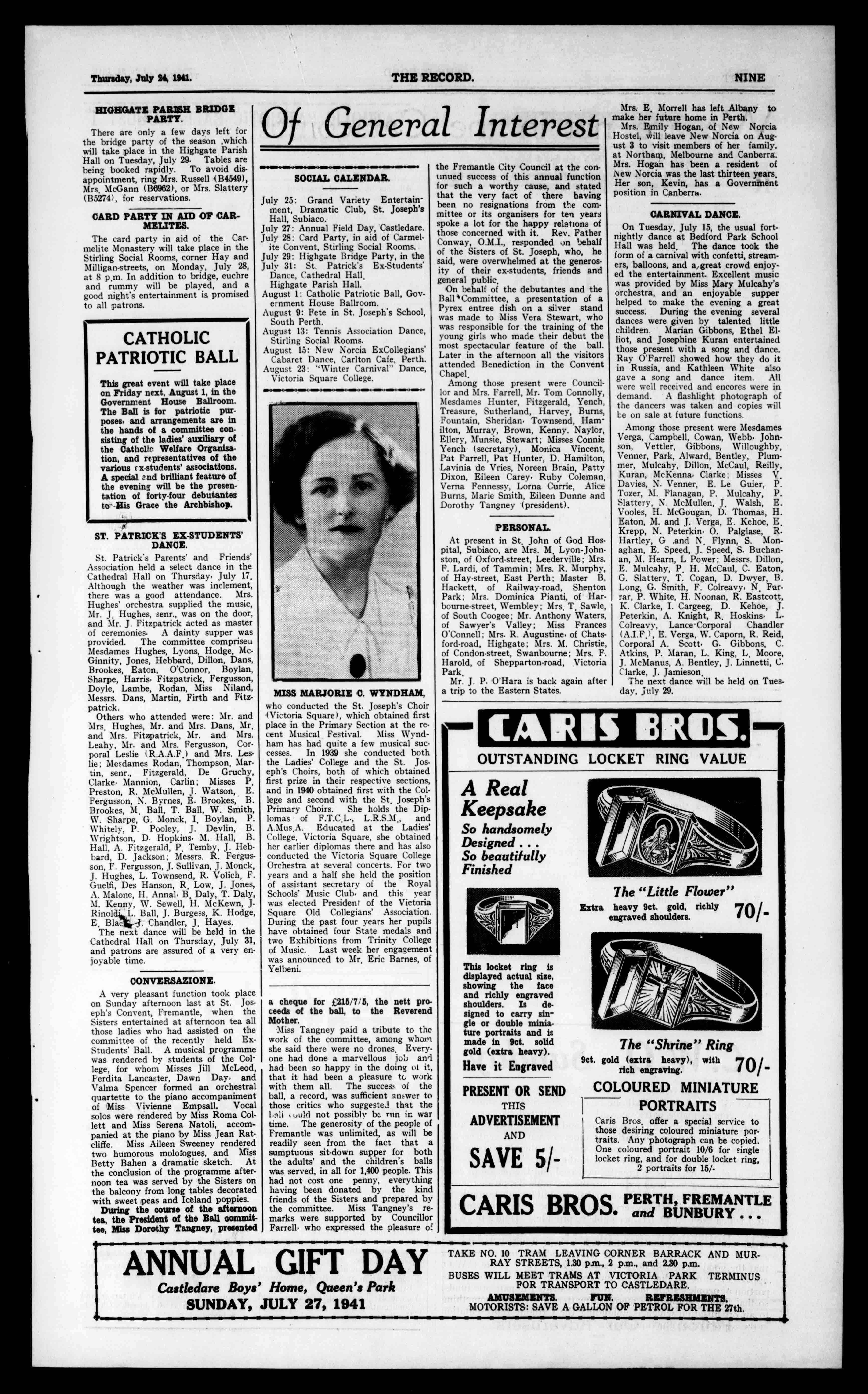 DISPENSINGCHEMIST. ForServiceandQuality. Tel.:61Northam. CATERER Mrs.E.B.O'CONNELL STIRLINGSOCIALROOMS, CornerHayandMilliganStreets, (UpstaIrs) ALLCLASSESOFCATERING 'PhoneB3491. Private:B4940. M1158-Telephones-L1460 MEAD,SON&CO. FUNERALDIRECTOR& 190ALBANYROAD,VIC.PARK 33CANNINGHIGHWAY. EASTFREMANTLE. YEATES&YEATES W.A.O.A. OPTOMETRISTS 37BARRACKSTREET, PERTH (OppositeTownHall.) BRINGTHATPHOTOGRAPHYOUWANT TO COPIED, ENLARGED, COLOURED, ORFRAMED. SIVYER'S PHOTOGRAPHERS 106WILLIAMSTREET,PERTH.'Phone:B8677. THE FRUIT,VEGETABLESWHOLESALE, 'PHONEB1651. T.R.NICHOLASCOY.LTD. METROPOLITANMARKETS,PERTH. Shops,Hotels,InstitutionsSuppliedinTownorCountry. 5/-BAGSVEGS.RAILEDANYWHERE. GoodsCarefullyPackedforShipmenttoNorthWest. MASTERSForReallyFreshMilk 172HAMPDENROAD,HOLLYWOOD. WM1883andWM1735. 'RuaANDPASTEURISEDMILKINBOTTLES. DELIVERIESSUBIACO'POCLAREMONT. BROADWAYBUTCHERS 17L204. BASSENDEAN. UL204 OFFERSAPROMPTDELIVERYATACOMPETITIVEPRICE. "THEMELTINGPLACEFORALLKEENHOUSEWIVES." WESPECIALISEINSMALLGOODS. 11.1111,111111.11111 PAINTINGFORPERROTT PERROTTFORPAINTING. D.C.PERROTT 'PHONE85548 10CAMELIAST.,NORTHPERTH. PAINTINGCONTRACTOR CONTRACTORTOTHELEADINGCONVENTS,COLLEGES,AND SCHOOLS. W.J.EASTON,Jr.,Butcher 233HAYSTREET,PERTH. 'PHONEB4770FOROURPROMPTDELIVERY. ATRIALSOLICITED. D.HILL WHOLESALEANDRETAILBUTCHER. NEWCASTLEROAD,MIDLANDJUNCTION. Tel.118Midland. TRUSSEDPOULTRY. W.A.ELDER SHENTONPARKBAKERY 275ONSLOWROADSHENTONPARK. PROMPTATTENTIONGIVENTOALLORDERSDAILYDELIVERIESSHENTONPARKANDSUBIACO. 'PHONE:B3296. BROWNS---Fruiterers 127BARRACKSTREET,PERTH. 'PhoneB3517 'PhoneB3517. ALLTHEBESTFRUITSOFTHESEASON. BESTCOOLDRINKSANDMILKBARTNTOWN. PatroniseOurAdvertisers WEREYOUONEOFTHELUCKYONESTHISTIME IFNOT,GETYOURTICKETFROMCHARLESWATSON&CO. 76BARRACKSTREET(NextWilsonandJohn's). 16,000FOR2/6.OtherPrizesbytheThousand. ....4,04.44.0.11411.414041, Hibernian-AustralasianCatholicBenefitSociety BESTBENEFITSFORLOWESTCONTRIBUTIONS. DEATHBENEFIT.-j50,age16andunder20,4/10quarterly;£100,7/2quarterly.20yearsandunder23, 5/3qr.;£100,8/-qr.23yrsandunder25,5/5qr.;£100,8/4qr.25yrs.andunder30,5/10qr.;f100,9/2qr. Membersupto51accepted.AlsoSickness,MedicalandHospitalBenefits. J.EDWARDS,GrandSecretary,WestAustralianChambers,St.Geode'sTerrace,Perth. Tel.:B7804.