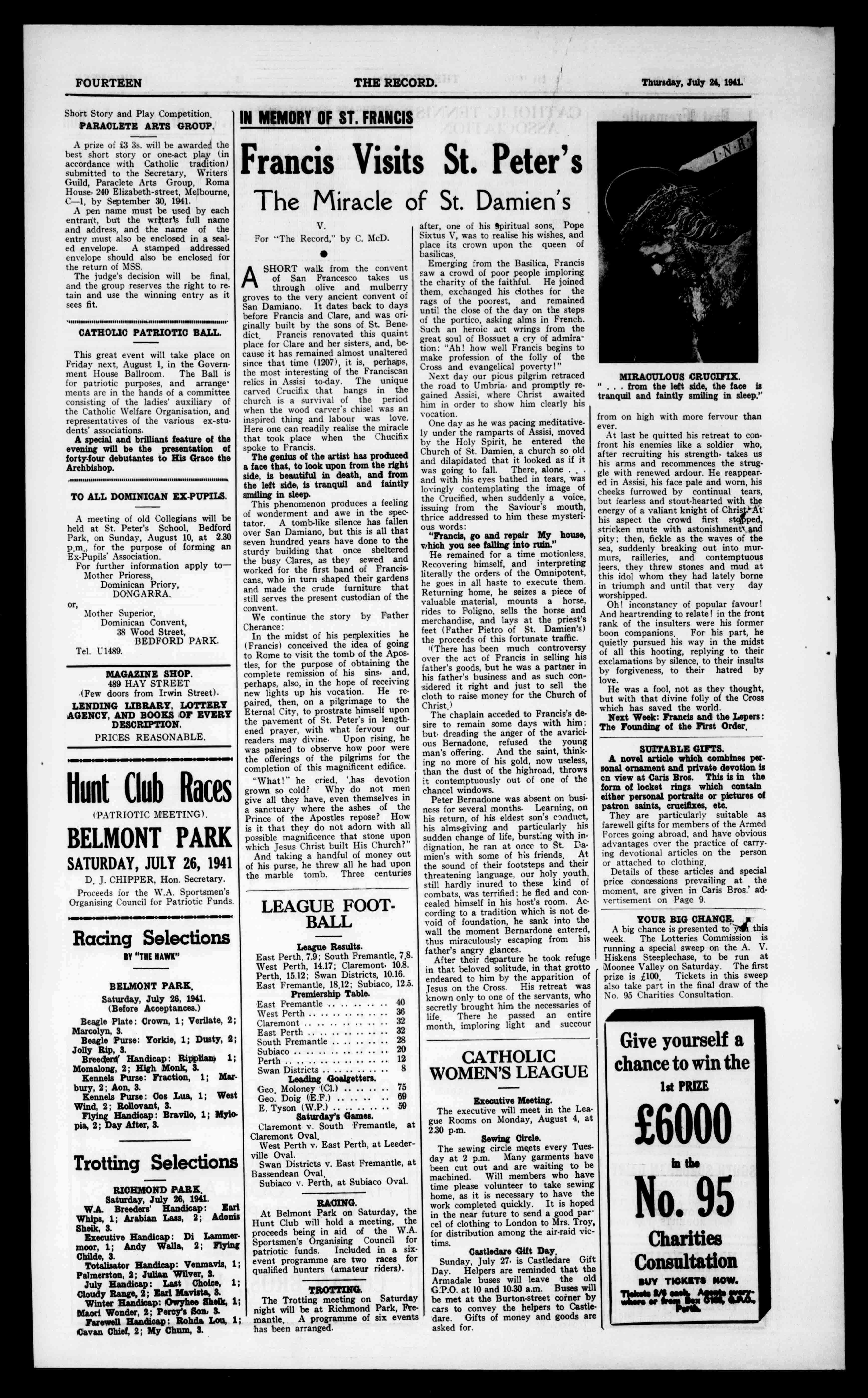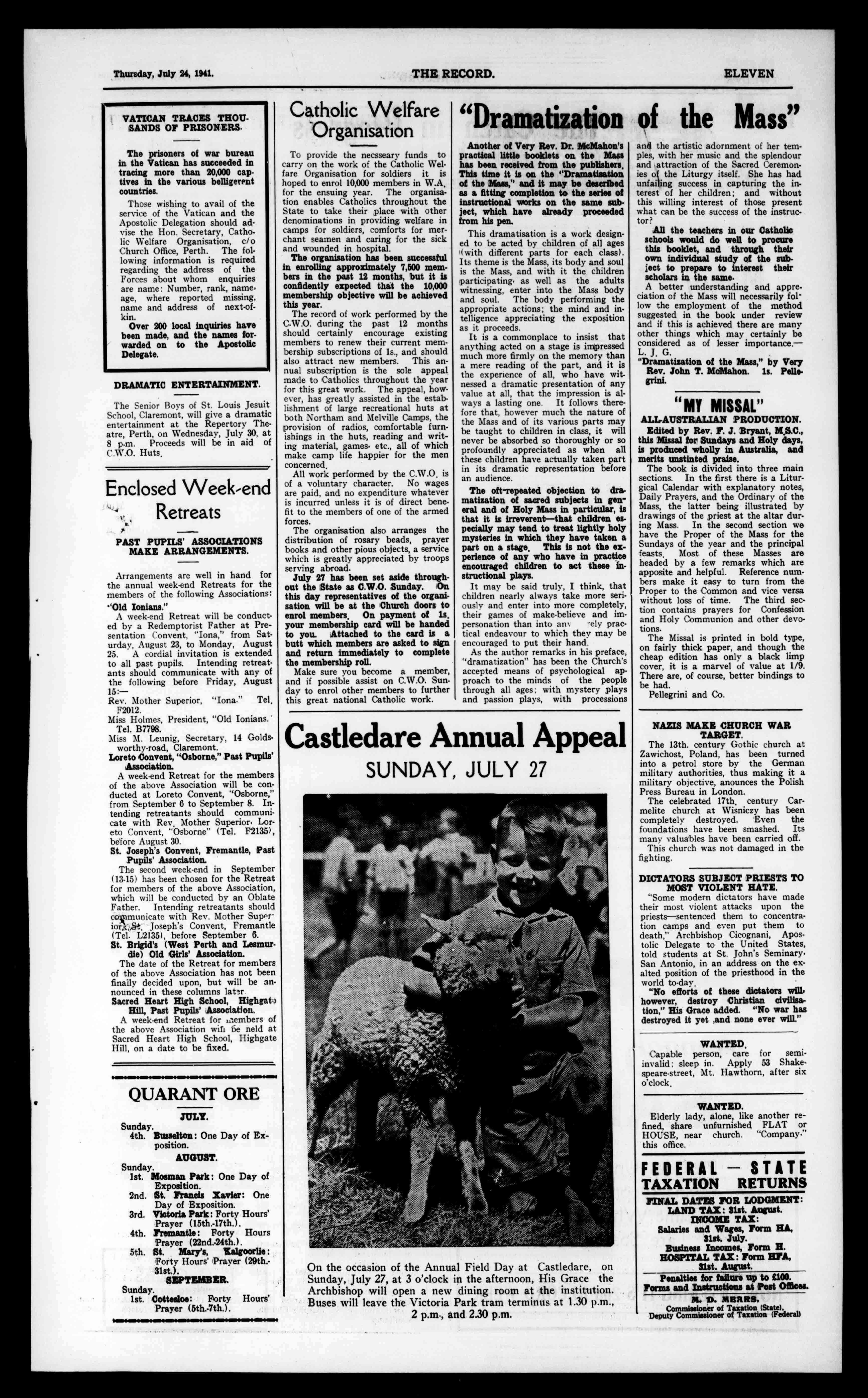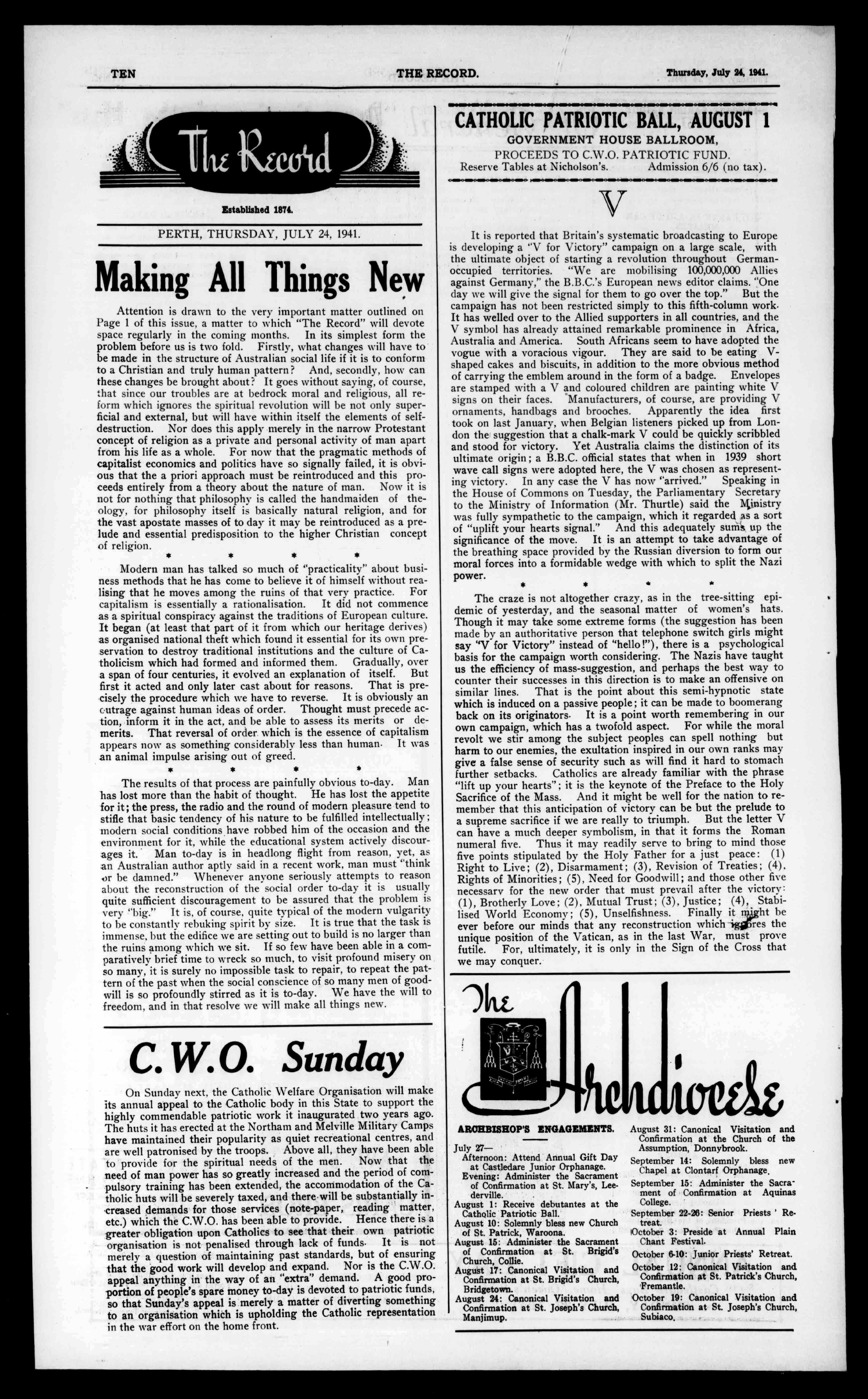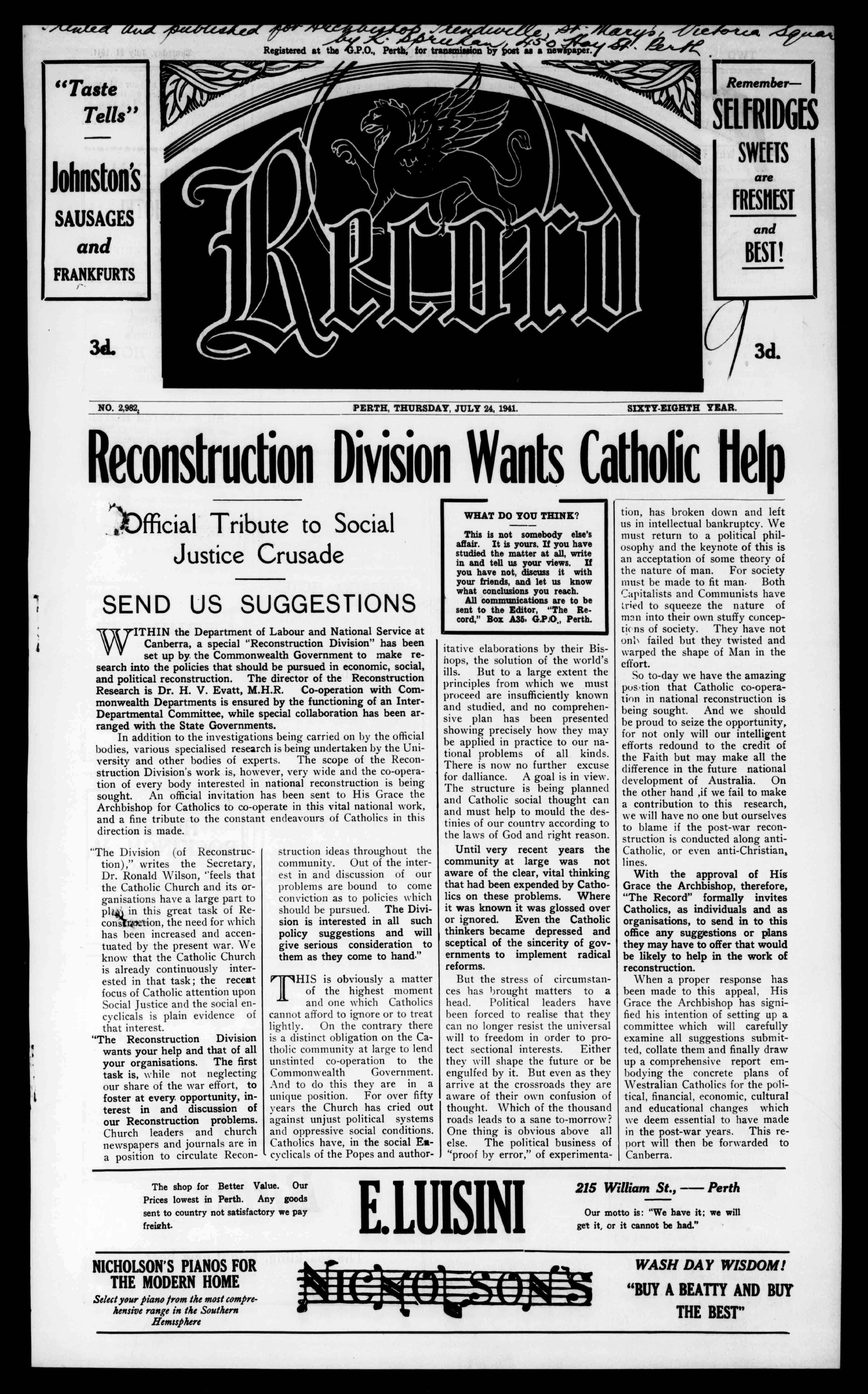 WiththeapprovalofHis GracetheArchbishop,therefore, "TheRecord"formallyinvites Catholics,asindividualsandas organisations,tosendintothis officeanysuggestionsorplans theymayhavetoofferthatwould belikelytohelpintheworkof reconstruction.