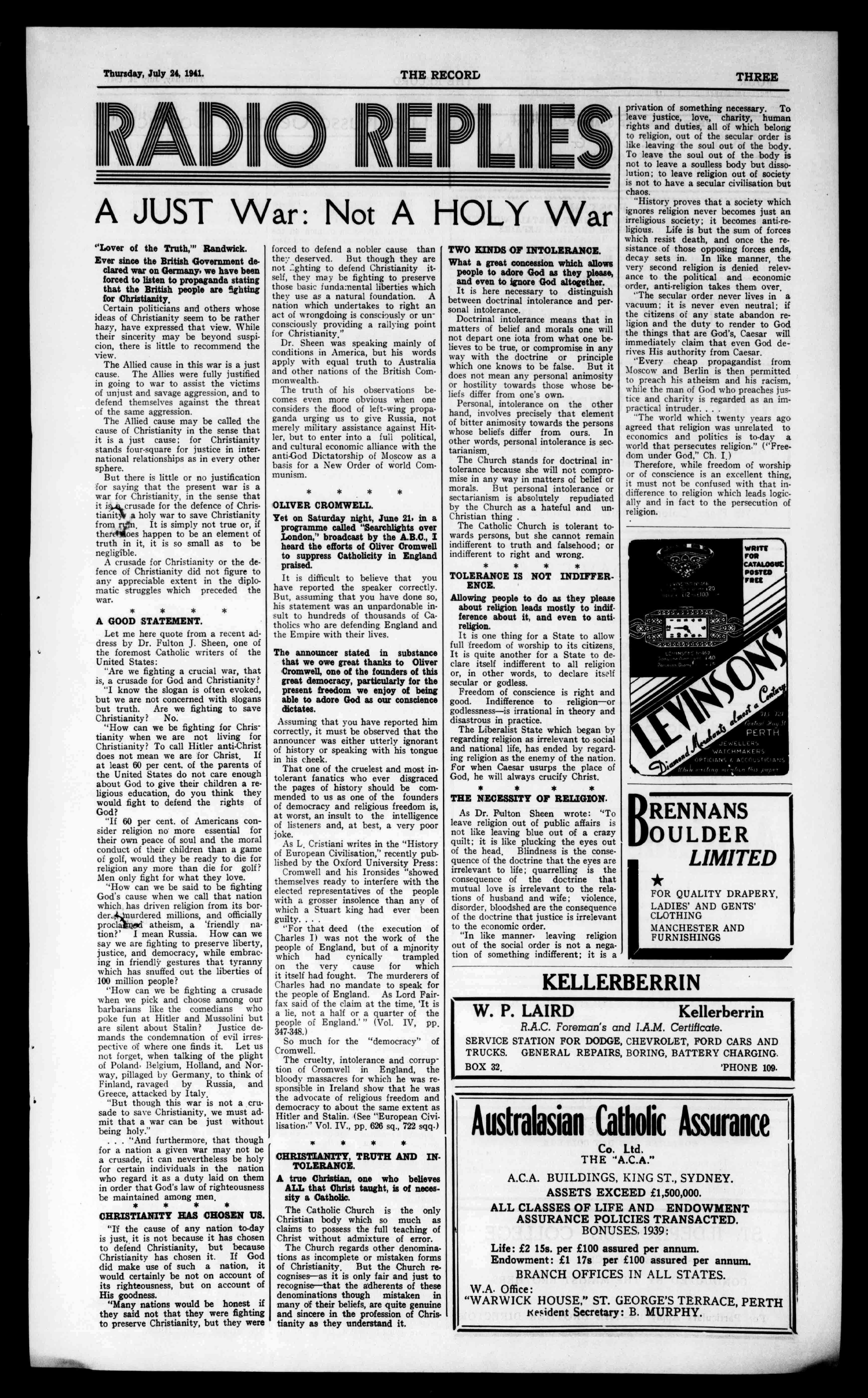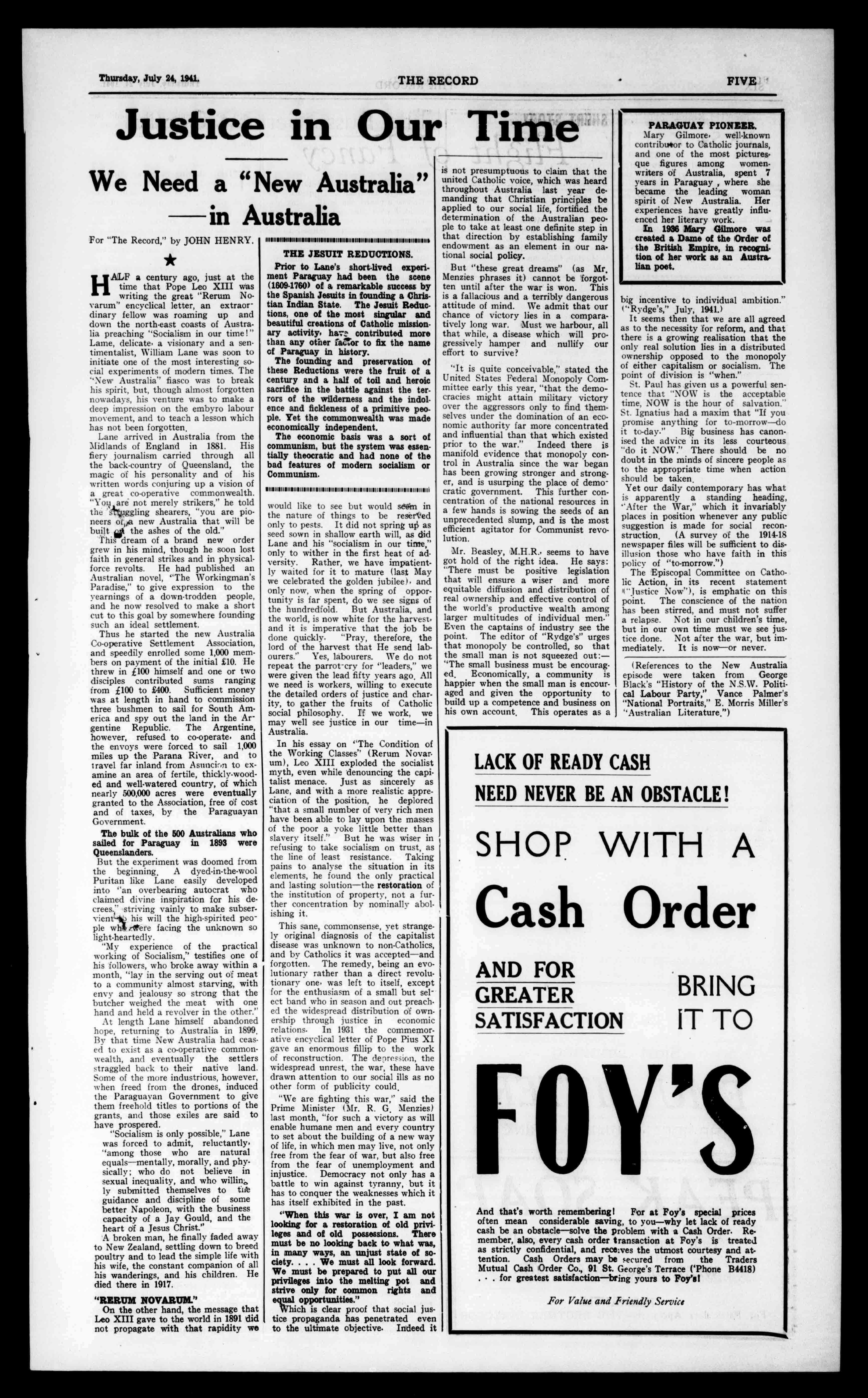 HISisobviouslyamatter ofthehighestmoment andonewhichCatholics casnotaffordtoignoreortotreat lightly.Onthecontrarythere isadistinctobligationontheCatholiccommunityatlargetolend unstintedco-operationtothe Commonwealth Government. Andtodothistheyareina uniqueposition.Foroverfifty yearstheChurchhascriedout againstunjustpoliticalsystems andoppressivesocialconditions. Catholicshave,inthesocialEacyclicalsofthePopesandauthor-