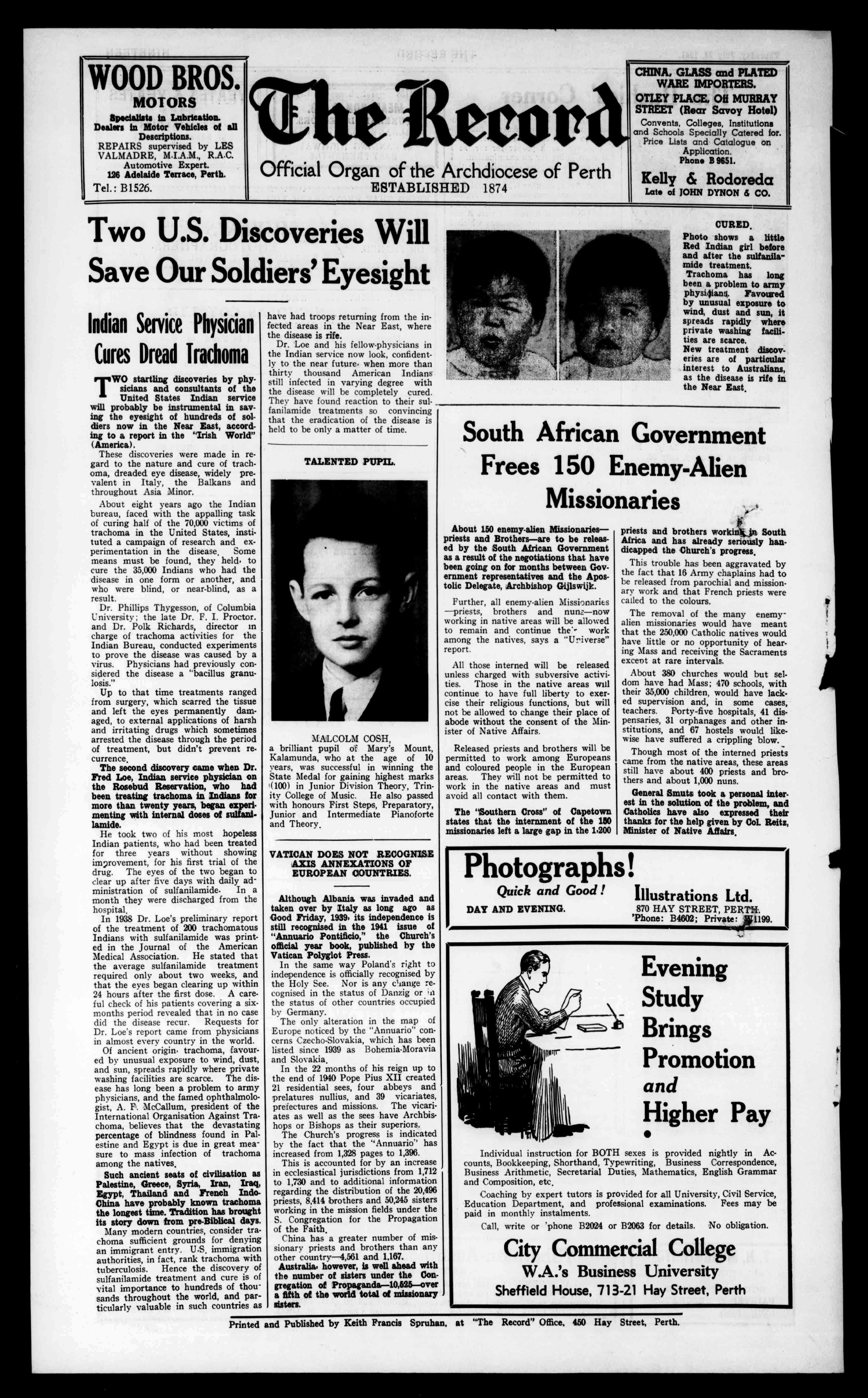 WOODBROS. MOTORS lipacialistsinLubrication. DealersinMotorVehiclesofall Descriptions. REPAIRSsupervisedbyLES VALMADRE,M.I.A.M.,R.A.C. AutomotiveExpert. 126AdelaideTerrace,Perth. Tel.:B1526. OfficialOrganoftheArchdioceseofPerth ESTABLISHED1874 CHINA,GLASSandPLATED WAREIMPORTERS. OTLEYPLACE,OffMURRAY STREET(RearSavoyHotel) Convents,Colleges,Institutions andSchoolsSpeciallyCateredfor. PriceListsandCatalogueon Application. PhoneB9651. Kelly&Rodoreda LateofJOHNDYNON&CO. TwoU.S.DiscoveriesWill SaveOurSoldiers'Eyesight IndianServicePhysician CuresDreadTrachoma TWOstartlingdiscoveriesbyphysiciansandconsultantsofthe UnitedStatesIndianservice willprobablybeinstrumentalinsavingtheeyesightofhundredsofsoldiersnowintheNearEast,accordingtoareportinthe"IrishWorld" (America). Thesediscoveriesweremadeinregardtothenatureandcureoftrachoma,dreadedeyedisease,widelyprevalentinItaly,theBalkansand throughoutAsiaMinor.