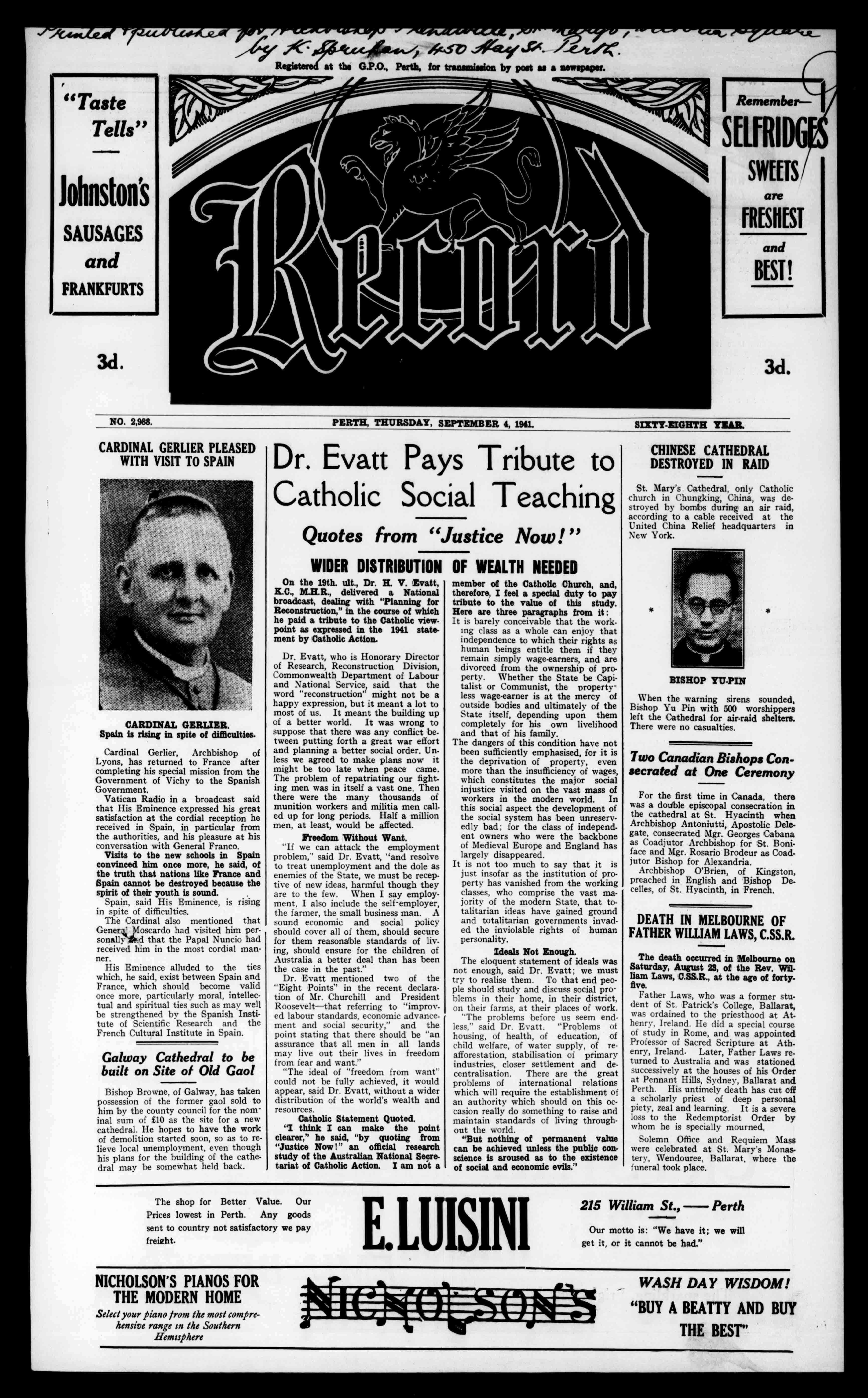 Onthe19th.ult.,Dr.H.V.Evatt, B.C.,M.H.R.,deliveredaNational broadcast,dealingwith"Planningfor Reconstruction,"inthecourseofwhich hepaidatributetotheCatholicviewpointasexpressedinthe1941statementbyCatholicAction.