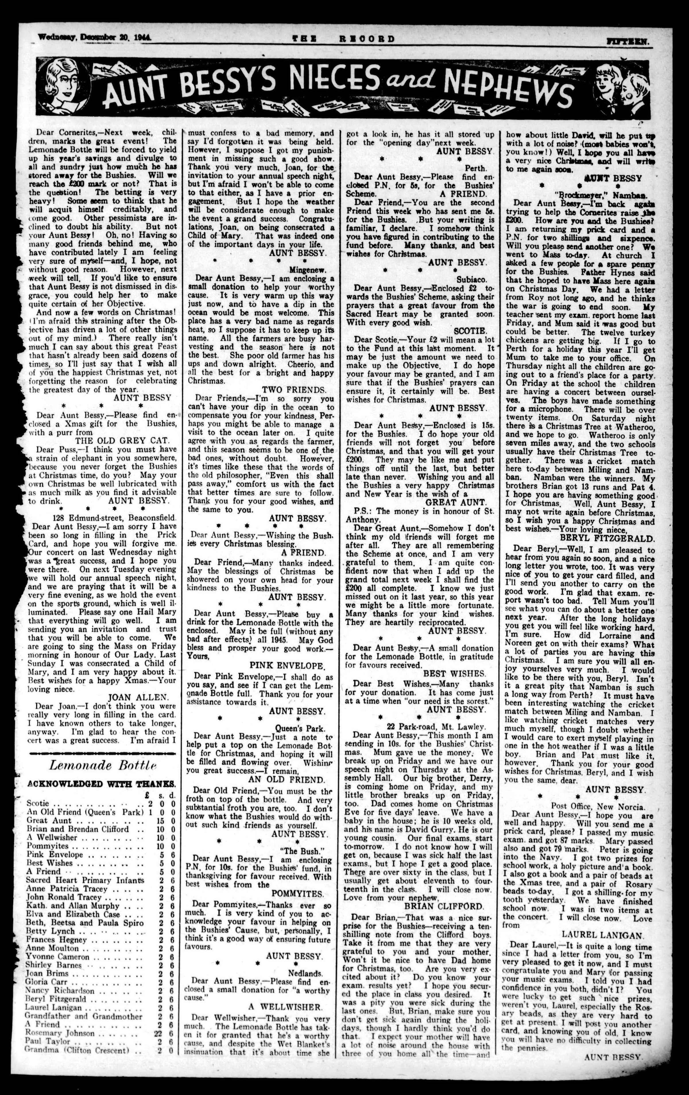 Dear Aunt easy,—I'm back aga'hs trying to help the Cornerites raisejhe £200. Howareyouand the Bushies? Iam returning my prick card and a P.N. for two shillings and sixpence. Will youpleasesendanotherone? We went to Mass today. At church I asked afew people for aspare penny for the Bushies. Father Hynes said thathehoped tohaveMasshere agaif on Christmas Day, We had aletter from Roy not long ago, and he thinks the war is going to and soon. My teachersentmyexam.reporthomelast Friday, and Mumsaidit wasgoodbut could be better. The twelve turkey chickens are getting big. If Igo to Perth for aholiday this year I'll get Mum to take me to your office. On Thursday nightall thechildren are going out to afriend's place for aparty. On Friday at the school the children are having aconcert between ourselves. The boys have made something foramicrophone. There will be over twenty items. On Saturday night there itaChristmasTreeat Watheroo, andwehope to go. Watheroo isonly seven miles away, and the two schools usually have their Christmas Tree together. There was acricket match here to-day between Miling and Nam. ban. Nambanwere the winners. !My brothers Briangot 13 runs and Pat 4. Ihope youarehavingsomethinggood , for Christmas, Well, Aunt Bessy, I may not write again before Christmas, so Iwish you ahappy Christmas and best wishes.—Yourloving niece,