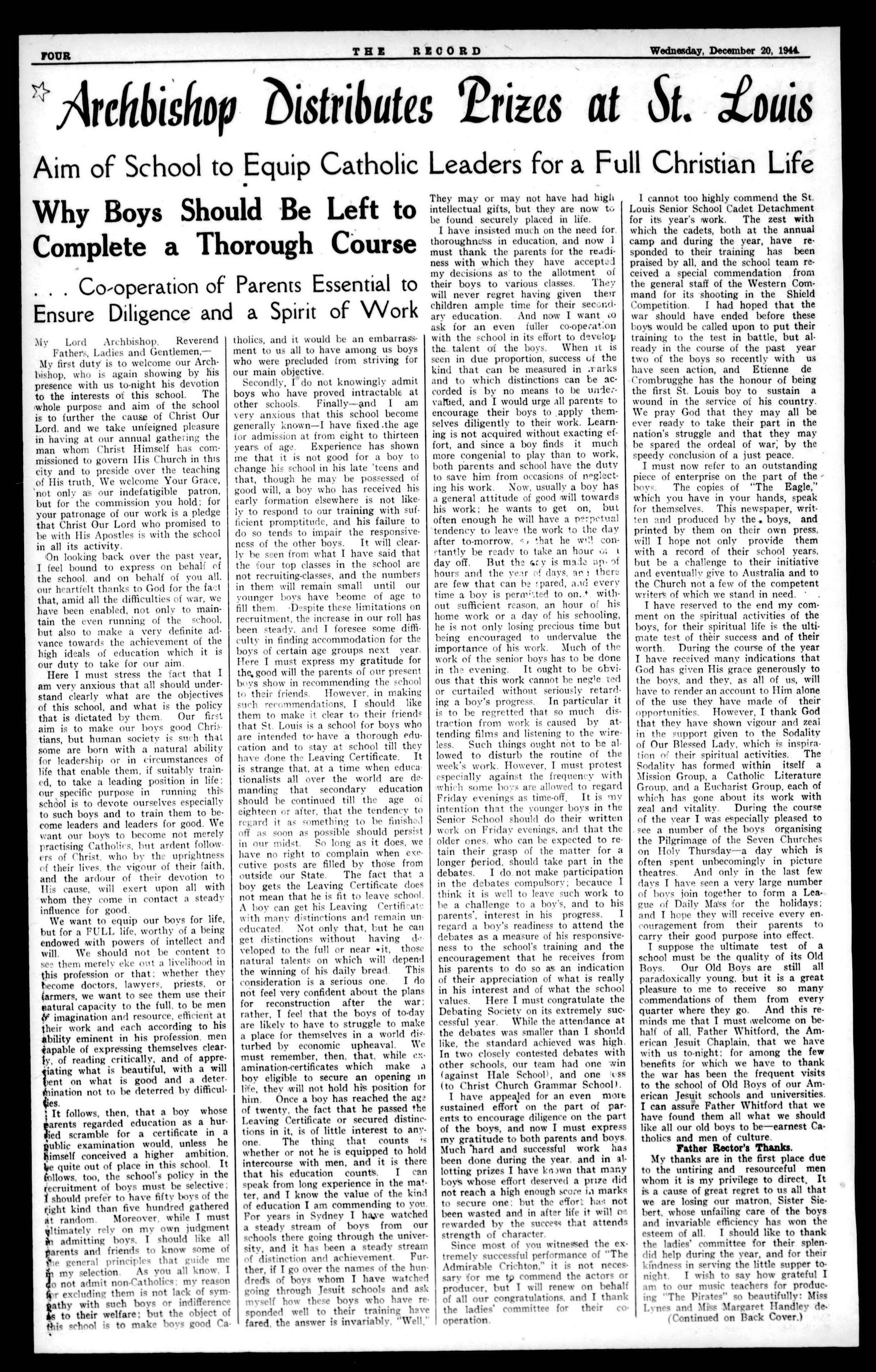 Finally, if Iforesee difficult times ahead, Iam confident that, if these boys are loyal to their Catholic faith and draw from it courage and inspira. tion to face the struggle, they will succeed, succeed not only in the struggle to make alivelihood and secure earthIv success, but in the struggle to use their lives for the purpose for which they received them. Ihope, too, that' when the time comes for them to take partinourcivic life they willbe found asteady influence for good. And, Your Grace, Ihope that they will be prominent in their support of all the good works you are directing in this city: for the cure for all the evils to which our age is subject lies in the message that God has commissioned you to impart. Whatever be their fortune in years to come, nothing can take from them their Catholic Faith, and while they are loyal to that they cannot fail in accomplishing the purpose of their lives.
