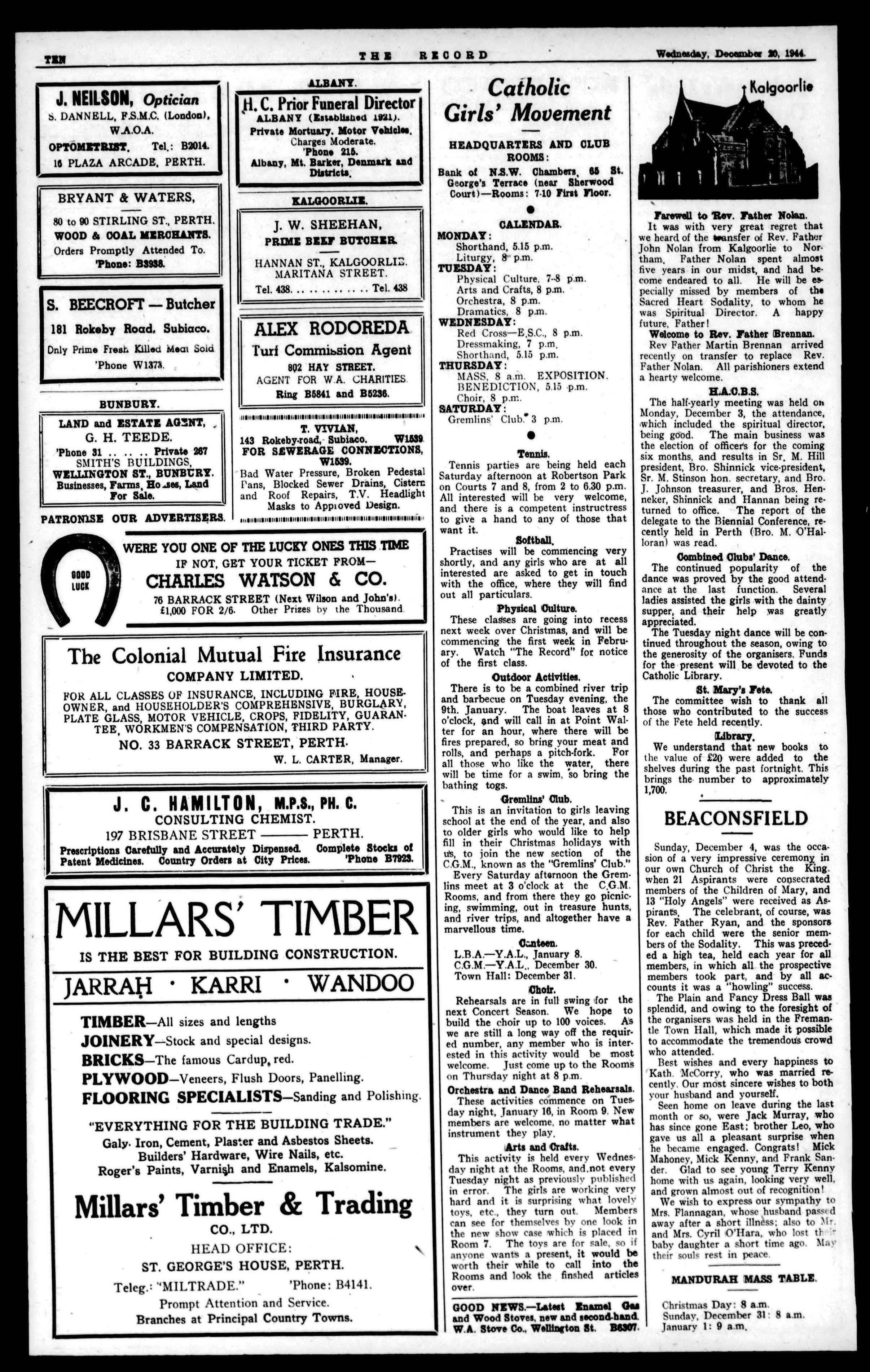MAKE— W e Glasson YOUR TAILOR KAL000RLIE RU'SSELL'S 8algoorlie' THE SHOP FOR MEN'S WEAR FOR THE BESTMEATat REASONABLE PRICES,Deal from— . lass Gray and Co. Ltd. WHOLESAL';AND RETAILBUTCHERS. . W BURT ST, BOULD .R, ARDAGHAVBNIIE, « 8ARRASAT, LALOOORLIL Telephones:B166;K676. — Telephoaa:13166; EM. i GENERAL DRAPERS. "The House of Quality." • wrOF s MEN'S OUTFITTERS. Requiescat / 11 in Pace W. STROTHER FUNERALDIRECTOR. 18 HANNAN ST., KALGOORLIE; COOLGARDIE; MENZIES. At Your Command at any time,DayandNight. Telephone:KMWV. INTERNATIONAL FISHERIES FRESH FISH TWICE DAILY. 151 BARRACKBTREET. DELIVERIES ANYWHERE. PHONE .B2974 Suppliers to Hospitals,Educational and Religion Inatitudoms. WE ARE THE OLDEST AND LARGEST FISH DISTRIBUTORS IN WESTERN AUSTRALIA. FRESH ROASTED POULTRY. DRAFFEN'S BUTCHERS SUCCESSORS TO BERN'S. . 'PHONE: B7708. QUALITY MEATS AND SMALLGOODS. TWO BIG BARRACK STREET STORES. COUNTRY CLIENTS SPECIALLYCATERED FOR. t 6 Printed and Published by Keith Francis Spruhan,at "The Record"Office,450 Hay Street,Perth.