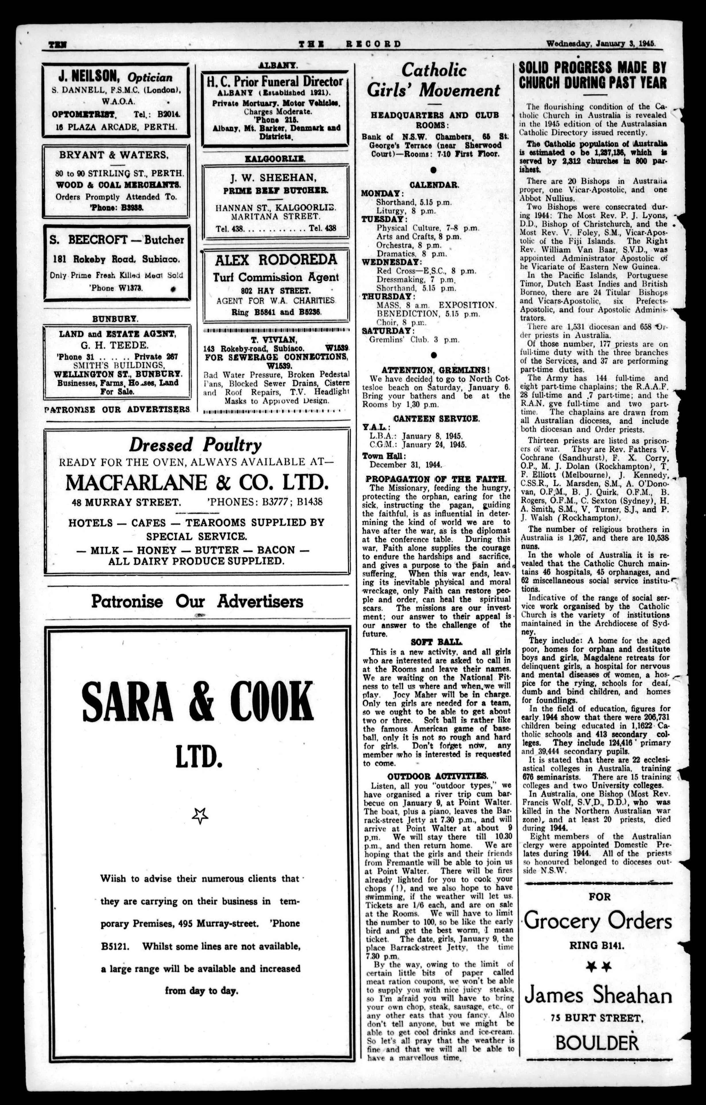 CONSULT ... with, our ADVERTISERS -for all yourREQUIREMENTS Che Record Official Organof theArchdioceseofPerth ESTABLISHED, 1874 0 % 1AWTED OTLEYPLACE,OilMURRAV STREET(BearSavoyHotel) Convents,Colleges,Inatitutlone and Schools Specially Catered lot Price Lists and Catalogue on Application. Phone S9651. Kelly &. Rodoreda Late of IOHN DYNON ACO.