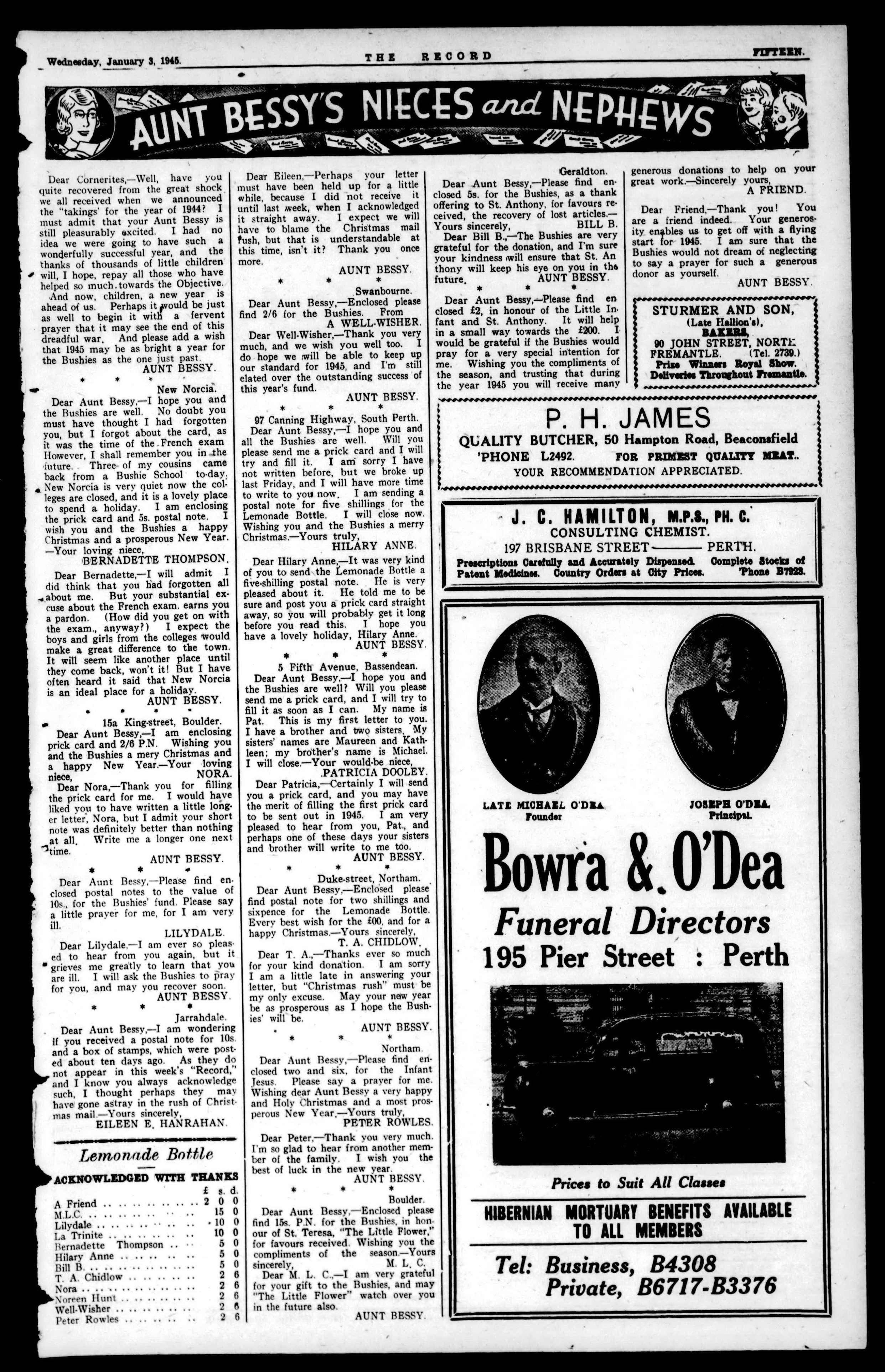YOUCAN DOALLYOURSHOPPINGAT the GOLDFIELDS' LEADING EMPMIUM where you always get THE BEST OF "SERVICE MNMIMNNNININ.•IW,✓r•NI•• •IW••.,l MAKE— We ` GlasSon YOUR TAILOR KALG00RLIE RUSSELL j Kalgoorlie THE SHOP FOItMEN'S WEAR FOR THE BESTMEAT at REASONABLE PRICES,Dealfrom— Jas. Gray. and Co. Ltd. WHOLESAL',ANDRETAILBUTCHERS. HBURTST.,BOULD R,!RDAOHAVENUA AHANNANST, KALGOORLIL Telephones;DIU; K676. — Telephones:DIU;KWA. GENERAL DRAPERS. "The Houseof Quality." 's MEN'S OUTFITTERS. t Requiescat11/inPace W. STROT14ER FUNERALDIRECTOR. 18HANNANST.,KALGOORLIE;COOLGARDIE; MENZIES. At YourCommand at any time,DayandNight. Telephone:K527. IINTERNATIONAL FISHERIES FRESH FISHTWICE DAILY. 151 BARRACKSTREET. DELIVERIES ANYWHERE. PHONE82974 Suppliers to Hospitals,Educational and Religious ImUtutions. WE ARETHEOLDEST AND LARGESTFISH DISTRIBUTORSIN WESTERN AUSTRALIA. FRESH ROASTEDPOULTRY. DRAFFEN'S BUTCHERS SUCCESSORSTOBEHN'S. 'PHONE:B7708. QUALITYMEATSANDSMALLGOODS. TWOBIGBARRACKSTREETSTORES. COUNTRYCLIENTSSPECIALLYCATEREDFOR. Printed and Published by Keith Francis Sprulm,at "The Record"Office, 450 Hay Street, Perth.
