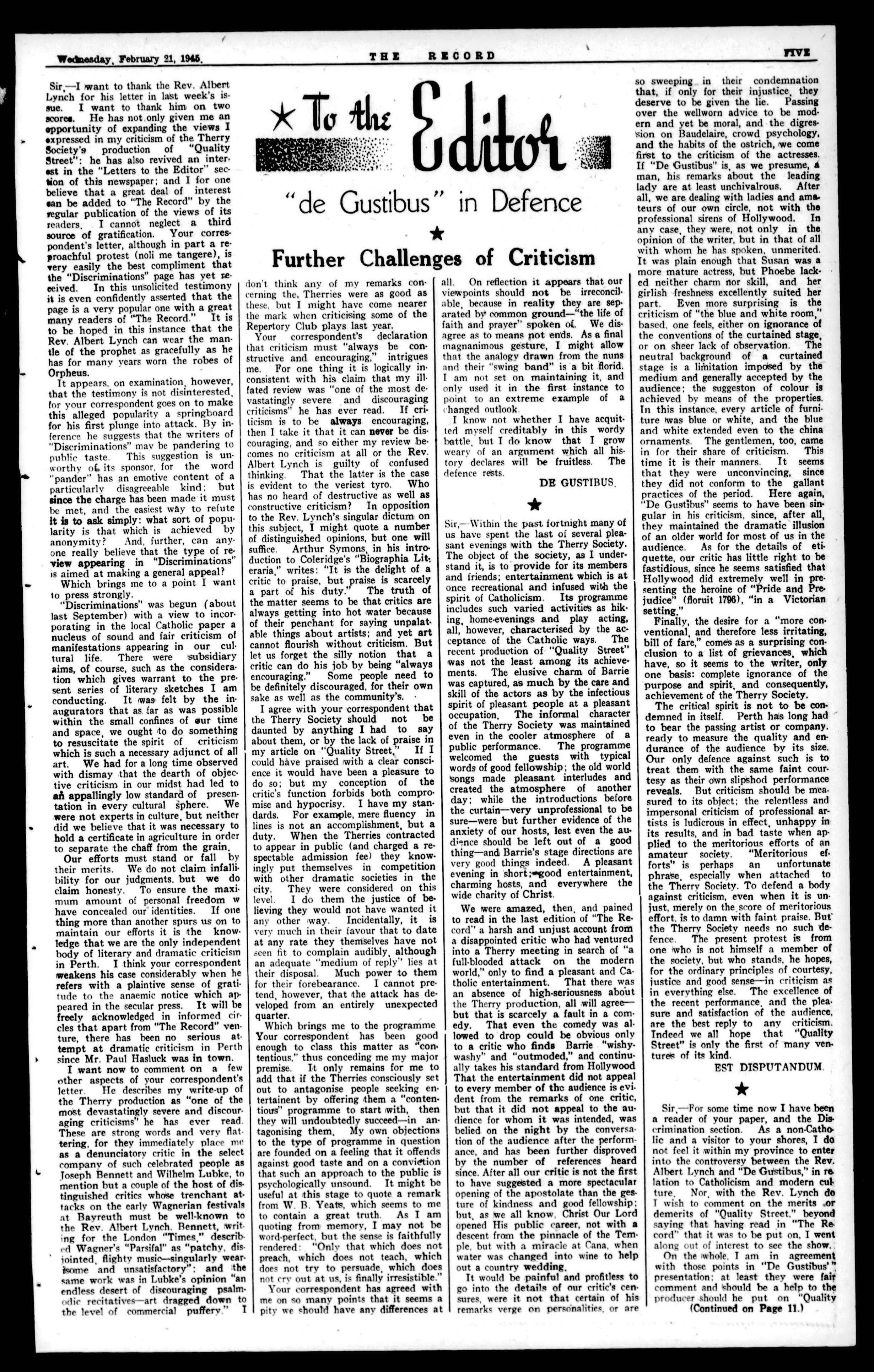 TWO TH! RECORD Wednn•dav, Febsom 21. IS48. -*The Catholic Answer CEVERY SUNDAY EVENING FROM 9 P.M.