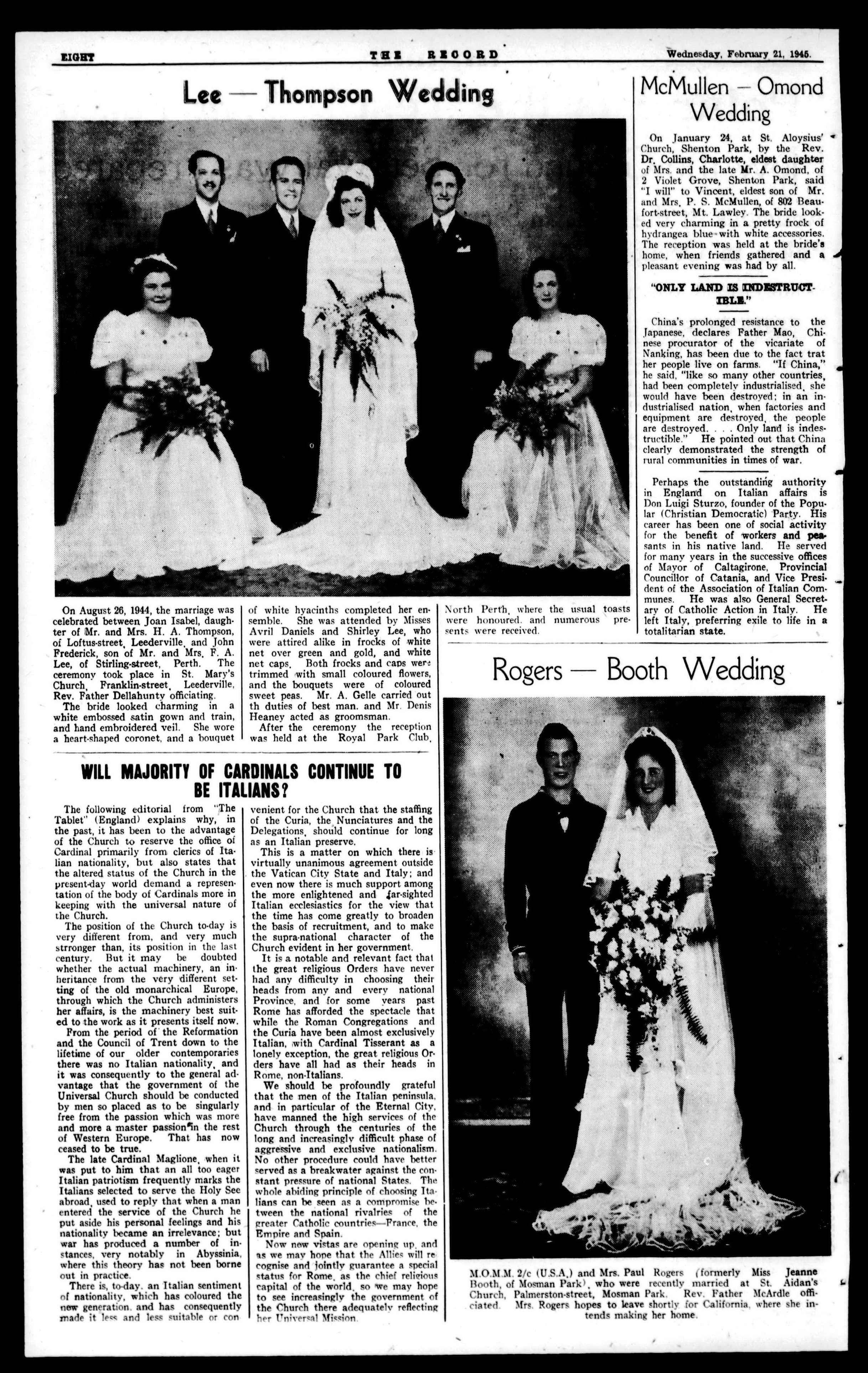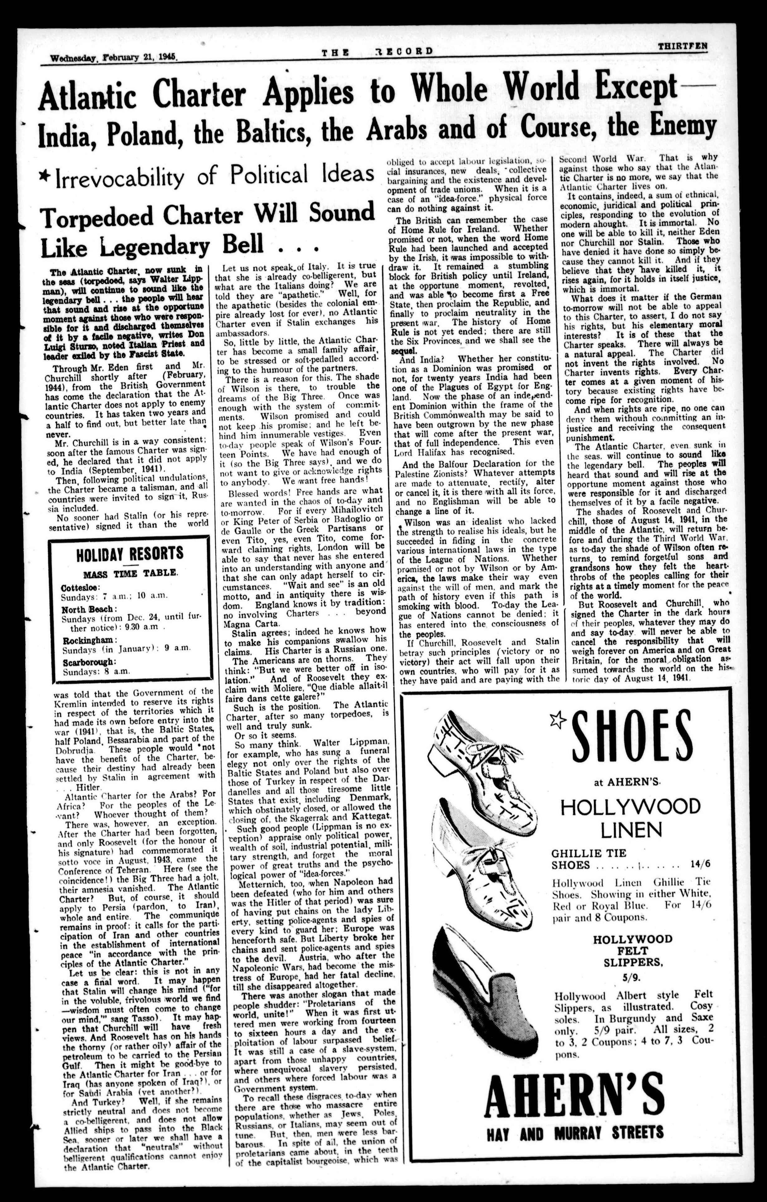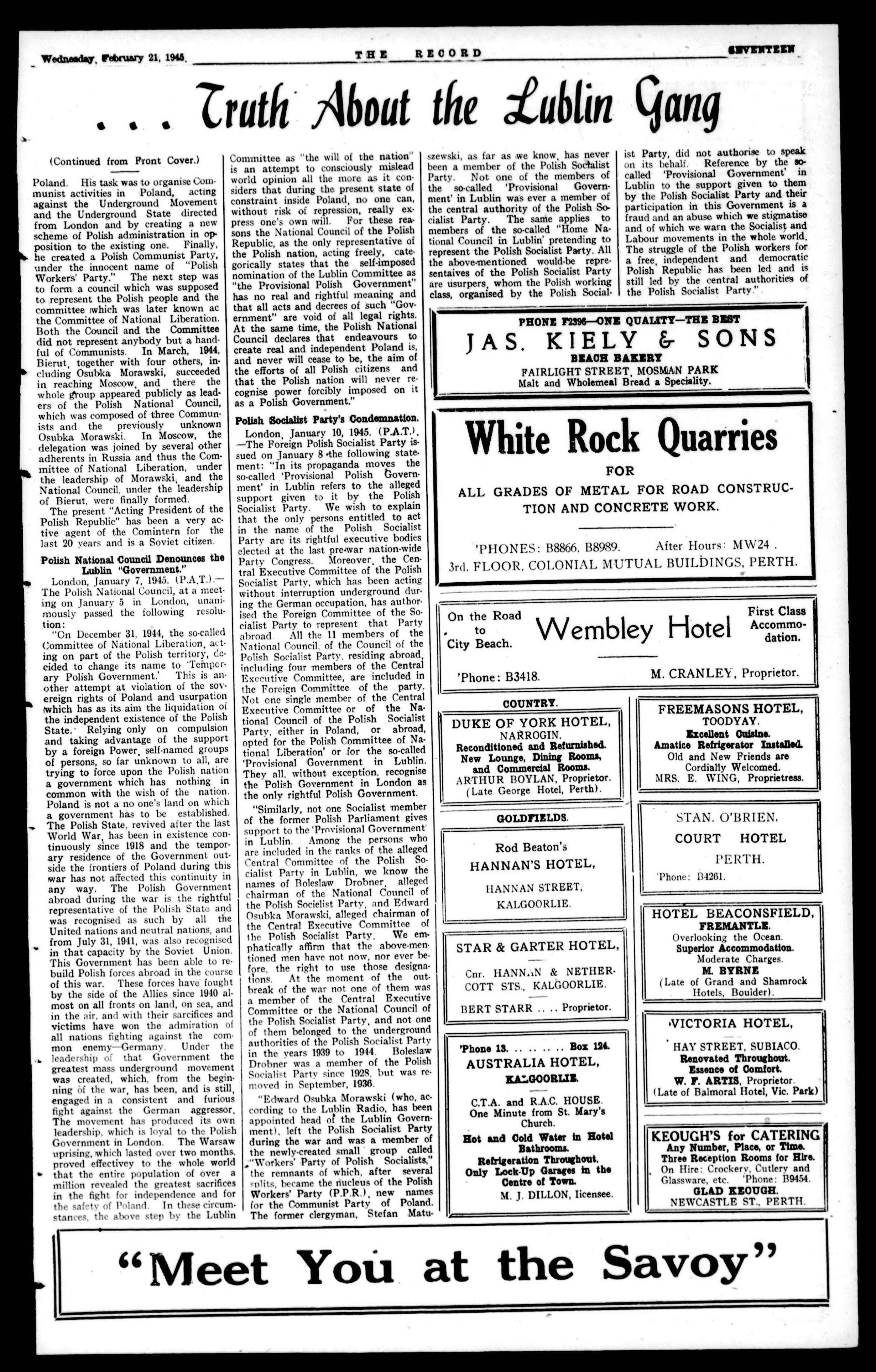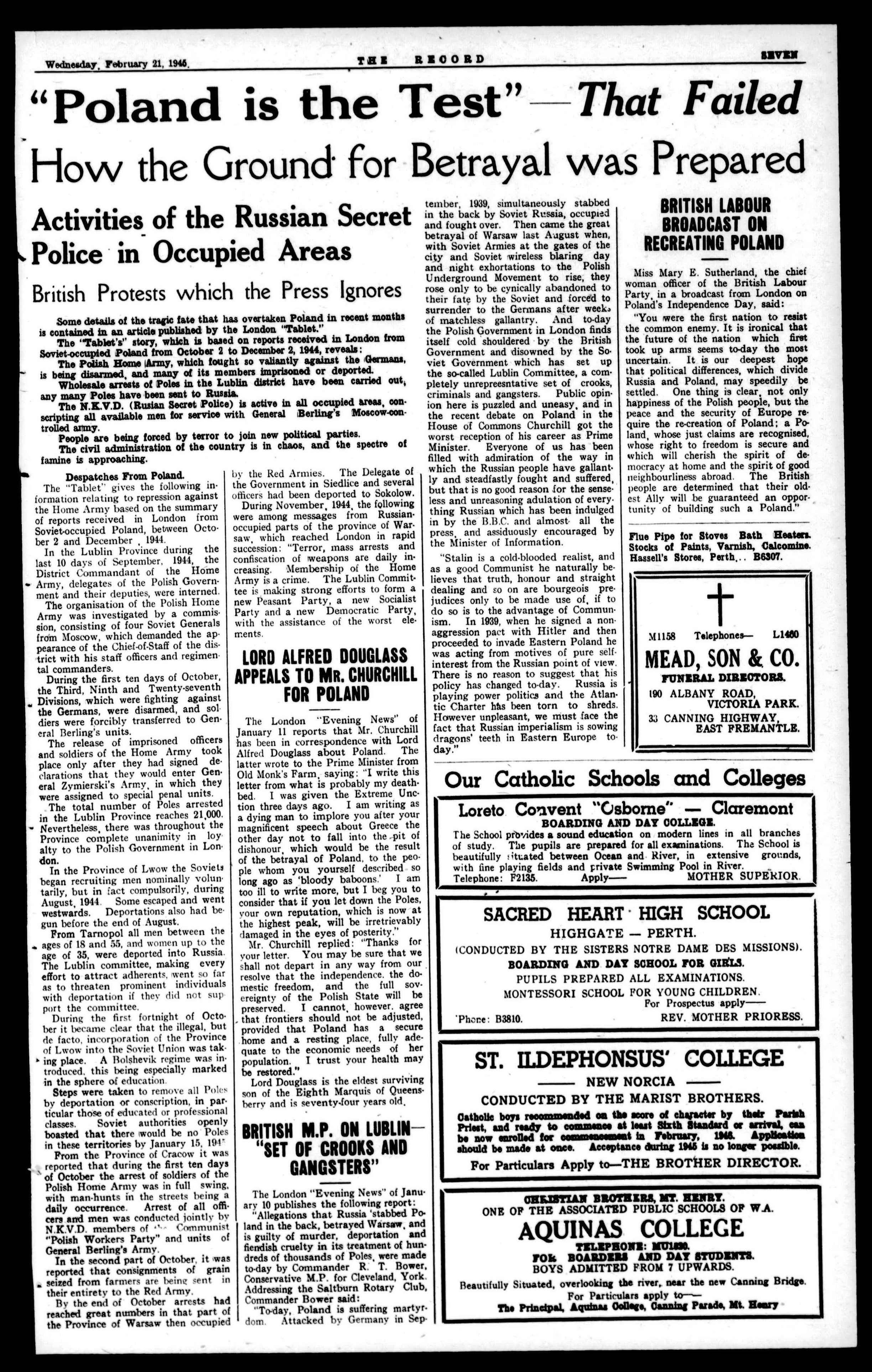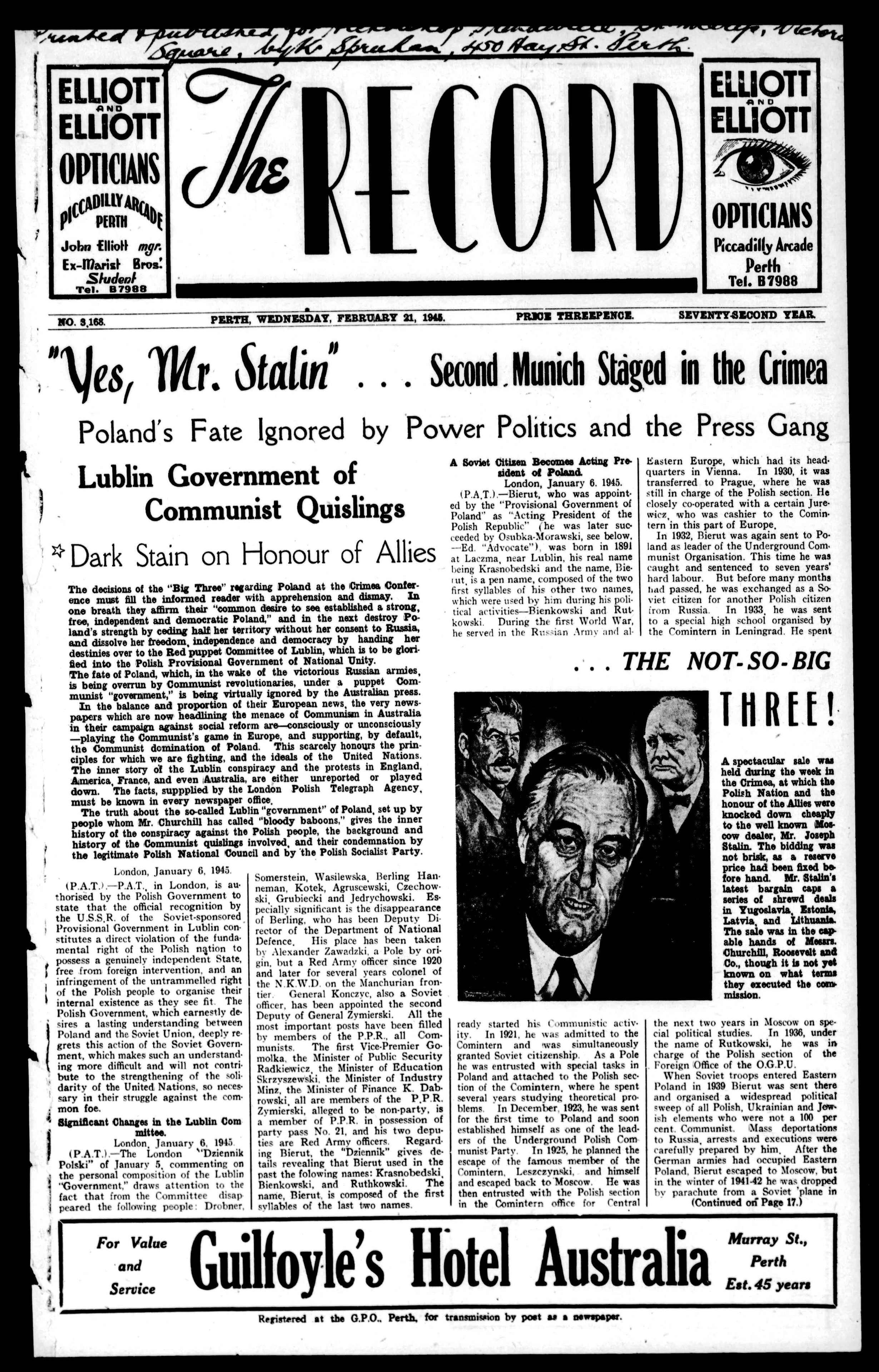 The decisionsofthe"Big Three"regarding Poland at theCrimesConference must fill the informed readerwith apprehension and dismay, In one breath they affirm their"commondesire toa"establishedastrong, free, independentand democratic Poland," and in the next destroy Poland'sstrengthbyceding]calfherterritorywithoutherconsenttoRussia, anddissolveherfreedom,independence and democracy by handing her destiniesovertotheRedpuppetCommitteeofLublin,whichistobeglorified into the Polish Provisional Government of NationalUnity, ThefateofPoland,which,inthewake of the victorious Russian armies, is beingoverrunbyCommunist revolutionaries,under a puppet Communist "government," is being virtuallyignored by the Australianpress.
