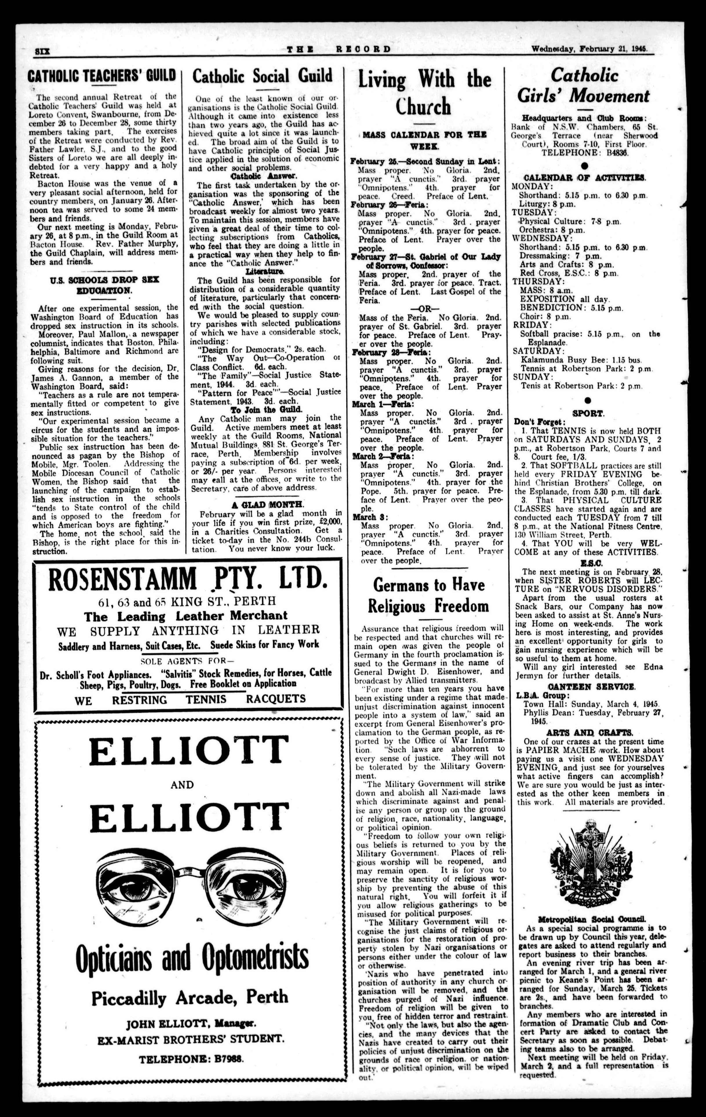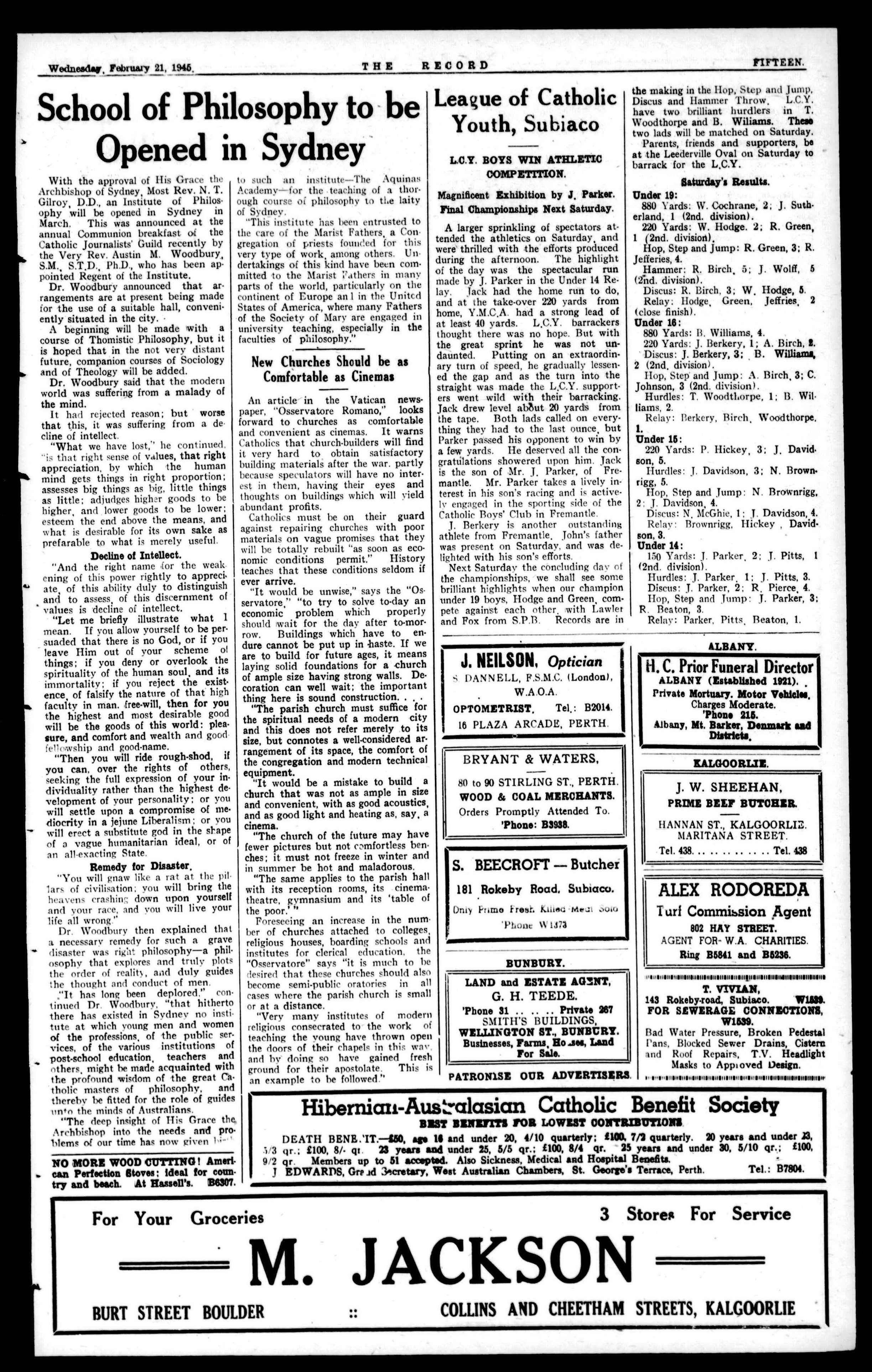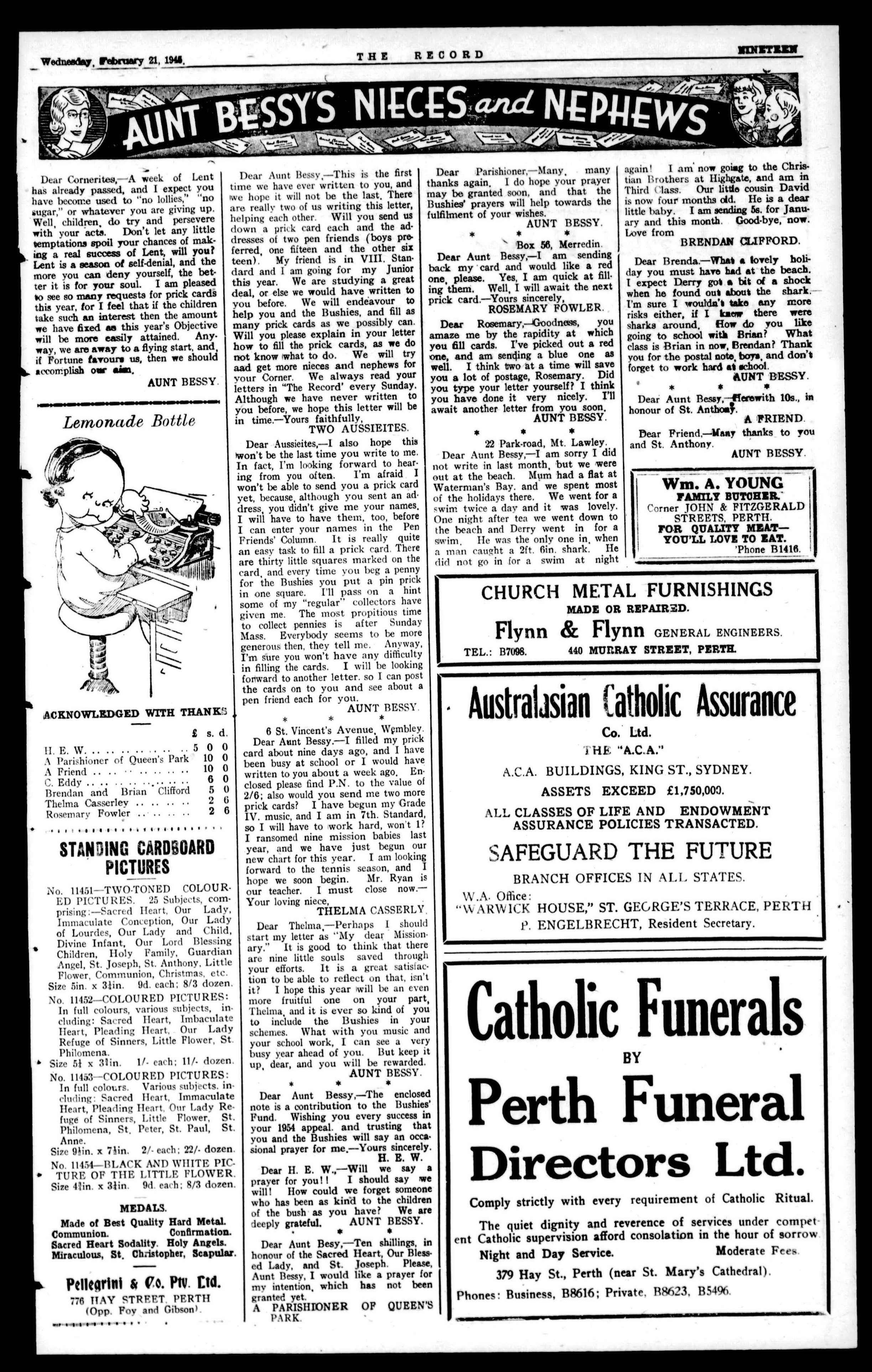 CHURCH METAL FURNISHINGS MADE OR REPAIRF,D. Flynn & Flynn GENERAL ENGINEERS. TEL.: B7098. 440 MURRAY STREET, PERTH. Australasian catholic Assurance Co. Ltd. THE "A.C.A." A.C.A, BUILDINGS, KINGST.,SYDNEY. ASSETS EXCEED £1,750,000. ALLCLASSESOFLIFE AND ENDOWMENT ASSURANCE POLICIESTRANSACTED. SAFEGUARD THE FUTURE BRANCH OFFICES IN ALi. STATES. W.A. Office: WARWICK HOUSE," ST. GEGRGE'S TERRACE, PERTH P. ENGELBRECHT, Resident Secretary. Catholic Funerals BY Perth Funeral Directors Ltd. Comply strictly with every requirement of Catholic Ritual. The quiet dignity and reverence of services under competent Catholic supervision afford consolation in the hour of sorrow Night and Day Service. Moderate Fees. 379 Hay St., Perth (near St. Mary's Cathedral). Phones: Business, B8616; Private, B8623, B5490.