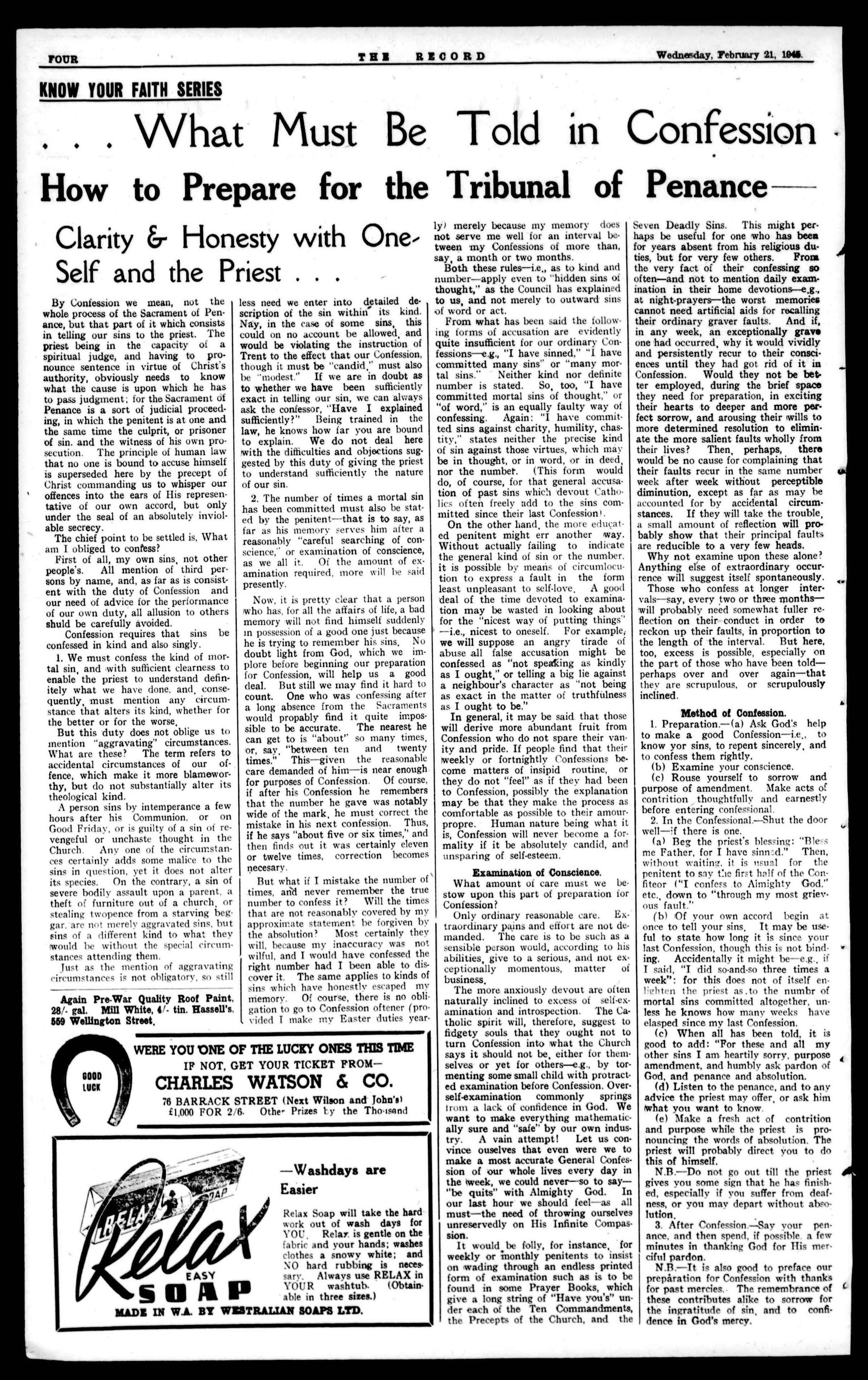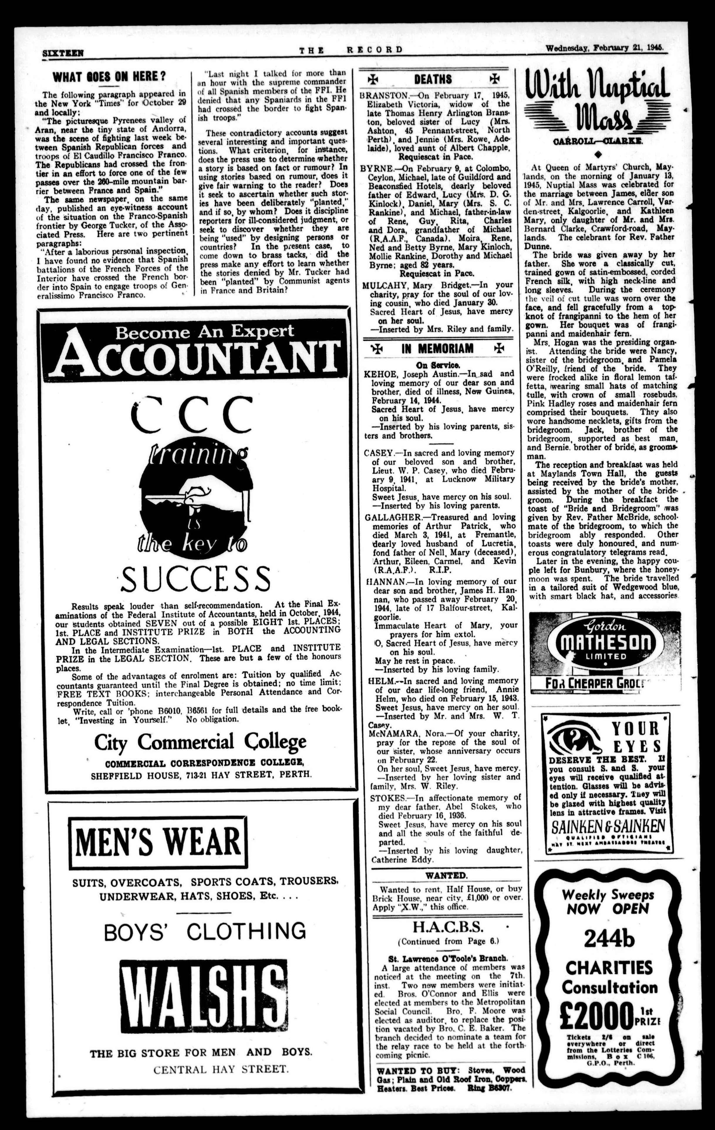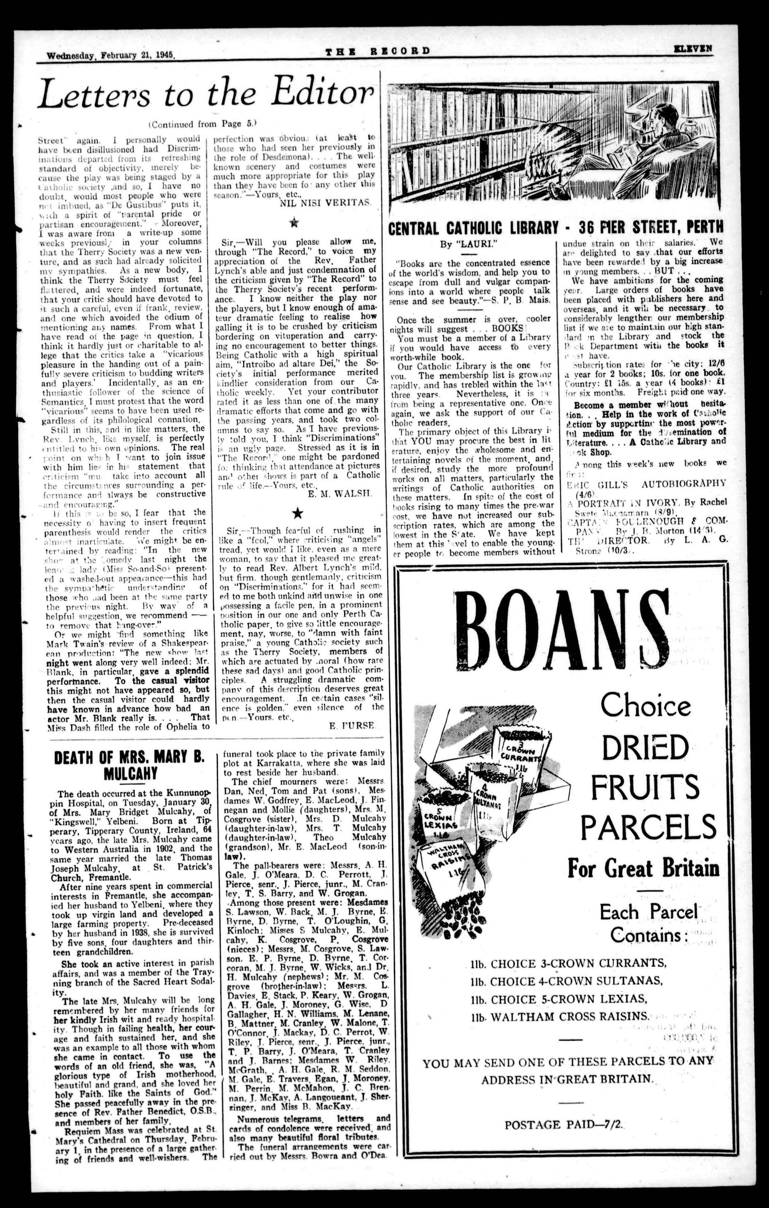 CHURCH METAL FURNISHINGS MADE OR REPAIRF,D. Flynn & Flynn GENERAL ENGINEERS. TEL.: B7098. 440 MURRAY STREET, PERTH. Australasian catholic Assurance Co. Ltd. THE "A.C.A." A.C.A, BUILDINGS, KINGST.,SYDNEY. ASSETS EXCEED £1,750,000. ALLCLASSESOFLIFE AND ENDOWMENT ASSURANCE POLICIESTRANSACTED. SAFEGUARD THE FUTURE BRANCH OFFICES IN ALi. STATES. W.A. Office: WARWICK HOUSE," ST. GEGRGE'S TERRACE, PERTH P. ENGELBRECHT, Resident Secretary. Catholic Funerals BY Perth Funeral Directors Ltd. Comply strictly with every requirement of Catholic Ritual. The quiet dignity and reverence of services under competent Catholic supervision afford consolation in the hour of sorrow Night and Day Service. Moderate Fees. 379 Hay St., Perth (near St. Mary's Cathedral). Phones: Business, B8616; Private, B8623, B5490.