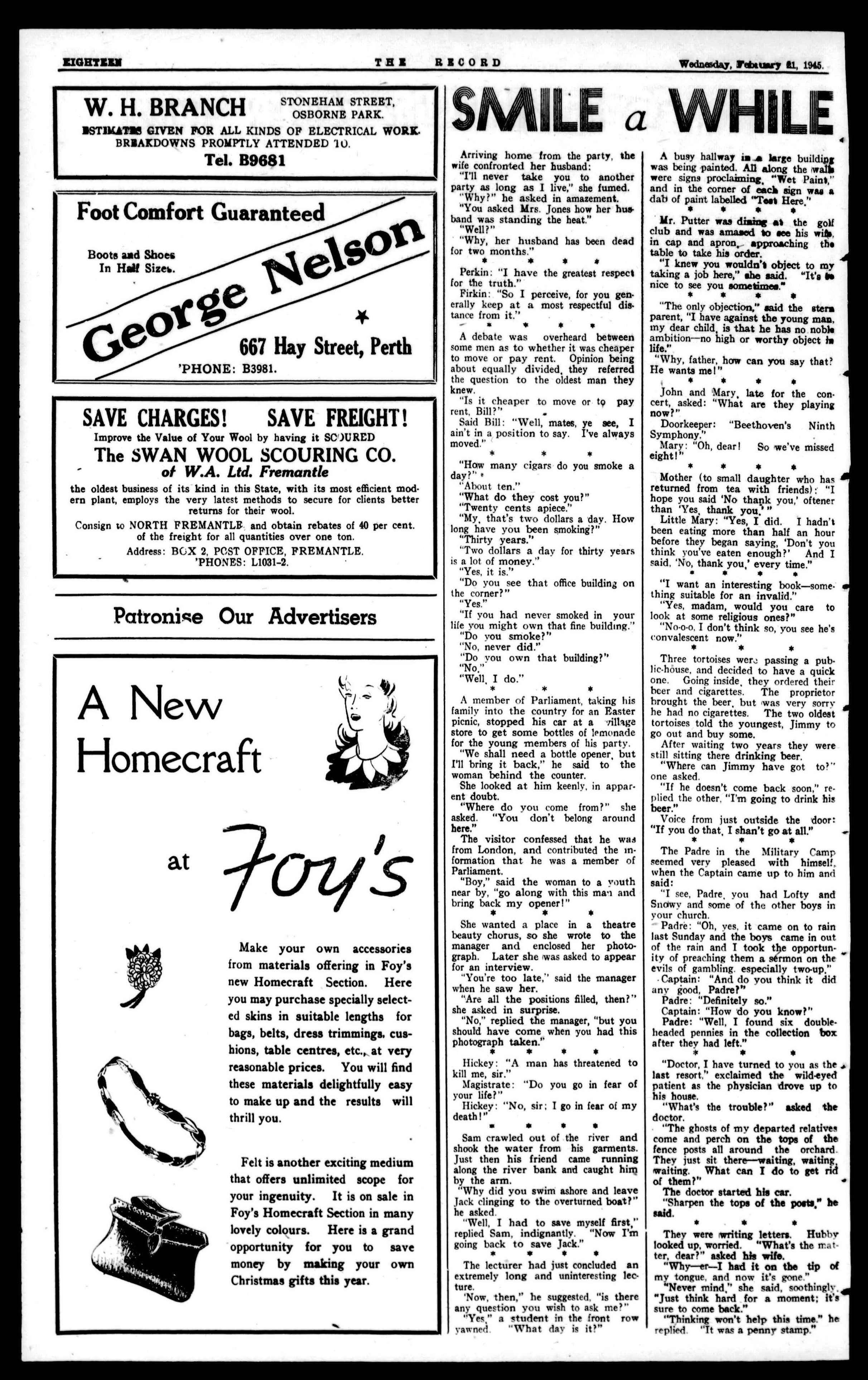 ZIGRTZZN TH! RECORD Wednesday,Tebauasy e1, 190. W.H.BRANCH STONEHAM STREET, OSBORNE PARK. NST1MAT25 GIVEN FOR ALL KINDS OF ELECTRICAL WORY, BRIIAKDOWNS PROMPTLY ATTENDED 10. Tel. B9681 Foot Comfort Guaranteed BootsandShoes In Half Size►. TA 010 667FlaqStreet,Perth 'PHONE: B3981. SAVE CHARGES! SAVE FREIGHT! Improve theValue ofYour Wool by having it SC')URED TheSWAN WOOLSCOURINGCO. of W.A. Ltd. Fremantle the oldestbusiness of its kind in this State,with itsmostefficient modern plant,employs the very latest methods to secure for clients better returns for their wool. Consign to NORTH FREMANTLE and obtain rebates of 40 per cent. ofthe freight for all quantities over one ton. Address: BOX 2, POST OFFICE, FREMANTLE. 'PHONES: L1031-2. Patronise Our Advertisers A New Homecraft at •G-ys Make your own accessories from materials offering in Foy's new Homecraft Section. Here youmaypurchasespeciallyselected skins in suitable lengths for bags, belts, dress trimmings, cushions, table centres,etc.,,at very reasonableprices. Youwillfind