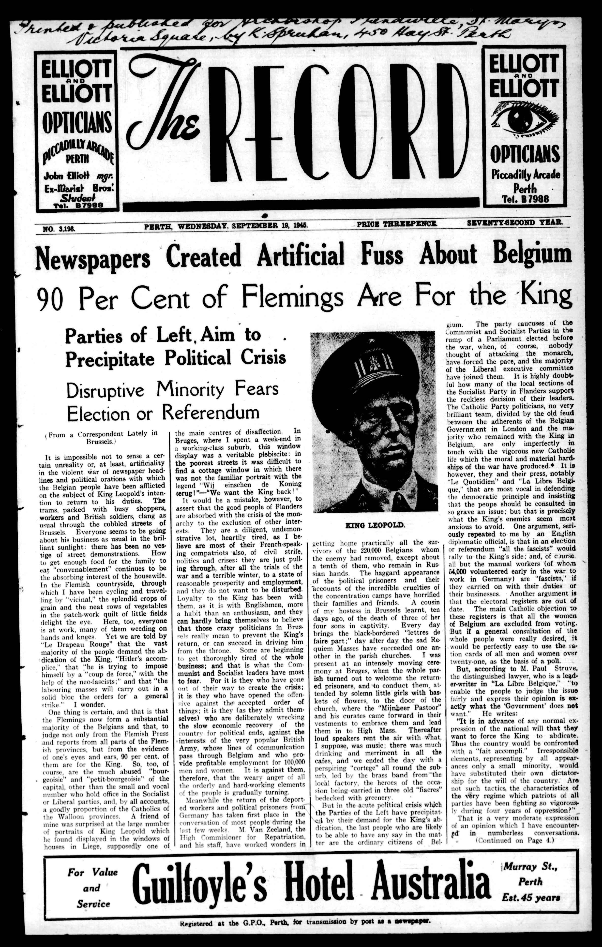 glum. The party caucuses of the Communist and Socialist Parties in the rump of a Parliament elected before the war, when, of course, nobody thought of attacking the monarch, have forced the pace,andthe majority of the Liberal executive committee have joined them. It ishighly doubtful how many of the local sections of the Socialist Party in Flanders support the reckless decision of their leaders. The Catholic Partypoliticians, no very brilliant team, divided by the old feud between the adherents of the Belgian Government in London and the ma• jority who remained with the King in Belgium, are only imperfectly in touch with the vigorous new Catholic life which the moral andmaterialhardshipsof the warhave produced.* It is however, they and their press, notably "Le Quotidien" and "La Libre Belgique," that are most vocal in defending the democratic principle and insisting that the peope should be consulted in sograve an issue; but thatis precisely what the King's enemies seem mcst anxious to avoid. Oneargument, seriously repeated to me by an En,lsn diplomatic official,isthatinanelection or referendum "all the fascists" would rally to the King's side; and, of course. all but the manual workers (of whom 54,00(1volunteered early in the war to work in Germany) are "fascists,'' if they carried on with their duties or their businesses. Another argument is that the electoral registers are out of date. The main Catholic objection to these registers is that all the women of Belgium are excluded from voting. But if ageneral consultation of the whole people were really desired, it would be perfectly easy to use the ration cards of all men and women over twenty-One, as the basisof apoll.