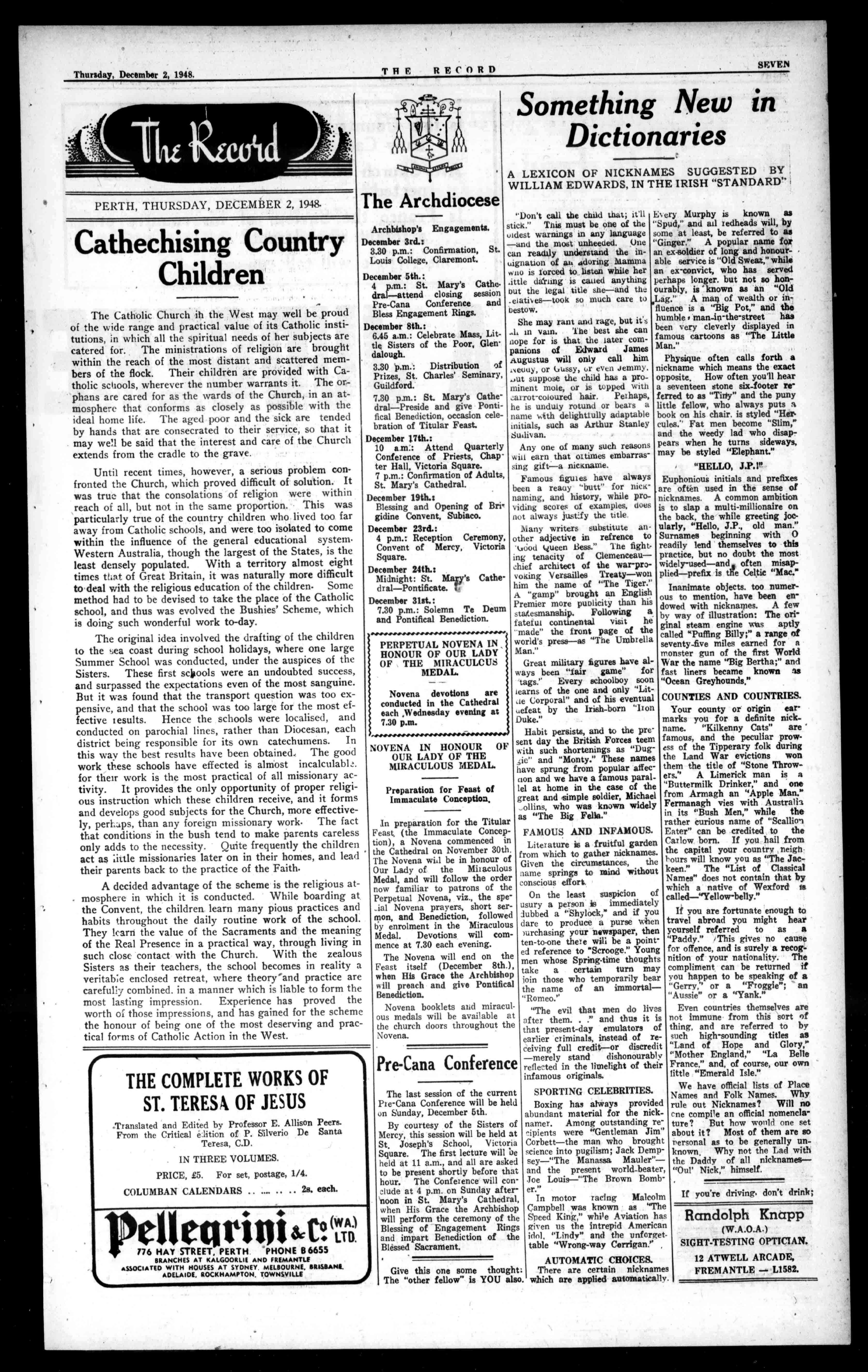 XeSI).fly .4/ -CE. RegisteredattheG.P.O., Perth,fortransmissionby postasanewspaper. NO.2,391. 'PhoneB6950. 450HayStreet,Perth. BoxA35,G.P.O. .11/44TRecot OfficialorganoftheArchdioceseofPerth, Established1874. Thursday,December2,1948. Seventy-FifthYear. PriceThreepence.