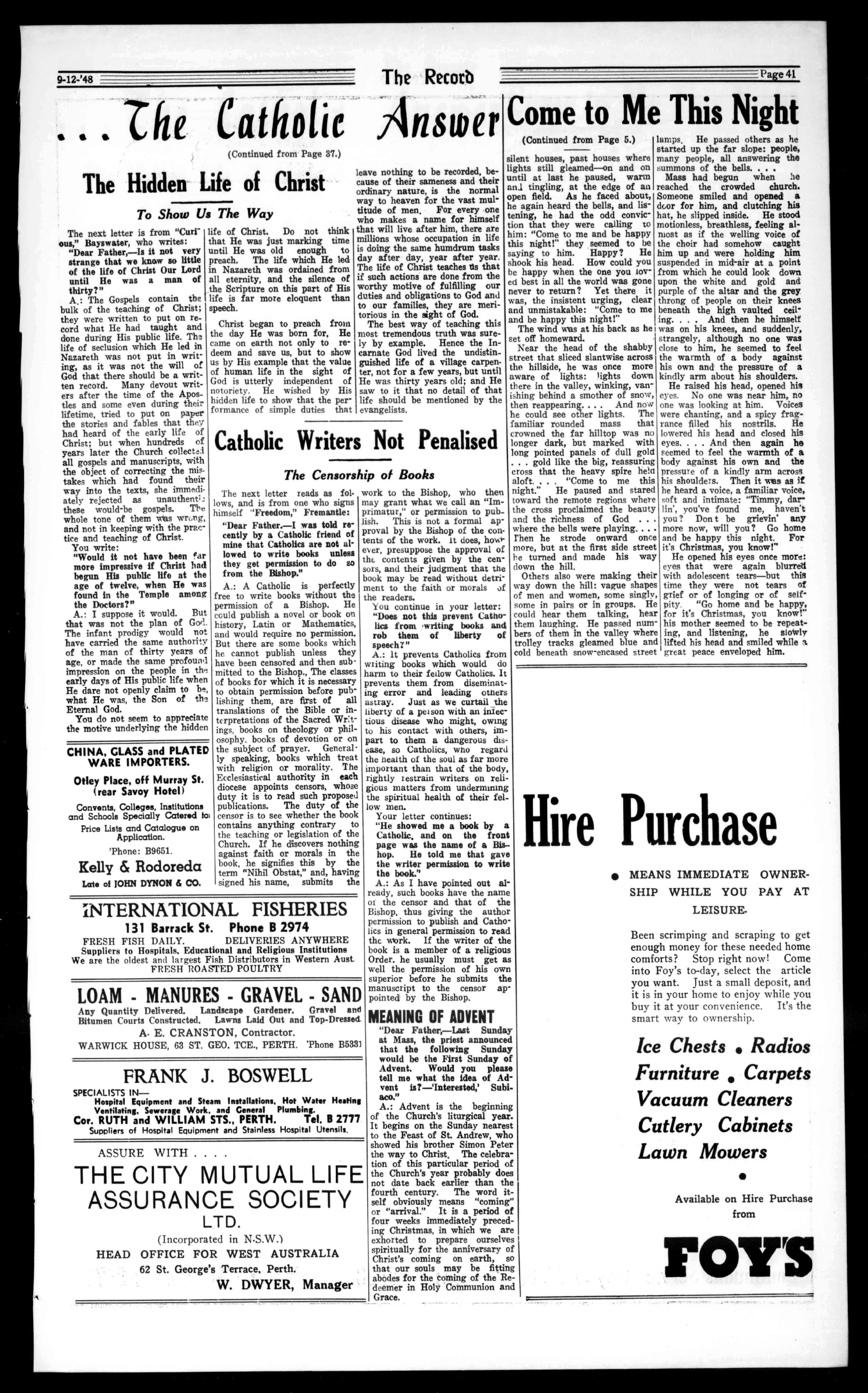 Inthepoetrysection,InoticedTHEHOUNDOFHEAVEN(FrancisThompson), at1/7;andTHEPOEMSOFFRANCIS'THOMPSON(24/3),POEMSOFST.JOHNOF THECROSS(5/9)ADAMLINDSAYGORDON(hisworksandashortbiography), 8/6;HENRYLAWSON(7/6),"BANJO"PATTERSON(7/6),ELLAWHEELERWILCOX(5/6),GERARDMANLEYHOPKINS(14/9),QUEENOFTHESEVENSWORDS (G.K.Chesterton). Thereisasplendidline-upofNovels,TravelBooks,andgeneralsubjects.