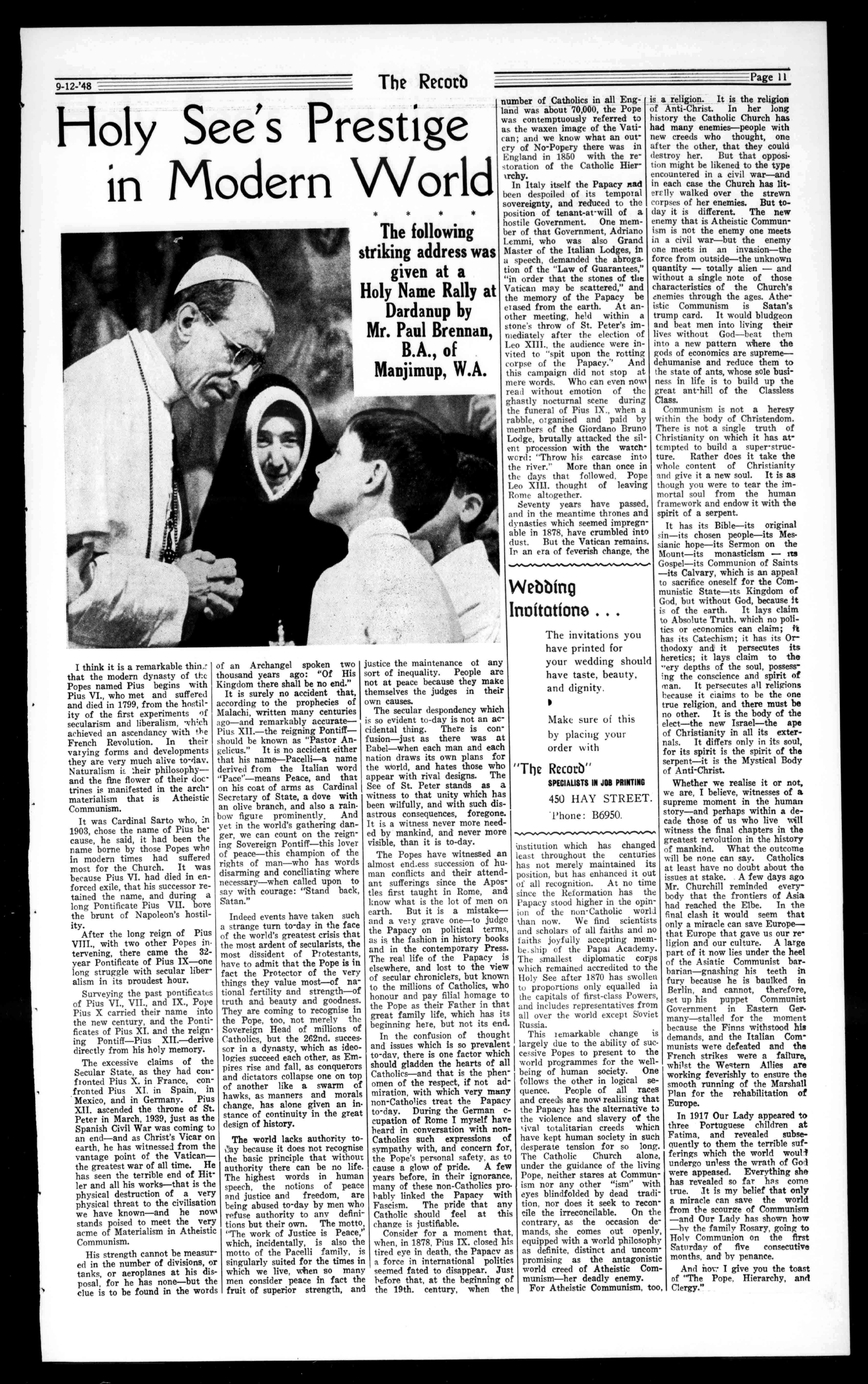 miraculousway,intoafamily iikcallofus."Marybrought forthherfirstborn(andonlybegotten)sonandwrappedhimup inswaddlingclothesandlaidhim inamanger." Jesuswasnextagrowinglad, UnfortunatelyHolyScripture doesnotmentionthoseyears, exceptwhenattheageoftwelve, ontheoccasionofapilgrimage toJerusalem,Hestayedbehind andwaslosttoMaryandJoseph forthreedays.TheyfoundHim intheTemple,teachingthe learnedmenofthatday.Then backHewenttoNazarethto be"subjecttoHisparents,"to dowhattheyhadplannedfor Him.Andbeingthesonofa carpenter,Hehadtoworkwith Hishands,listeningtoSt.Joseph'sinstructionsandcarrying themout,evenwhenHecould havetoldSt.Josephsuchamethodofcarpenteringwasprimitiveandnotwhatacarpenterin 1948wouldhavedone.But"He hadcomeonearthnottodoHis ownwillbutthewillofHis Father,"andHisWillwasthat HisSonshouldteachushowto workandlivethetrueChristian lifeinthetrueChristianfamily. AndsoperfectlywasHeapart ofthatfamilythatpeopleafterwards,whoknewHiminHislife atNazareth,wouldaskwhen thesawHimworkingmiracles