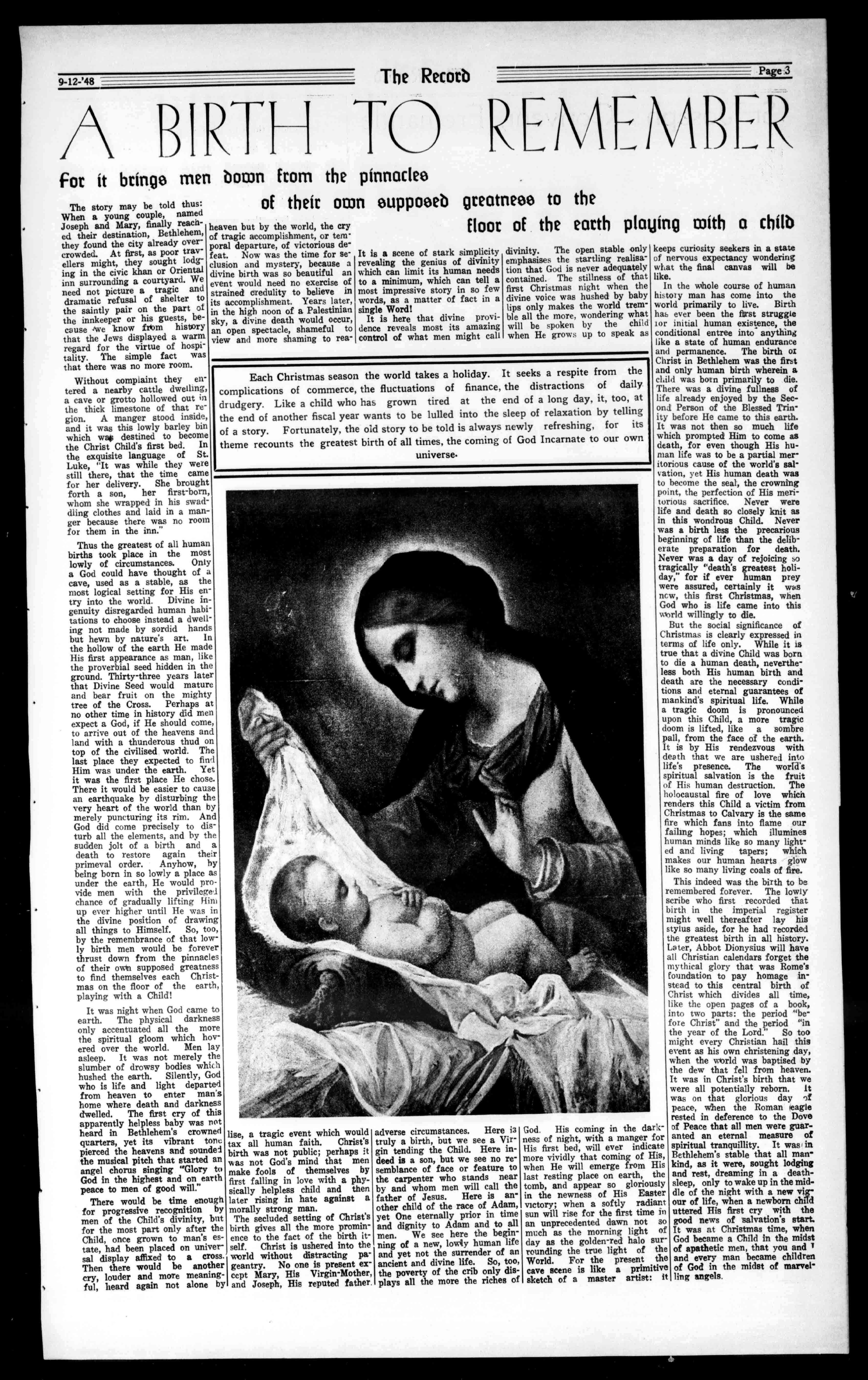 Inthewholecourseofhuman histoiymanhascomeintothe worldprimarilytolive.Birth haseverbeenthefcrststruggle iorinitialhumanexistence,the conditionalentreeintoanything likeastateofhumanendurance andpermanence.Thebirthor ChristinBethlehemwasthefirst andonlyhumanbirthwhereina childwasbornprimarilytodie. Therewasadivinefullnessof lifealreadyenjoyedbytheSecondPersonoftheBlessedTrinitybeforeHecametothisearth. Itwasnotthensomuchlife whichpromptedHimtocomeas death,foreventhoughHishumanlifewastobeapartialmeritoriouscauseoftheworld'ssalvation,yetHishumandeathwas tobecometheseal,thecrowning point,theperfectionofHismeritorioussacrifice.Neverwere lifeanddeathsocloselyknitas inthiswondrousChild.Never wasabirthlesstheprecarious beginningoflifethanthedeliberatepreparationfordeath. Neverwasadayofrejoicingso tragically"death'sgreatestholiday,"forifeverhumanprey wereassured,certainlyitwas ncw,thisfirstChristmas,when Godwhoislifecameintothis worldwillinglytodie.