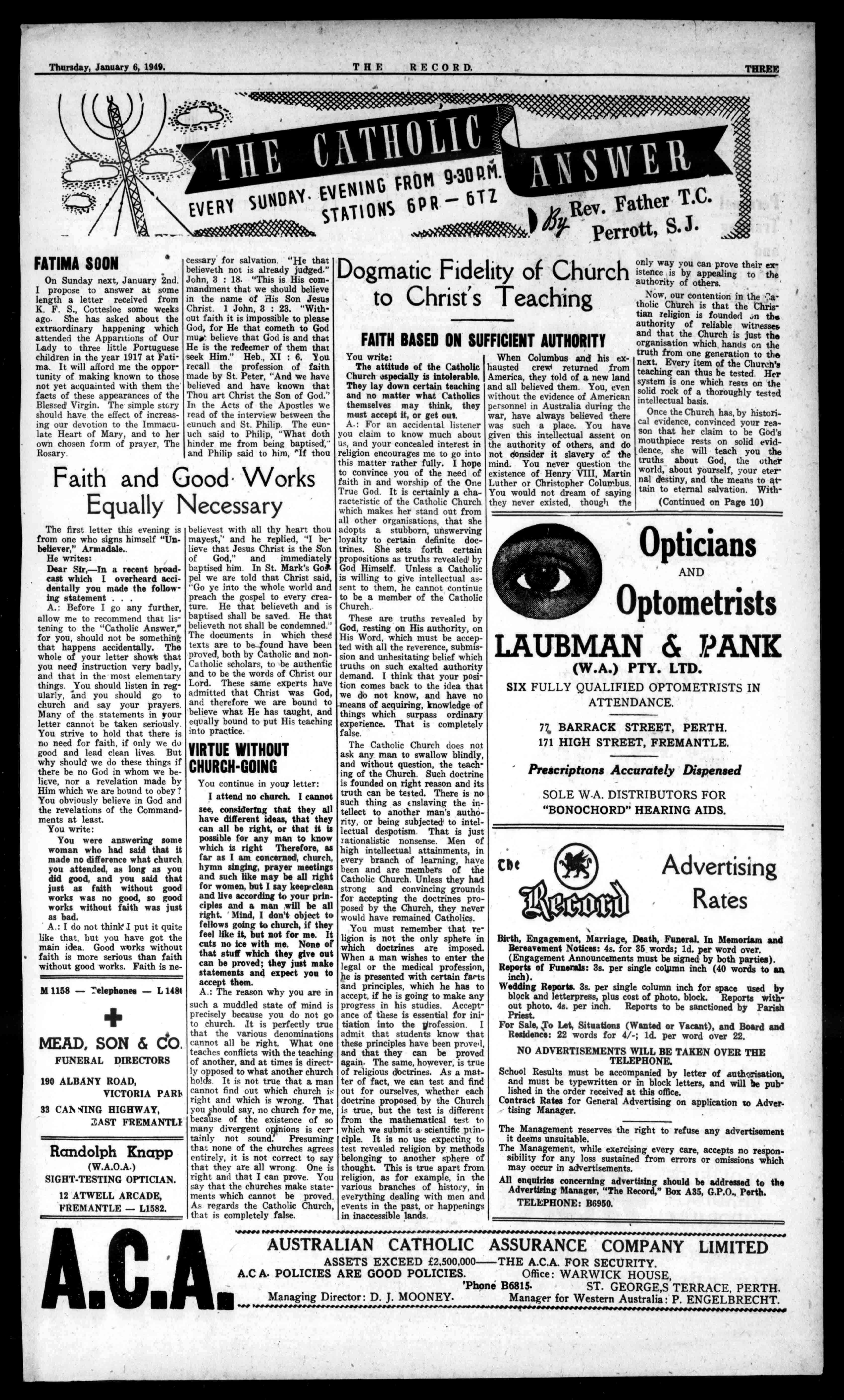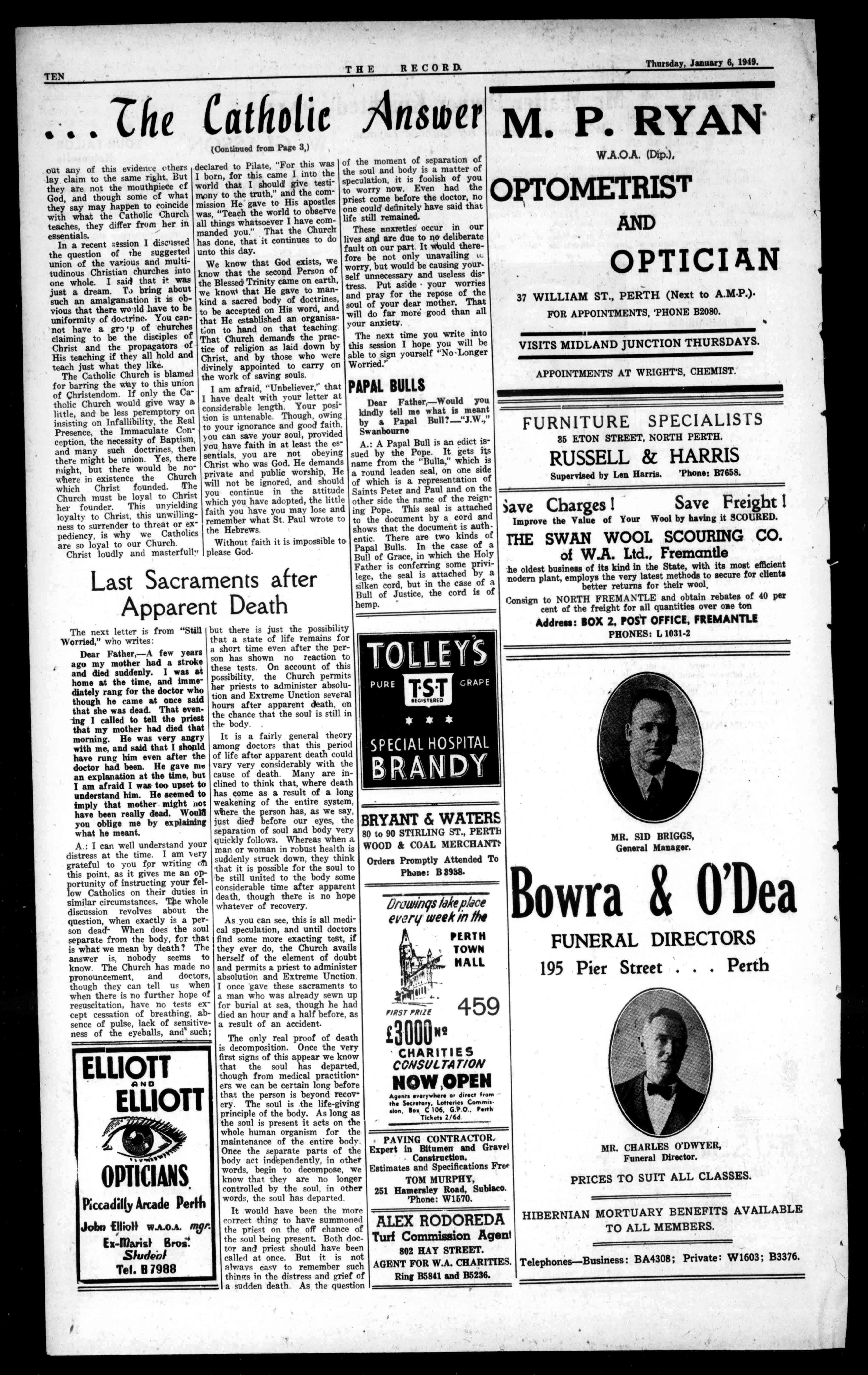 A.:Icanwellunderstandyour distressatthetime.Iam'very gratefultoyouforwriting thispoint,asitgivesmeanopportunityofinstructingyourfellowCatholicsontheirdutiesin similarcircumstances.Thewhole discussionrevolvesaboutthe question,whenexactlyisapersondead-Whendoesthesoul separatefromthebody,forthat iswhatwemeanbydeath?The answeris,nobodyseemsto knowTheChurchhasmadeno pronouncement,anddoctors, thoughtheycantelluswhen whenthereisnofurtherhopeof resuscitation,havenotestsexceptcessationofbreathing,absenceofpulse,lackofsensitivenessoftheeyeballs,and'such;