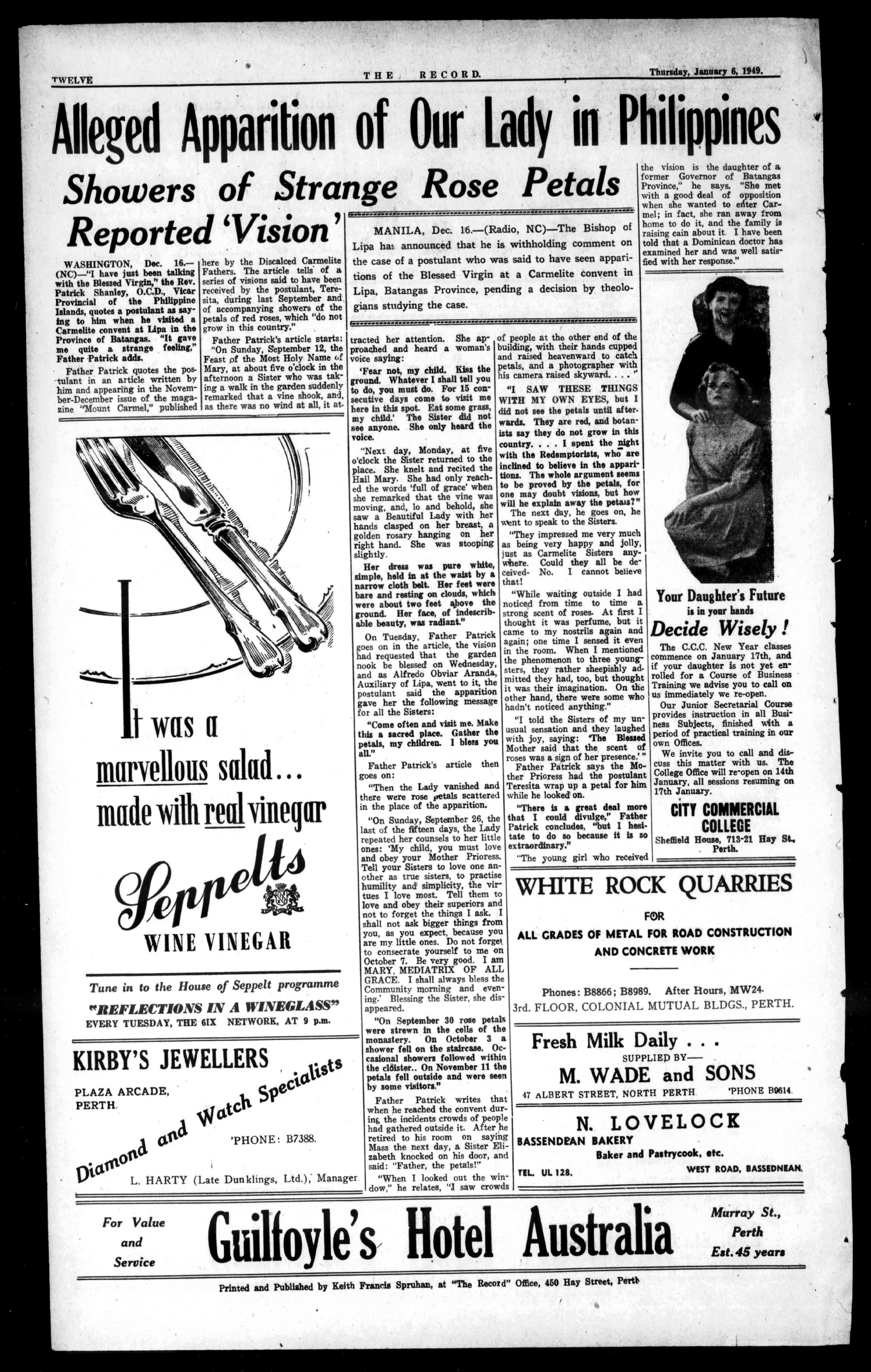 herebytheDiscalcedCarmelite Fathers.Thearticletellsofa seriesofvisionssaidtohavebeen receivedbythepostulant,Teresita,duringlastSeptemberand ofaccompanyingshowersofthe petalsofredroses,which"donot growinthiscountry."