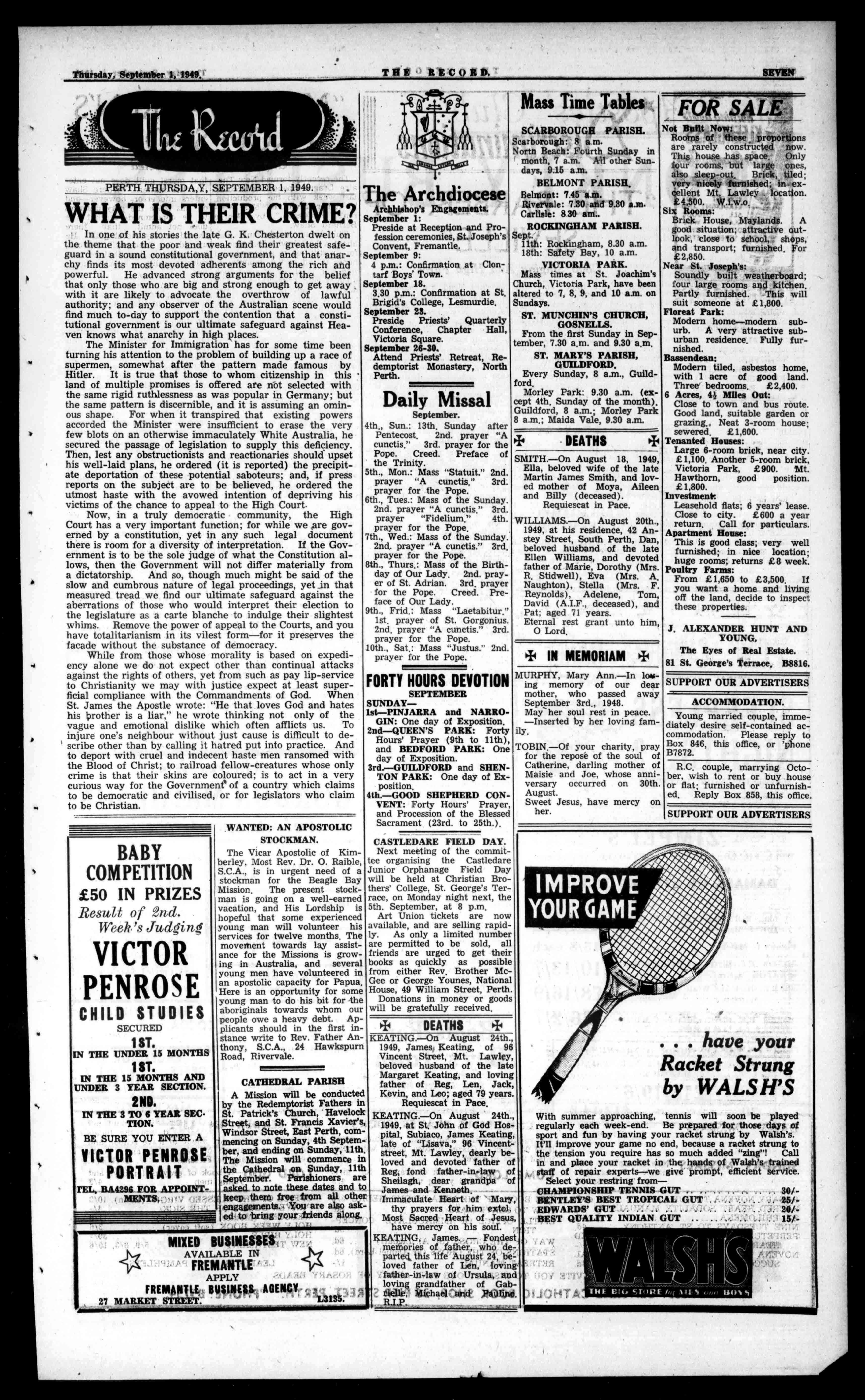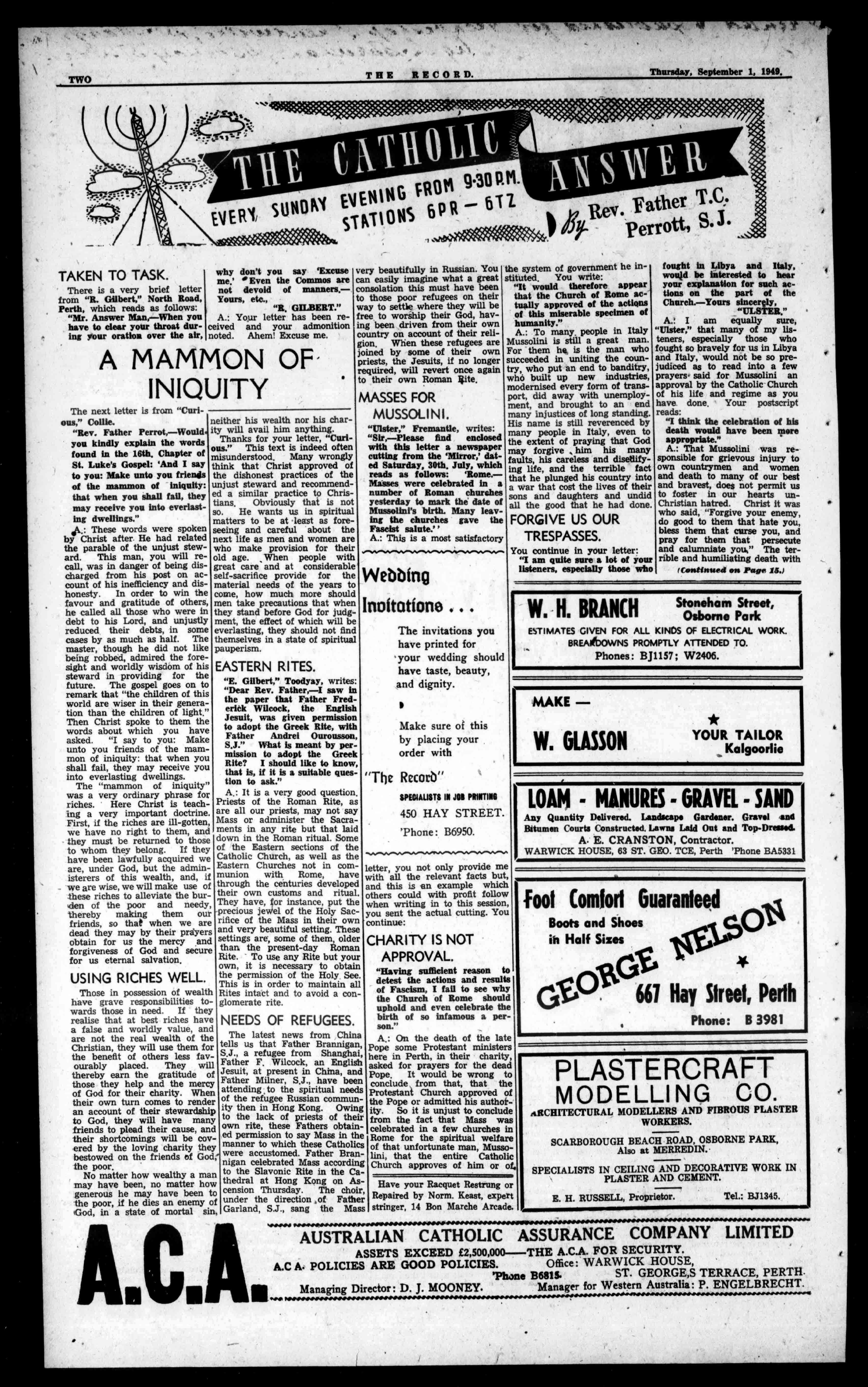 ti RegisteredattheG.P.0, Perth,fortransmissionby postasanewspaper. NO.2,433. PHONES:B6950BA2837 450HayStreet,Perth. BoxA36,G.PO. - dr4P-471711n077nrier 40(etcel ecot OfficialorganoftheArchdioceseofPerth. Established1874. THURSDAY, SEPTEMBER1,1949 Seventy-sixthYear. PriceThreepence