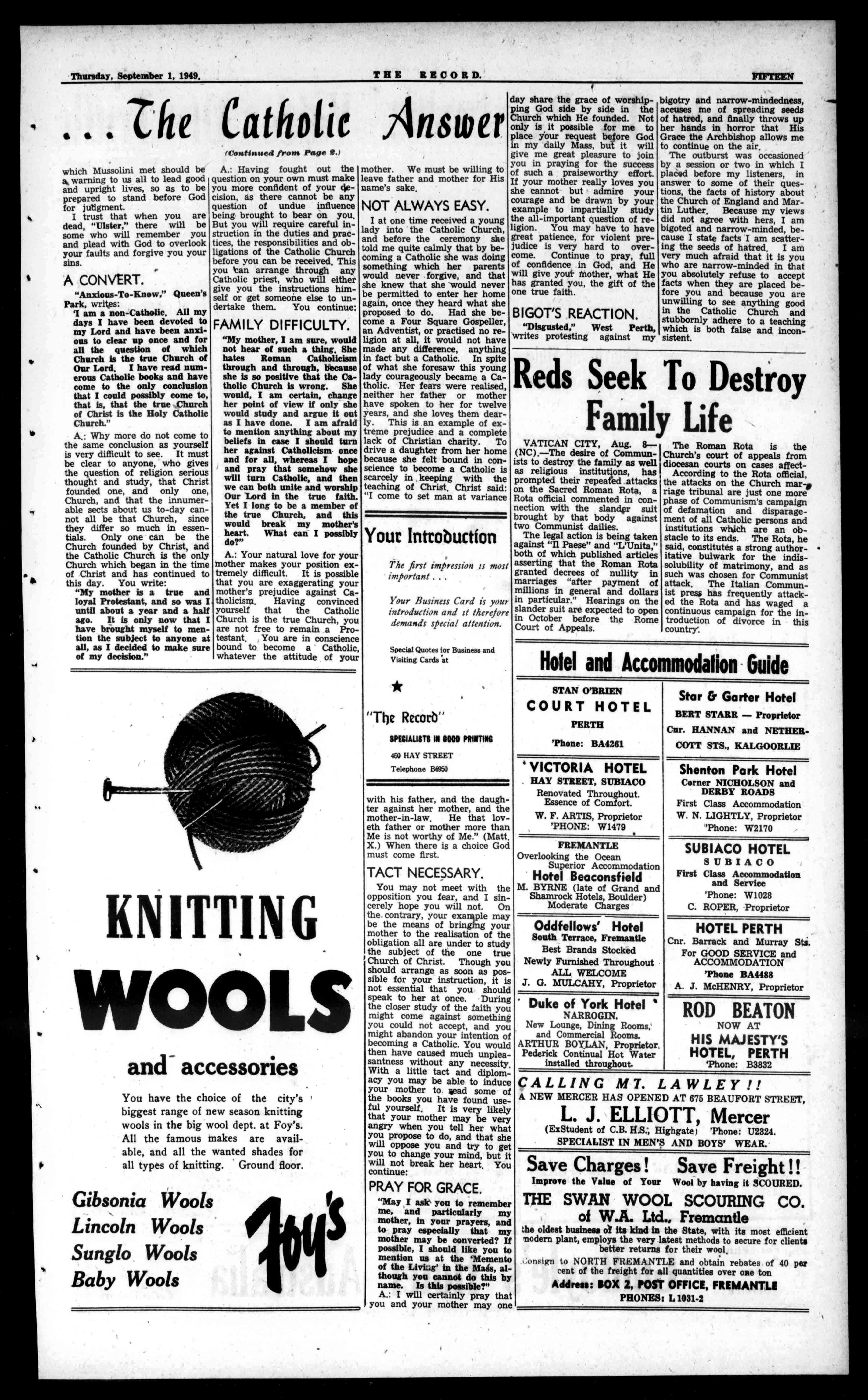 HOTELPERTH Cnr.BarrackandMurraySti, ForGOODSERVICEand ACCOMMODATION 'PhoneBA4488 A.J.McHENRY,Proprietor RODBEATON NOWAT HISMAJESTY'S HOTEL,PERTH 'Phone:B3832 CALLINGMT.LAWLEY!! ANEWMERCERHASOPENEDAT675BEAUFORTSTREET, L.J.ELLIOTT,Mercer (ExStudentofC.B.H.S.;Highgate'Phone:U2324. SPECIALISTINMEN'SANDBOYS'WEAR. SaveCharges!SaveFreight!! ImprovetheValueofYourWoolbyhavingitSCOURED. THESWANWOOLSCOURINGCO. ofW.A.Ltd.,Fremantle theoldestbusinesscaitskindintheState,withitsmostefficient modernplant,employstheverylatestmethodstosecureforclients betterreturnsfortheirwool, nsifirntoNORTHFREMANTLEandobtainrebatesof40per centofthefreightforallquantitiesoveroneton Address:BOX2,POSTOFFICE,FREMANTLE PHONES:L1031-2
