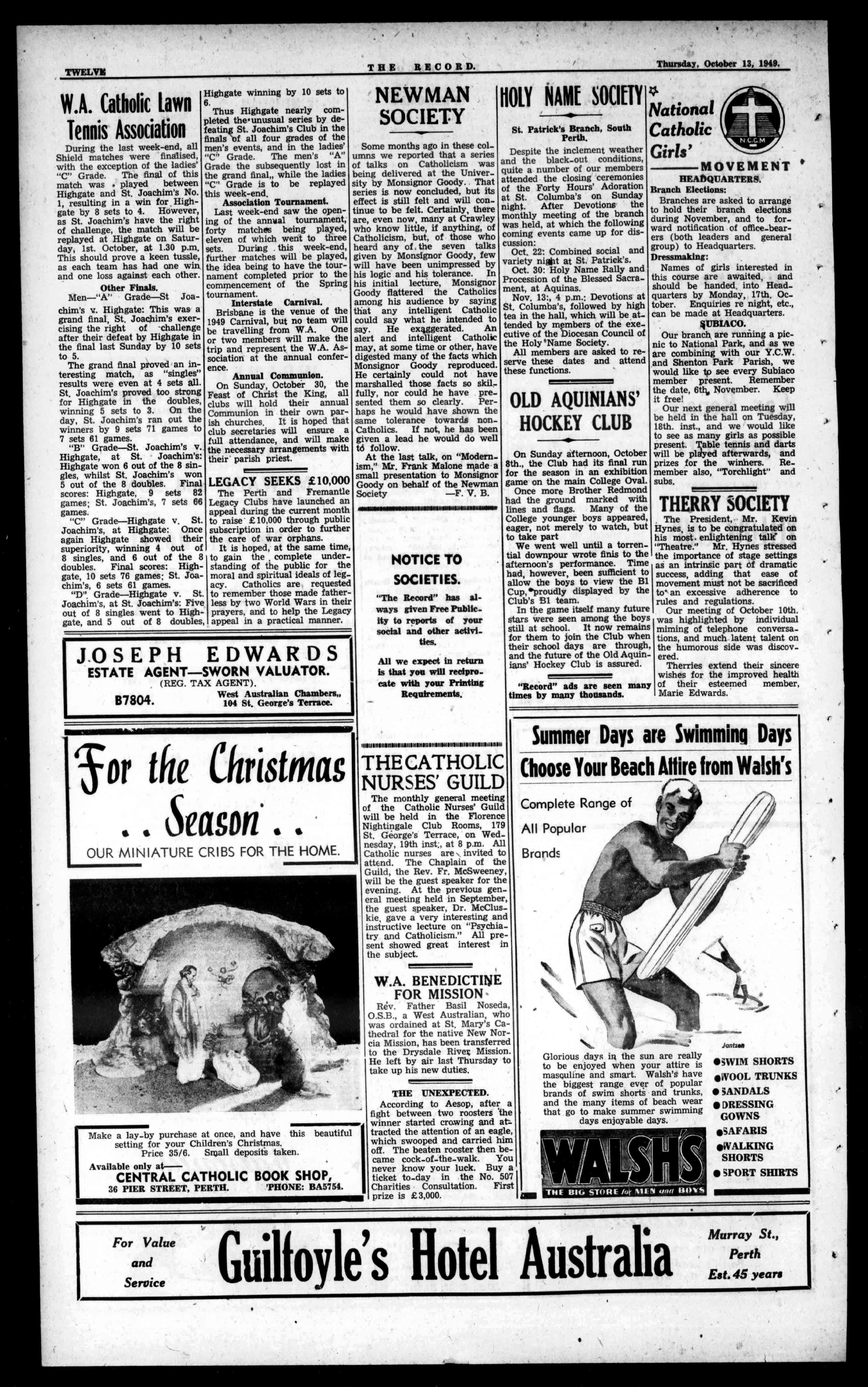Brisbaneisthevenueofthe 1949Carnival,butnoteamwill betravellingfromW.A.One ortwomemberswillmakethe tripandrepresenttheW.A.Associationattheannualconference. AnnualCommunion.