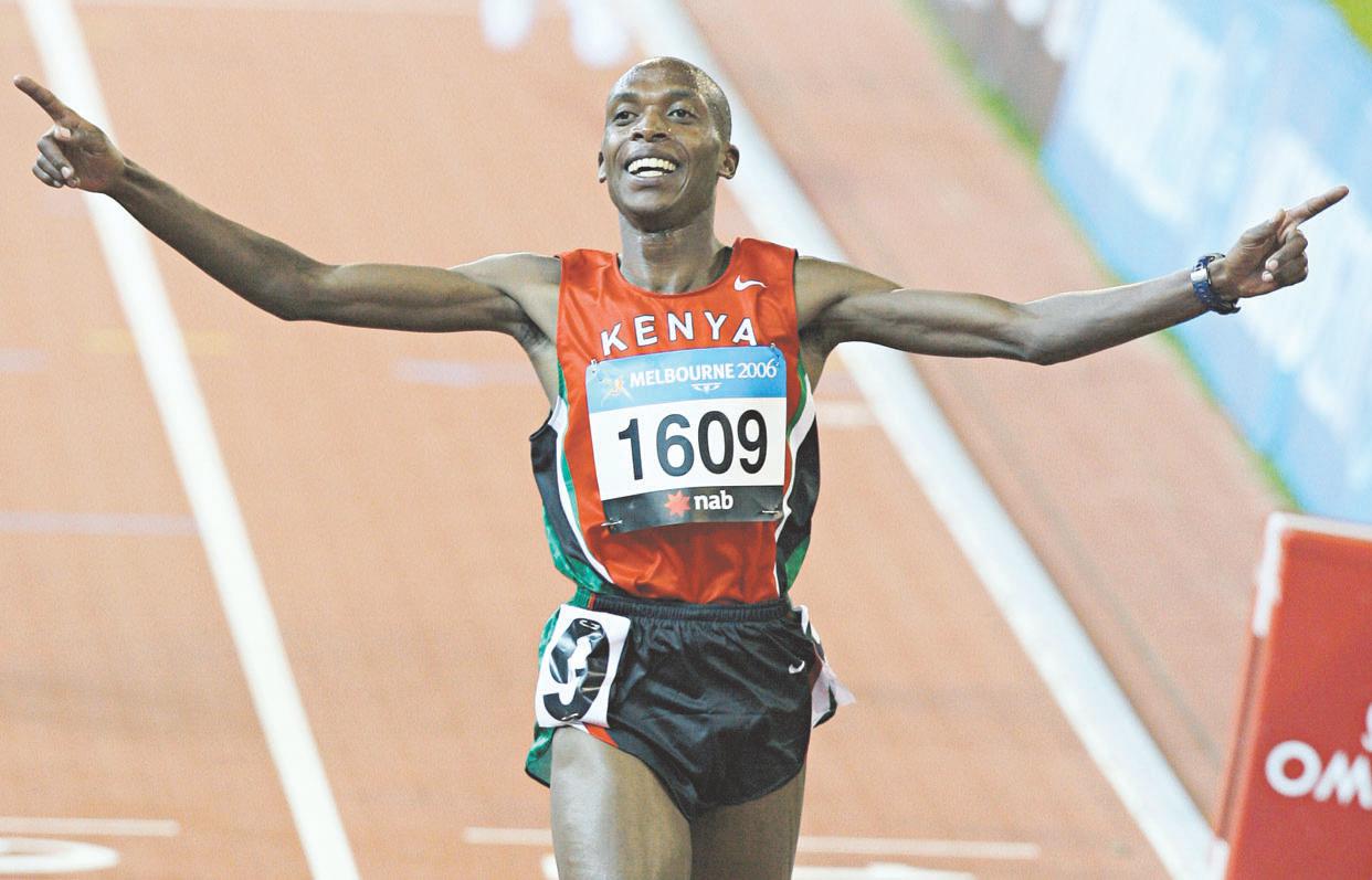 Acknowledging a higher power: Augustine Choge of Kenya reacts as he crosses the finish line in the men’s 5,000 metres in the 18th Commonwealth Games in Melbourne on 20 March 2006. Choge won the race with a time of 12 minutes 56.41 seconds - and blessed himself as he crossed the line.
