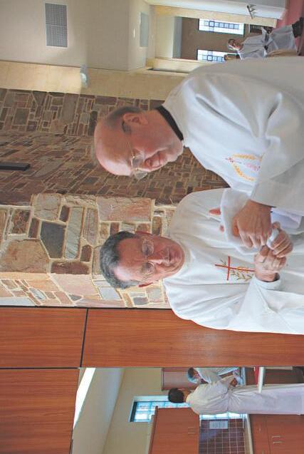 Archbishop Barry Hickey, top, addresses those gathered for the dedication of the new church while, clockwise, staff and students from the adjacent St Francis Xavier School process with the Gospel; Fr Kaz lights a candle held by a student symbolising God’s revelation of himself to Moses in the burning bush; a bas-relief depicting the patron saint of the parish preaching to people in India; a child takes a moment’s break sitting on a windowsill behind the sanctuary; Fathers Jim Corcoran and Kaz Styglik return to the sanctuary after the annointing of the walls of the new building and, below, Archbishop Hickey places the Blessed Sacrament in the tabernacle in its side chapel. The tabernacle was brought to the the church from the old St Francis Xavier located at Third Road, Armadale