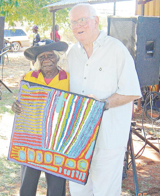 So long, old friend: Father Kevin McKelson SAC, one-time priest at the community of Bidyadanga-La Grange in the Kimberley, was farewelled earlier this year by the people he had ministered to for many years. Fr McKelson left the community after nearly half a century of service to the Church and its mission. He was parish priest in Broome and Beagle Bay as well as at La Grange where he worked from 1961 to 1993. Parishioners farewelled Fr McKelson at Mass, above, while later he was presented with a special painting by Weaver Jack. He was also chaplain in recent years at the University of Notre Dame Australia’s Broome campus.