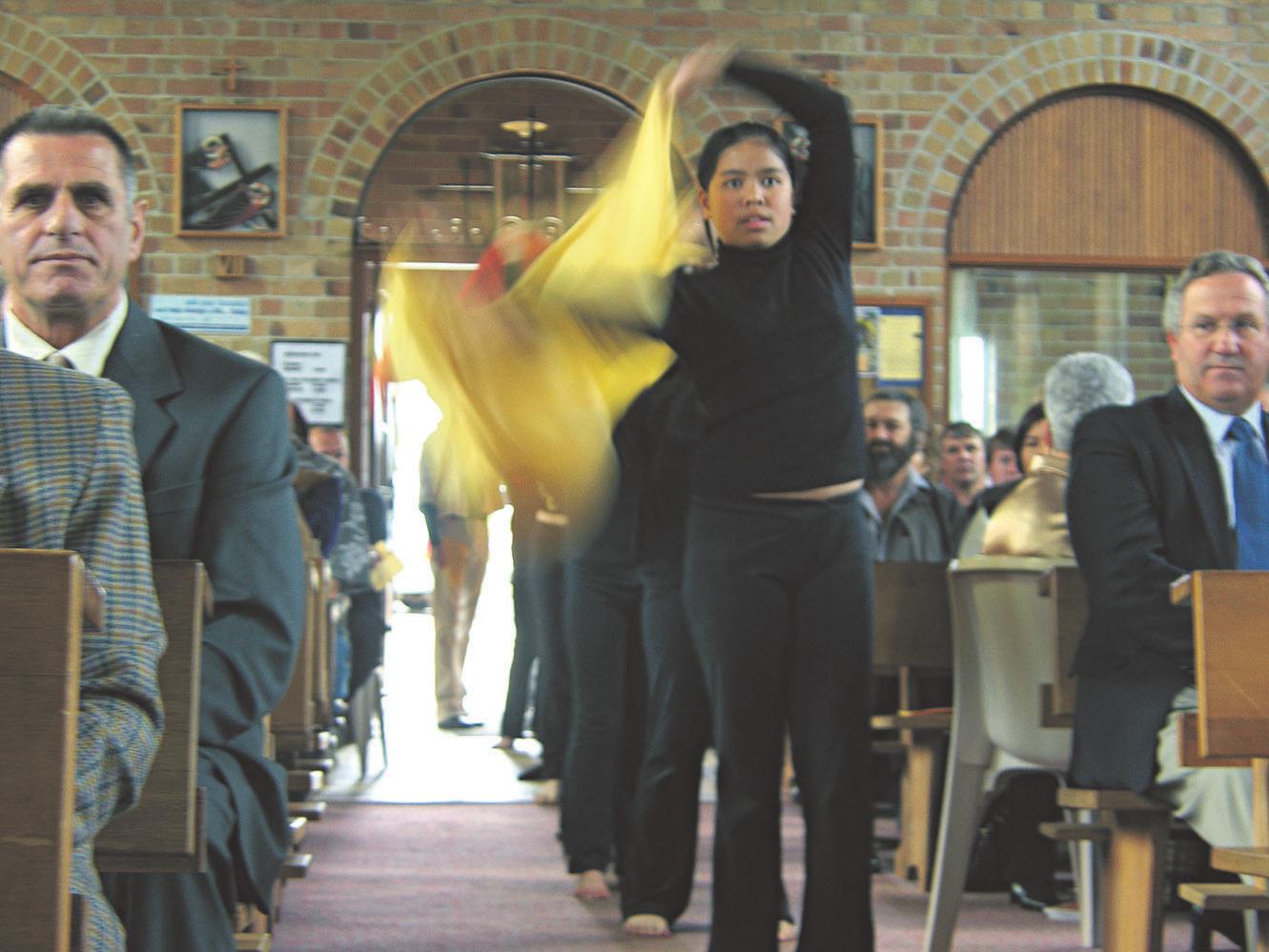 Students from Kearnan College put on a colourful display during the Mass to mark the 50th anniversary of St Joseph’s Church. On the right is local MLA Paul Omodei, of Pemberton, a former student at Kearnan College.