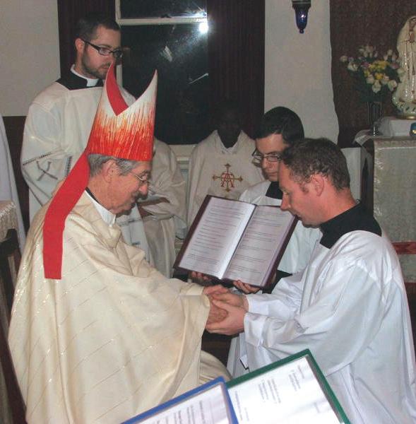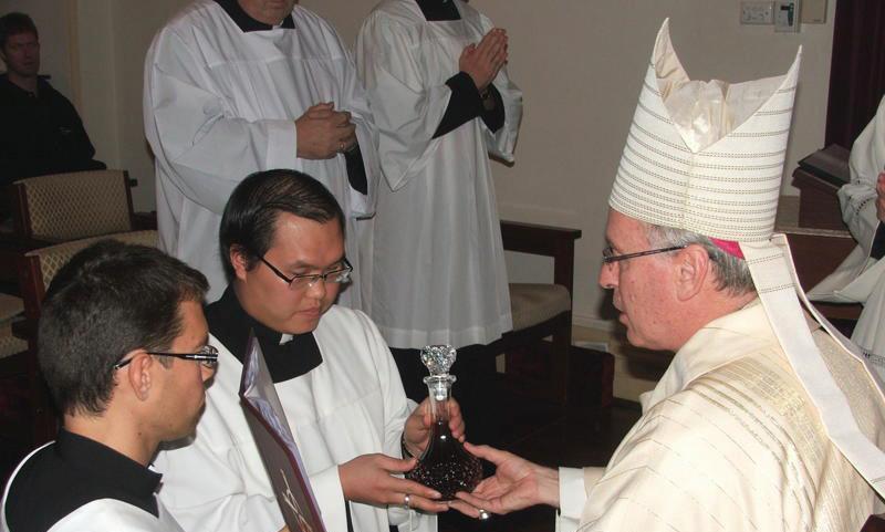 Gathering in the Seminary’s chapel before the Archbishop, with Rector Mgr Kevin Long looking on, Daniel, Cyprian, Emmanuel, Anibal Leite da Cunha and Francis Birrell put their hands on a Bible placed in the middle of the altar and made their profession, petition and declaration of celibacy.