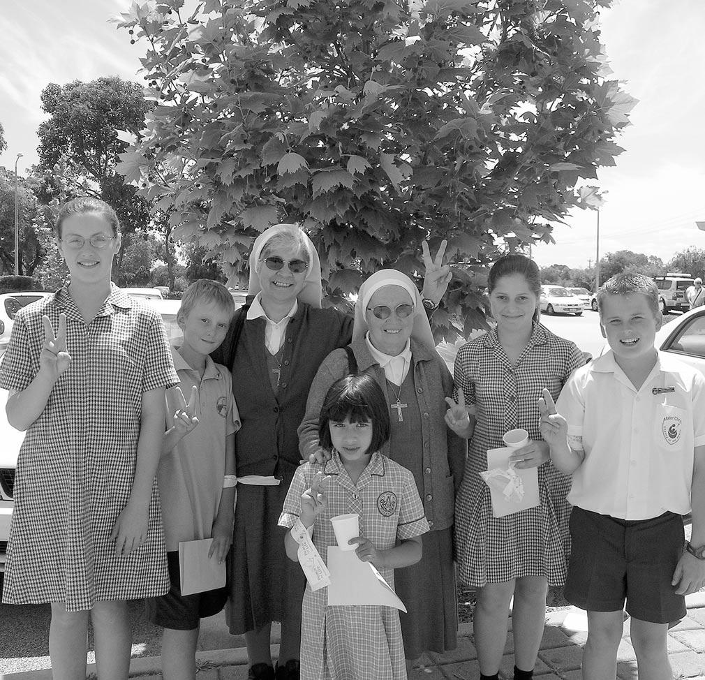 Ursuline nuns Sr Clara and Sr Pia with children at the World Mission Mass