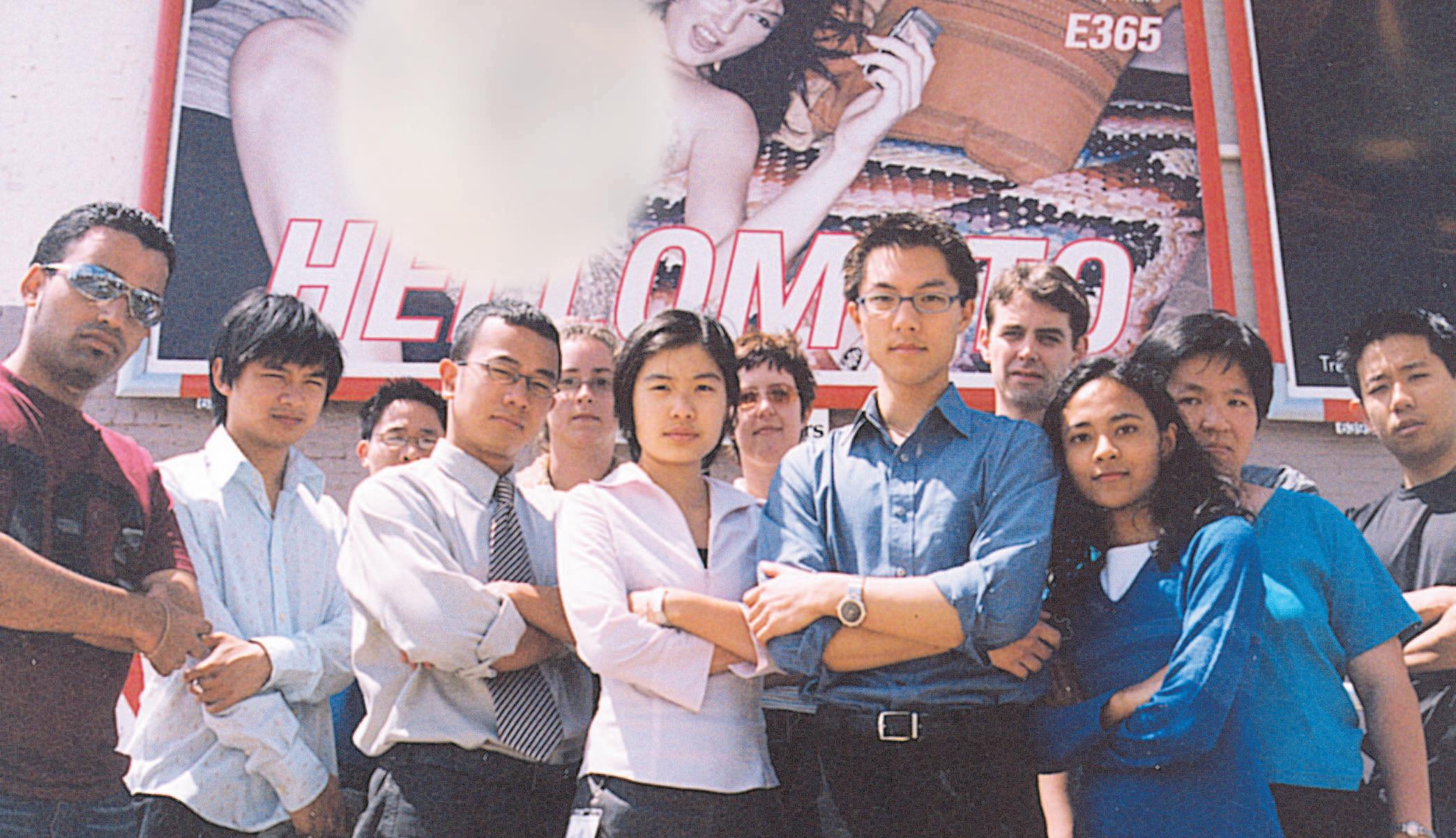 A group of young people led by Jing Ping Wong (fifth from left) stand in front of an example of a sexually provocative ad that they are asking the advertisers to remove.