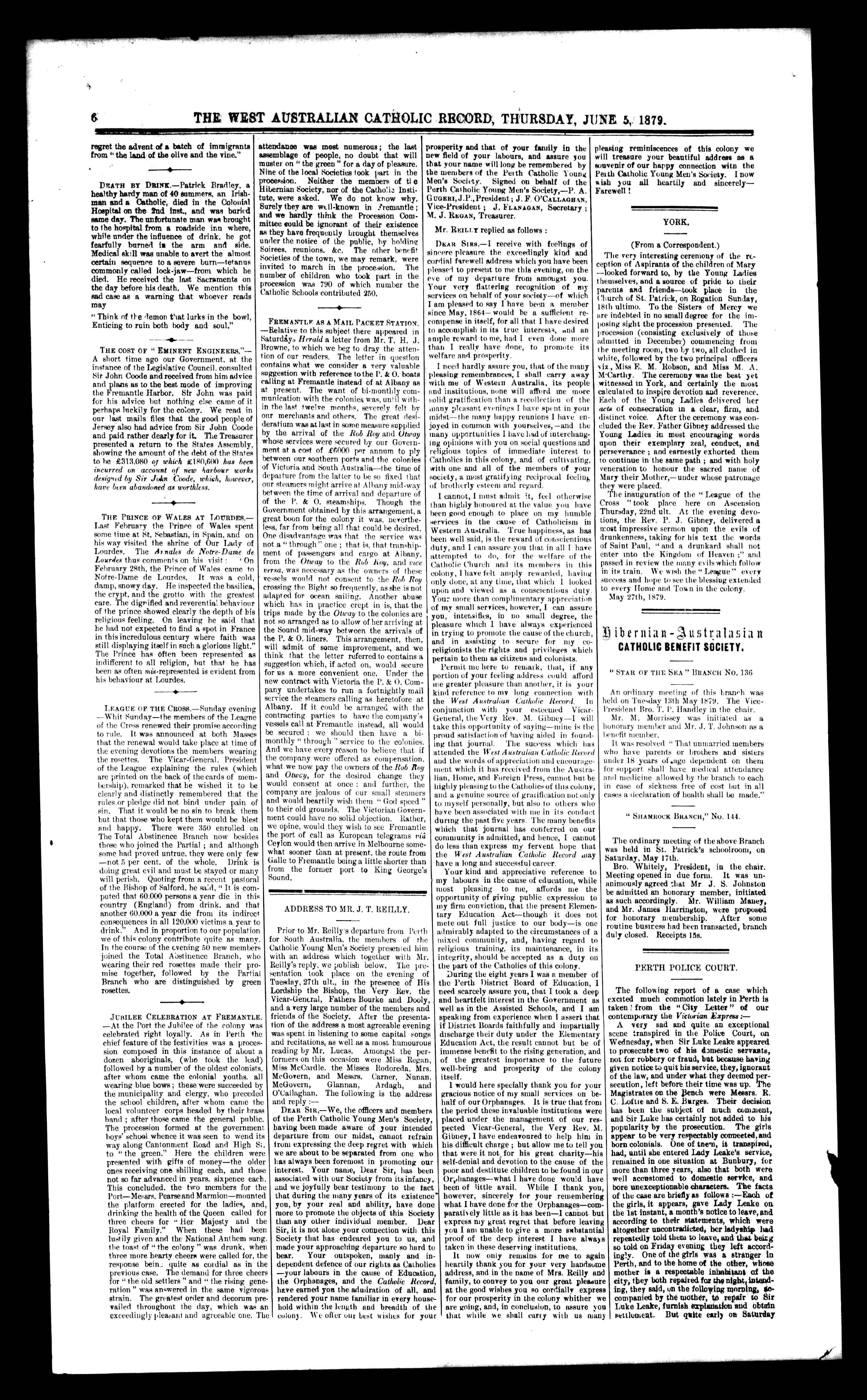 Ineedhardlyassureyou,thatofthemany pleasingremembrances,Ishallcarryaway withmeofWesternAustralia,itspeople rindinstitutions,nonewillaffordmemore solidgratificationthanarecollectionofthe 'tinnypleasanteveningsIhavespentinyour midst-themanyhappyreunionsIhaveenjoyedincommonwithyourselves,-andthe manyopportunitiesIhavelidofinterchangingopinionswithyouonsocialquestionsand religioustopicsofimmediateinterestto Catholicsinthiscolony,andofcultivating, withoneandallofthemembersofyour society,amostgratifyingreciprocalfeeling ofbrotherlyesteemandregard.