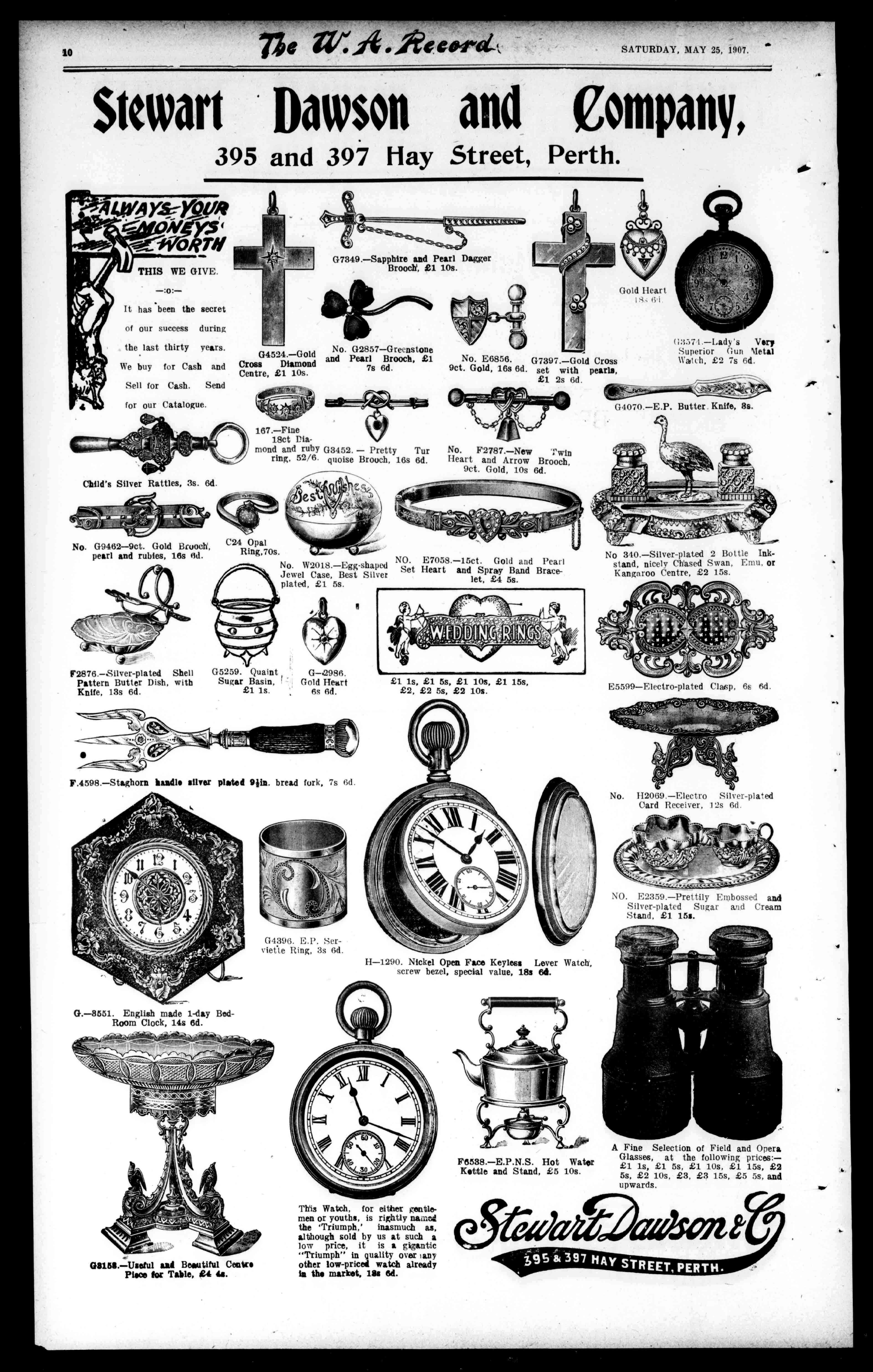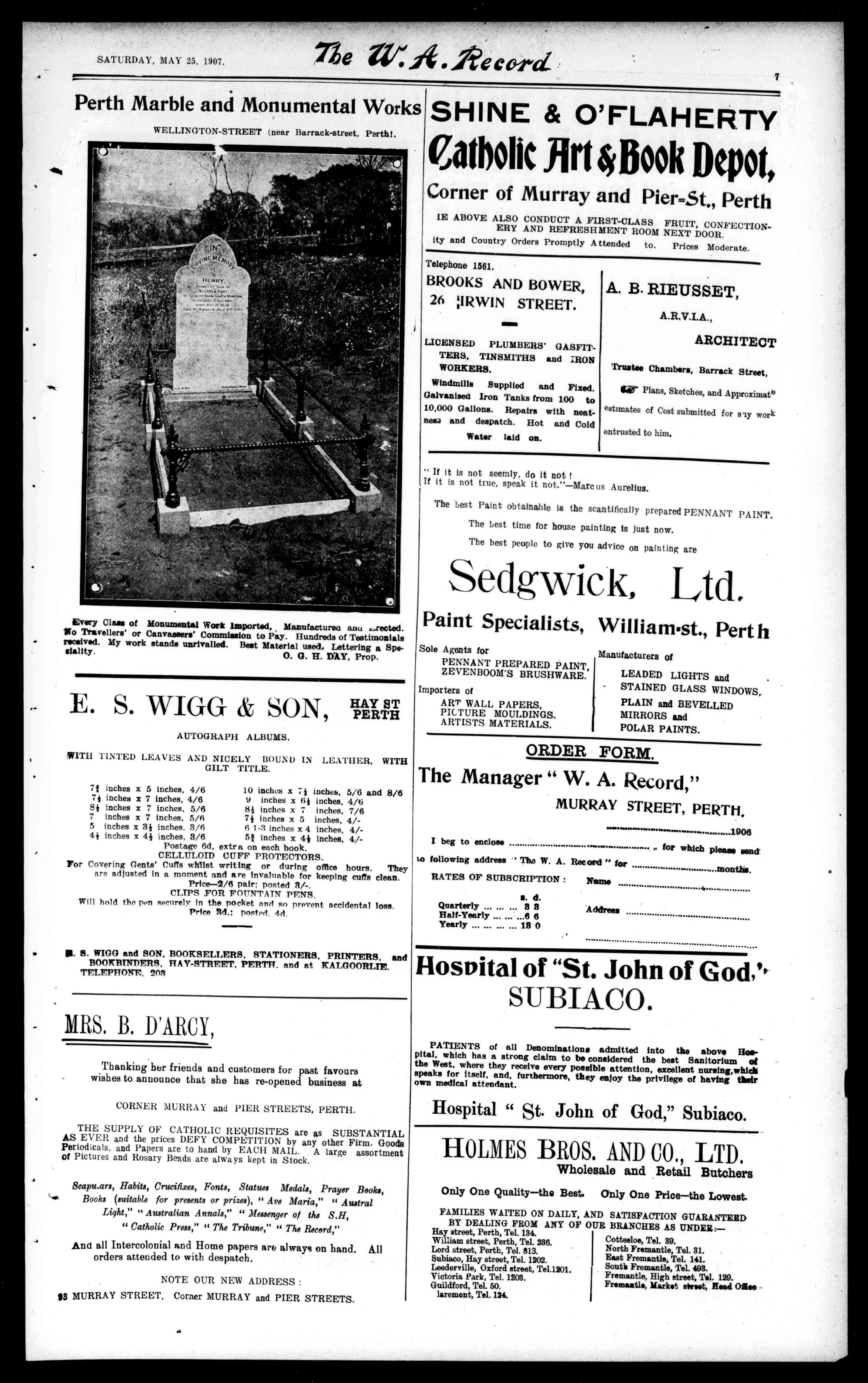 MI..Y.N.RIANwishestonotifyinentitlingtheTenthhearushis lEstablishmentinWesternAustralia,liestillintendstodevotehiswineawl attentiontocateringingoodliteraturefortheCatholicPublicoftheState WRITEFORPRICELIST. tothesamestandardashitherto.Hehasalwaysthelustofeverything newinCatholicorNationalLiteraturetoarriveinAustralia.astheanSANTAROSAWINECOMPANY,uouncementspublishedinthecolumsofthispaperfromtimetotimetestify HehasalsoastockofGoodSecularLiterature,aswellastheLatest Magazines,ReviewsandNewspapers,beingSpecialAgentformostofthem. HewouldSpeciallyDrawAttentiontohisUp-to-dateStockofCatholic andNationalMagazinesandNewspapers.includingAmericanPublications. ThefollowingarealwaysinStockaswell BARRACKSTREET.PERTH. Crucifixes,Rosaries,Medals,Scapulars,Statues,HolyWater Fonts,AltarBreads,AltarCharts,Monstances,Incense,Charcoal,Thuribles AltarCruets,MissalsandStands,AltarCandlesticks,Floats,Tapers,Pure WaxCandles,RosaryTickets,HolyOilStocks,Pyxes,SancturyLamps. HolyWaterVesselandSprinkler.AltarVases,HolyPictures,GelatinePictures(alsoblankforpaintingon),LacePictures,etc.PrayerBooks(hundiredstochoosefrom)ad.to21s.each,andaCatholicHousetobuyfrom.