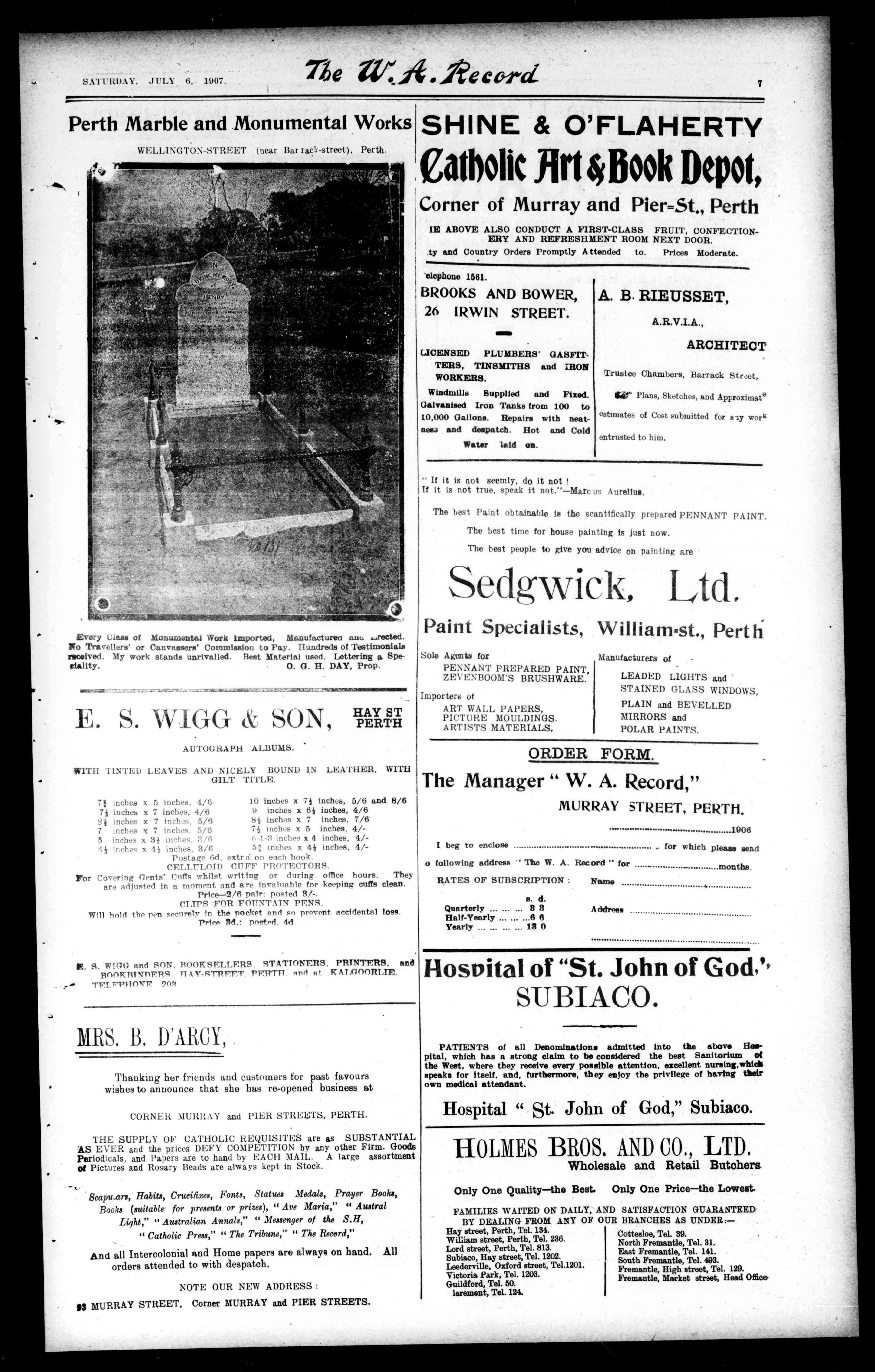 Mkt.Y. itI(ANwishestouotilYineatergiatheTellLb1earalhis EstablishmentinWesternAustralia,heSUBtea"Lucle"At,nibtimeand attentiontocateringingoodliteraturefortheCatholicPublicoftheState tothesamestandardashitherto.Hehasalwaysthefirstofeverything newinCatholicorNationalLiteraturetoarriveinAustralia,astheannouncementspublishedinthecolumsofthispaperfromtimetotimetestify HehasalsoastockofGoodSecularLiterature,aswellastheLatest Magazines,ReviewsandNewspapers,beingSpecial,Agentformostofthem. HewouldSpeciallyDrawAttentiontohisUp-to-dateStockofCatholic andNationalMagazinesandNewspapers.includingAmericanPublications. ThefollowingarealwaysInStockasWell:Crucifixes,Rosaries,medals,Scapulars,Statues.HolyWater Fonts,AltarBreads,AltarCharts,monstances,Incense,Charcoal,Thuribles AltarCruets,MissalsandStands,AltarCandlesticks,Floats,Tapers,Pure WaxCandles,RosaryTickets,HolyOilStocks,Pyres,SancturyLamps. HolyWaterVesselandSprinkler.AltarVases.HolyPictures,GelatinePictures(alsoblankforpaintingon),LacePictures,etc.PrayerBooks(hundredstochoosefrom)2d.to21s.each,andaCatholicHousetobuyfrom. Biblesfrom5s.to£5.