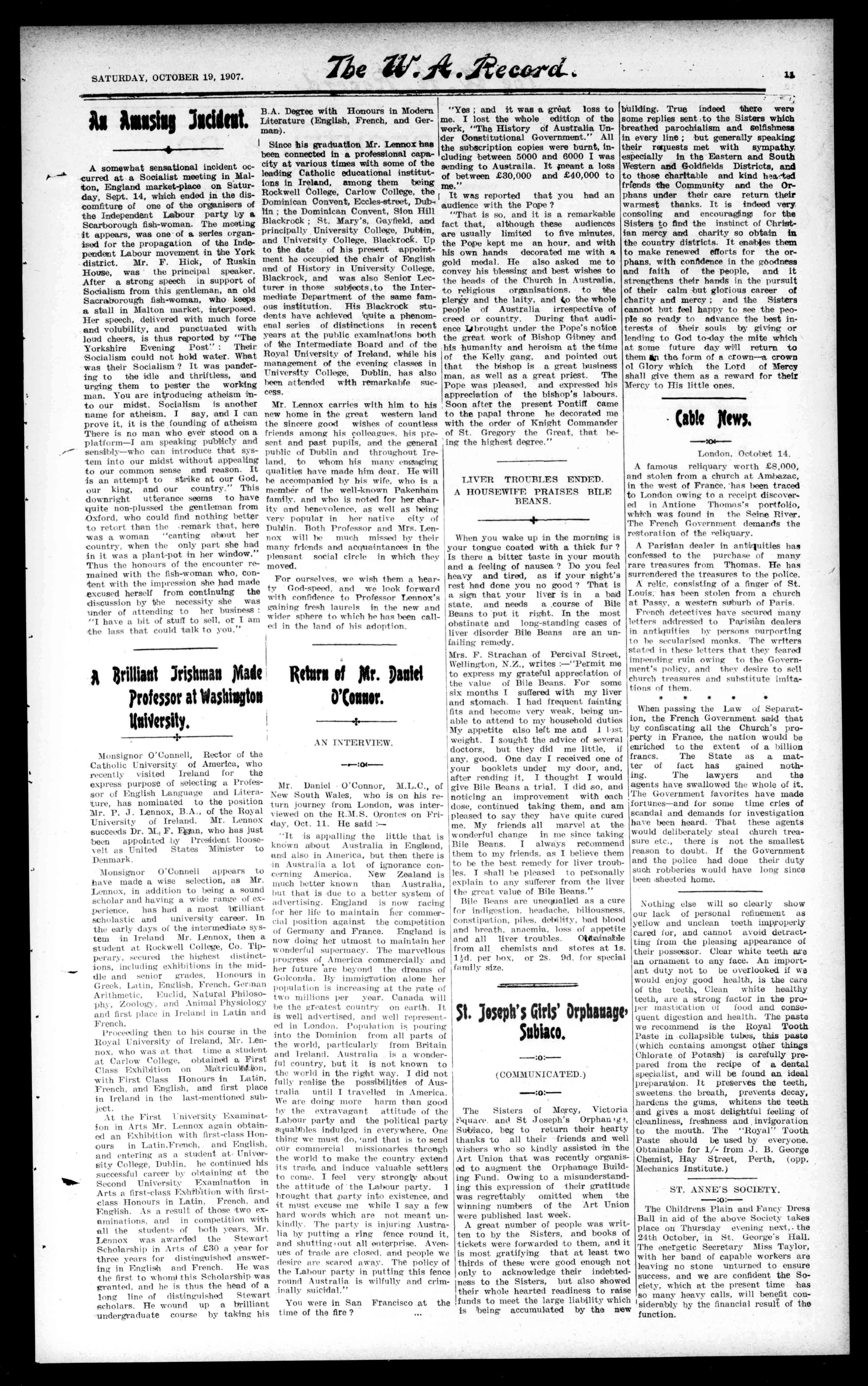 Theannualbazaarandfancyfairin aidofSt.Joseph'sChurchWilding fundwasheldinaspaciousmarquee whichhadbeenerectedonMr..T.O'Hara'sgroundinFitzgerald-street, Northam.Themarqueewasvery nicelydecorated,andwiththefour stallsfilledwithusefulandornamentalgoods,presenteditmostatenctive appearance.Theformal',pettingproceedingstookplaceonelendayafternoon,RothSept..whenMr.G.Titresell.M.L.C..inthepresenceof11large numberoffriendsamlrepresentative ladiesandgentlemen.declaredthe bazaaropenforthetimeliest.forwhich Itwasorganised.AmorertheepresentweretheRev.FatherWalsh.Mr. G.Throssell.MissThressell,Mr.J. Mitchell.11.L.A..evilMrs.Mitchell, Mrs.Hope.Mr.andMrs..T.T.Reilly, Mr.andMrs.Kidson.Mr.andMrs. Fels.Mr.Cody.InspectorandMrs. Duncan.Dr..andMrs.Frost.endMrs. andMiesMorgltn.TheRev.Father Walsh.inrequestingMr.Throssellto declarethebazaaropen,referredin veryappreeiativetermstothegenerousandpracticalassistancerendered totheCatholic'bodybythehon. teentlemae.Thedebtnowdueonthe churchwassome,.£427i.whichheinletedwouldbefurtherreducedbythe proceedsofwhatheanticipatedwould heaverysuccessfulbazaar.The ladieshadworkedhardtowinthe successtheysowelldeserved.andhe congratulatedthemaccordingly. Mr.Throssellsaiderehadbadthe honorofopeningpreviousbazners, andhefeltproudatel;nleasedthathe hadstilltheconfidenceandesteemof hisoldfriends.'Thedebtonthe churchhadbeenreducedfromt1.500 tosomethingover£400.andhefelt thatthatWASasatisfactoryresultfor thepeopletohaveachieved.Hewas 111. delightedtoknowthaithepeoeleof Northam,ofallcreedsworkedwell toesether.Therewasnosuchthingas sectarianism.andforthatverysatisfactoryconditionofaffairsvery-much wasduetothetactandsoundjudgmentofFatherWalsh.FatherWalsh wasdeservedlyesteemedbyallclasses andcreeds.Hewasdoingselendid workintheirmidst.Heknew,and hadheardof.manykindactionsdone bythereverendgentleman.andthereforeitwas,asitalwayswould1*. thatkindnessproducedkindnessinreturn.