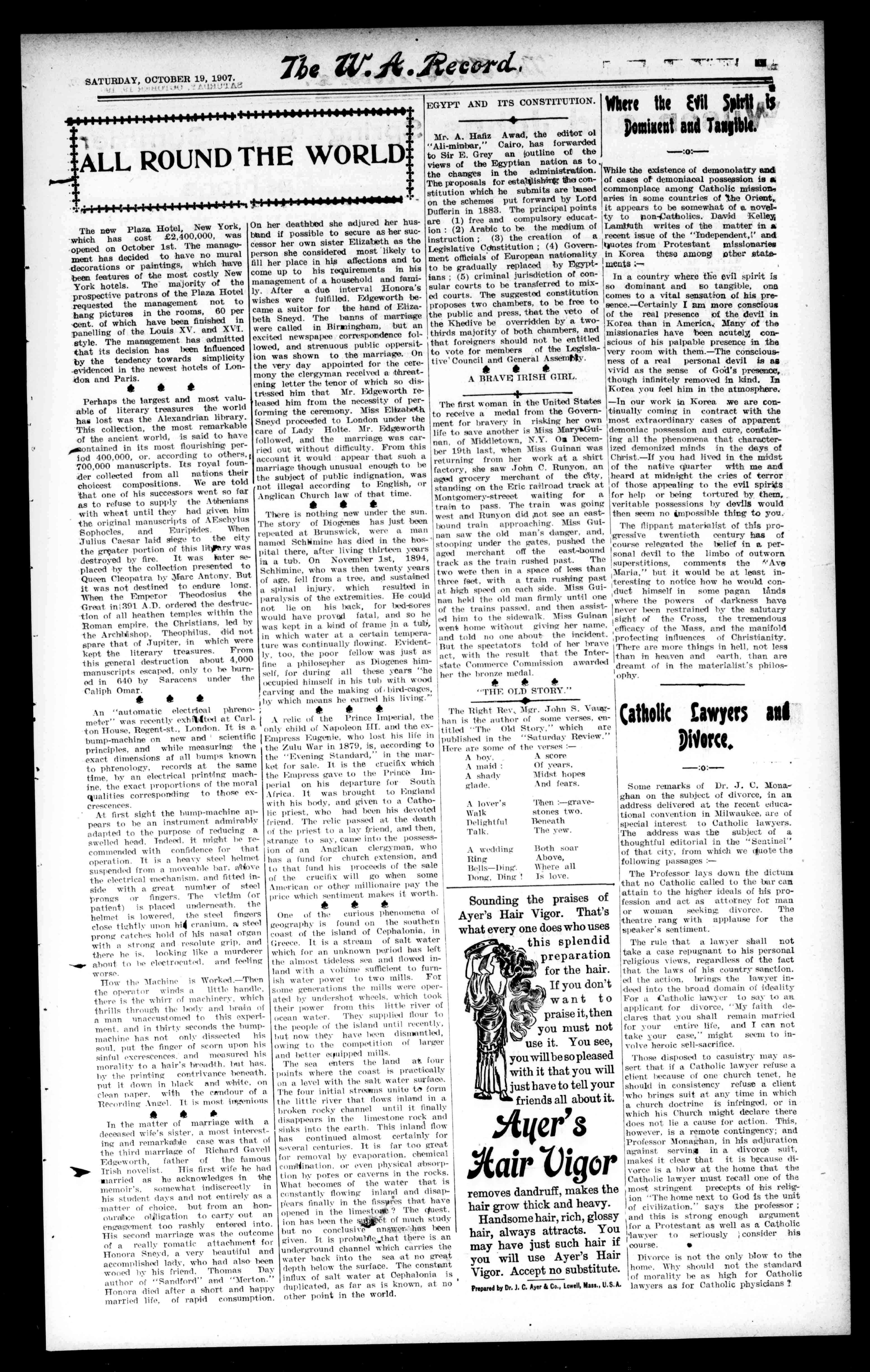 Whiletheexistenceofdemonolatryand, ofcasesofdemoniacalposse,ssionisa commonplaceamongCatholicmission. *triesinsomecountriesof'theOrient, itappearstobesomewhatofanoveltytopion-Catholics.DewedKelley, Lamituthwritesofthematterina recentissueofthe"Independent,{'and quotesfromProtestantmissionaries inKoreatheseamongotherstatemeats Inacountrywheretheevilspiritis sodominantandsotangible,one comestoavitalsensationofhispresence.-CertainlyIammoreconscious oftherealpresenceofthedevilin KoreatheninAmerica.:Manyofthe missionarieshavebeenacutely,consciousofhispalpablepresenceinthe veryroomwiththem.-Theconsciousnessofarealpersonaldevilisas vividasthesenseofGod'spresence, thoughinfinitelyremovedinkind.In Koreayoufeelhimintheatmosphere. -InourworkinKoreawearecontinuallycomingincontractwiththe mostextraordinarycasesofapparent demoniacpossessionandcure,containingallthephenomenathatcharacterizeddemonizedmindsinthedaysof Christ.-Ifyouhadlivedinthemidst ofthenativequarterwithmeand heardatmidnightthecriesofterror ofthoseappealingtotheevilspirits forhelporbeingtorturedbythem, veritablepossessionsbydeviliiwould thenseemnoimpossiblethingtoyou.
