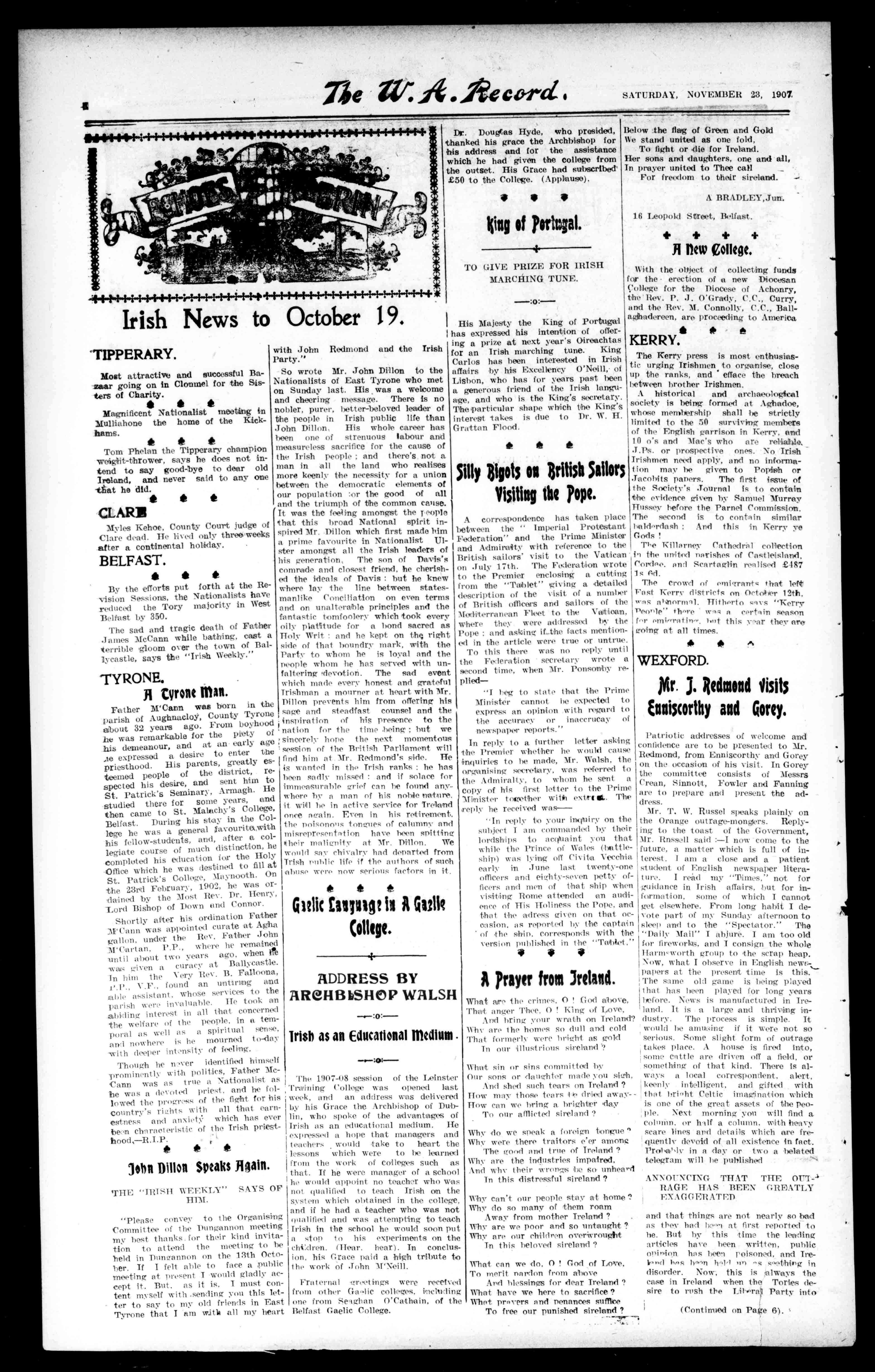hisupresencenghut thewe nation inspirationfor thocil hewasremarkableforthepietyof hisdemeanour,andatan-earlyagosincerelyhopethenextmomentous IreexpressedadesiretoenterthesessdnnoftheBritishParliamentwill priesthood.Hisparents,greatlyes-findhimatMr.Redmond'sside.He teemedpeopleofthedistrict,respectedhisdesire,andsenthimto St.Patrick'sSeminary,Armagh.He studiedthereforsomeyears,and thencametoSt.Malachy'sCollege, Belfast.DuringhisstayintheCollegehewasageneraltavouriteewith hisfellow-students,and,afteracollegiatecourseofmuchdistinction,he CompletedhiseducationfortheHoly Officewhichhewasdestinedtofillat St.Patrick'sCollege,llaynooth.On the23rdFebruary,1902,hewasordainedbytheMustRev.Dr.Henry, -LordBishopofDownandConnor.