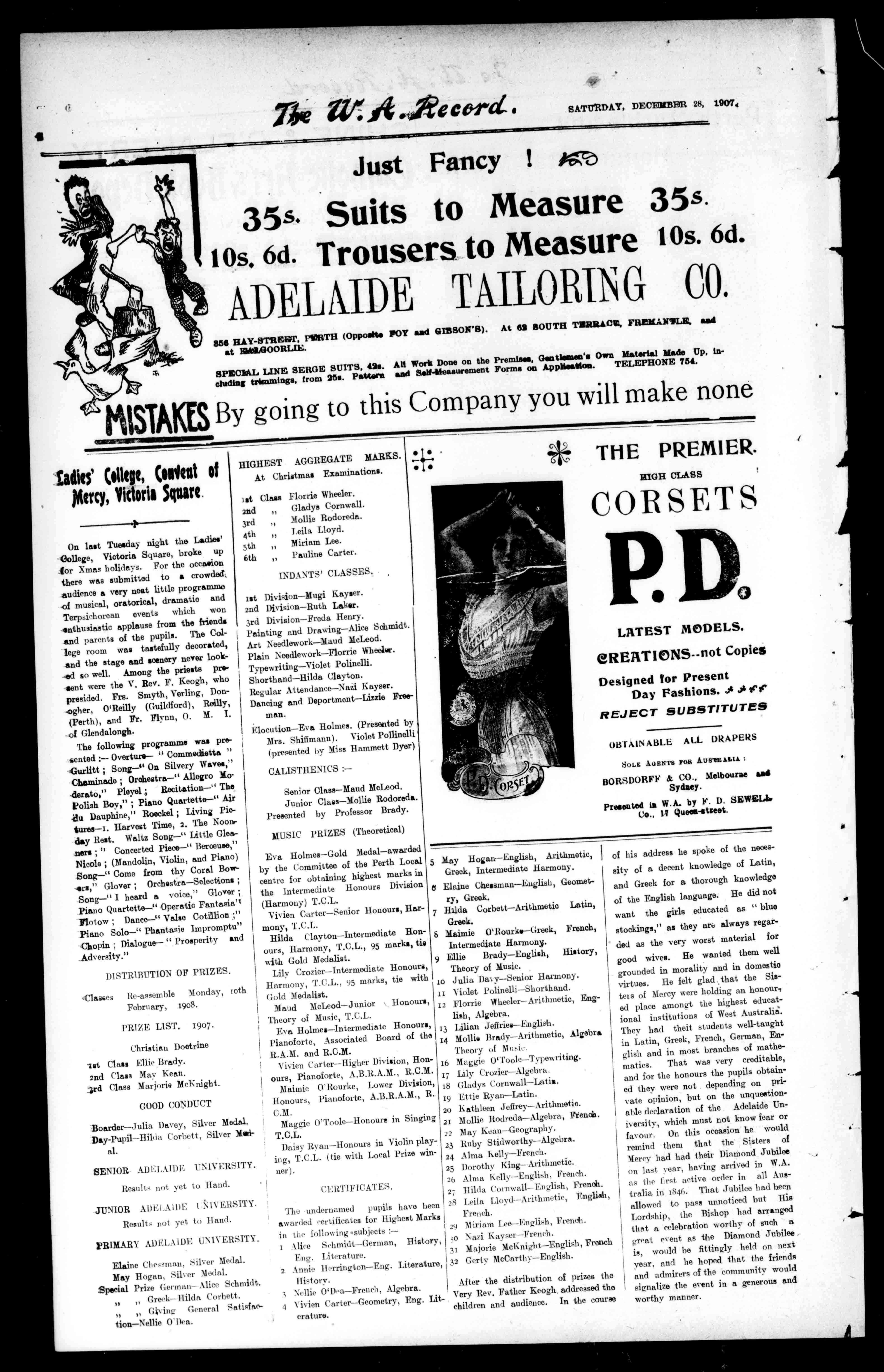 OnlastTuesdaynighttheLadies' 43ollege,VictoriaSquare,brokeup forXmasholidays.Fortheoccasion therewassubmittedtoacrowded; audienceaveryneatlittleprogramme ofmusical,oratorical,dramaticand Terpsichoreaneventswhichwon snthusiasticapplausefromtheMends andparentsofthepupils.TheCollegeroomwastastefullydecorated, andthestageandsceneryneverlook-edsowell.AmongthepriestspresentweretheV.Rev.F.Keogh,who presided.Frs.Smyth,Verling,Don.ogher,O'Reilly(Guildford),Reilly, (Perth),andFr.Flynn,0.M.I. ofGlendalongh.