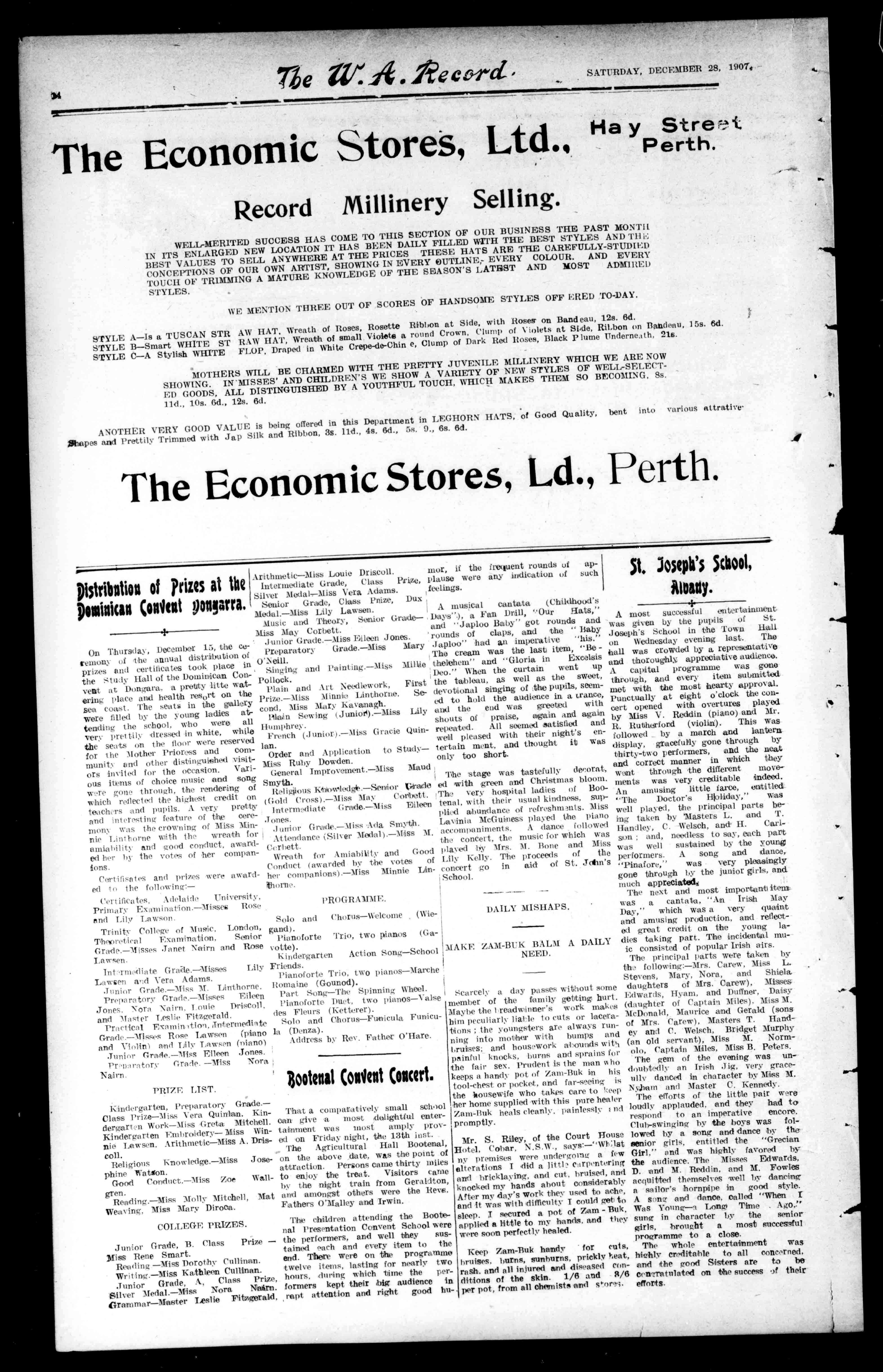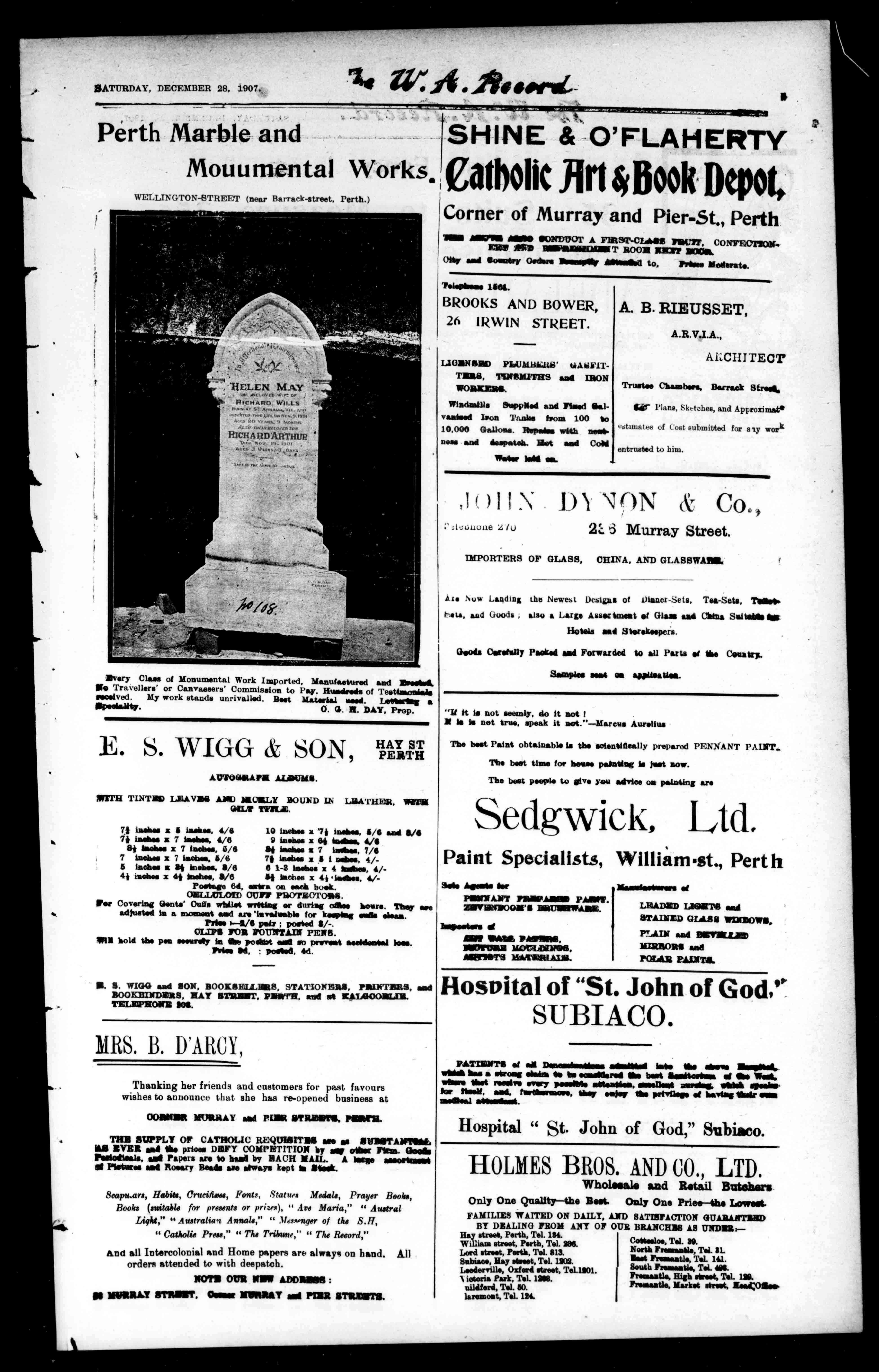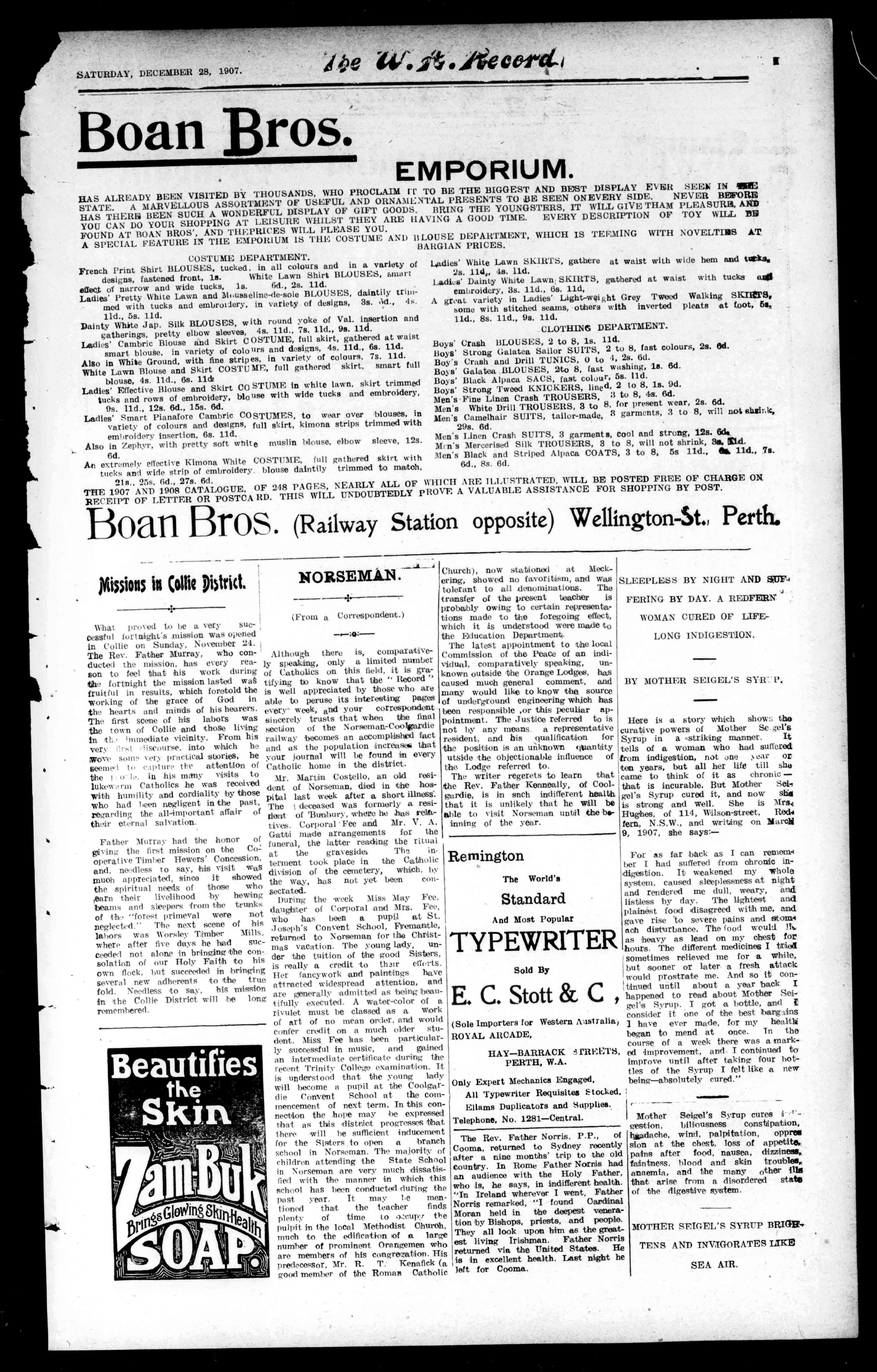 Scapuars,Habits,Crurifuses,Fonts,StatuesMedals,PrayerBooks, Books(suitableforpresentsorprizes),"AveMaria,""Austral Light,""Australia'sAnnals,""Messngero/theS.H, "CatholicPress,""TheTribune,""TheRecord," endallIntercolonialandHornepapersarealwaysonhand.All ordersattendedtowithdespatch.