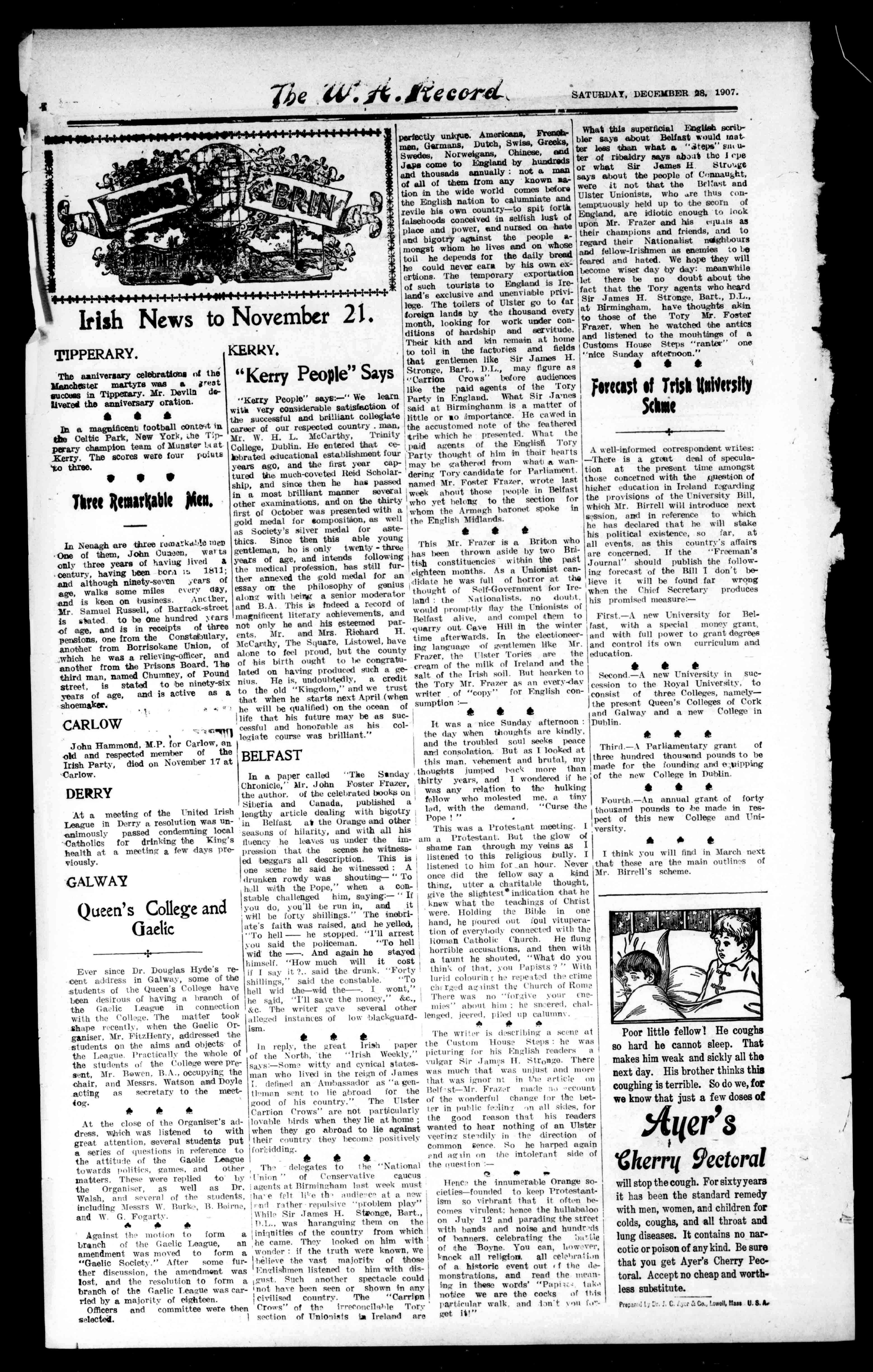 ThisMr.FrazerisaBritonwho hasbeenthrownasidebytwoBritishconstituencieswithinthepest therannexedthegoldmedalforaneighteenmonths.AsaUnionistcanessayonthephilosophyofgeniusidielatehewasfullofhorroratthe alonewithbeingaseniormoderatorthoughtofSelf-GovernmentforIreandB.A.ThisisindeedarecordoflandtheNationalists,nodeubt, magnificentliteraryaohievements,andwouldpromptlyflaytheUnionistsof notonlyheandhisesteemedpar-Belfastalive,andcompelthemto eats.Mr..andefts.RichardH.'quarryoutCaveHillinthewinter McCarthy,TheSquare,Listowel,havetimeafterwards.Intheelectioneeralonetofeelproud,butthecountymglanguageofgiitemenlikeMr. ofhisbirthoughttobeoongratu-Frazer,theUlsterToriesarethe 'citedonhavingproducedsuchage-creamofthemilkofIrelandandthe nius.Heis,undoubtedly,acreditsaltoftheIrishsoil.Buthearkento totheold"Kingdom,"andwetrusttheToryMr.Frazerasanevery-dav thatwhenhestartsnextApril(whenwriterof"copy"forEnglishconhewillbequalified)ontheoceanofsumption:lifethathisfuturemaybeassuc- & cessfulandhonorableashiscol-