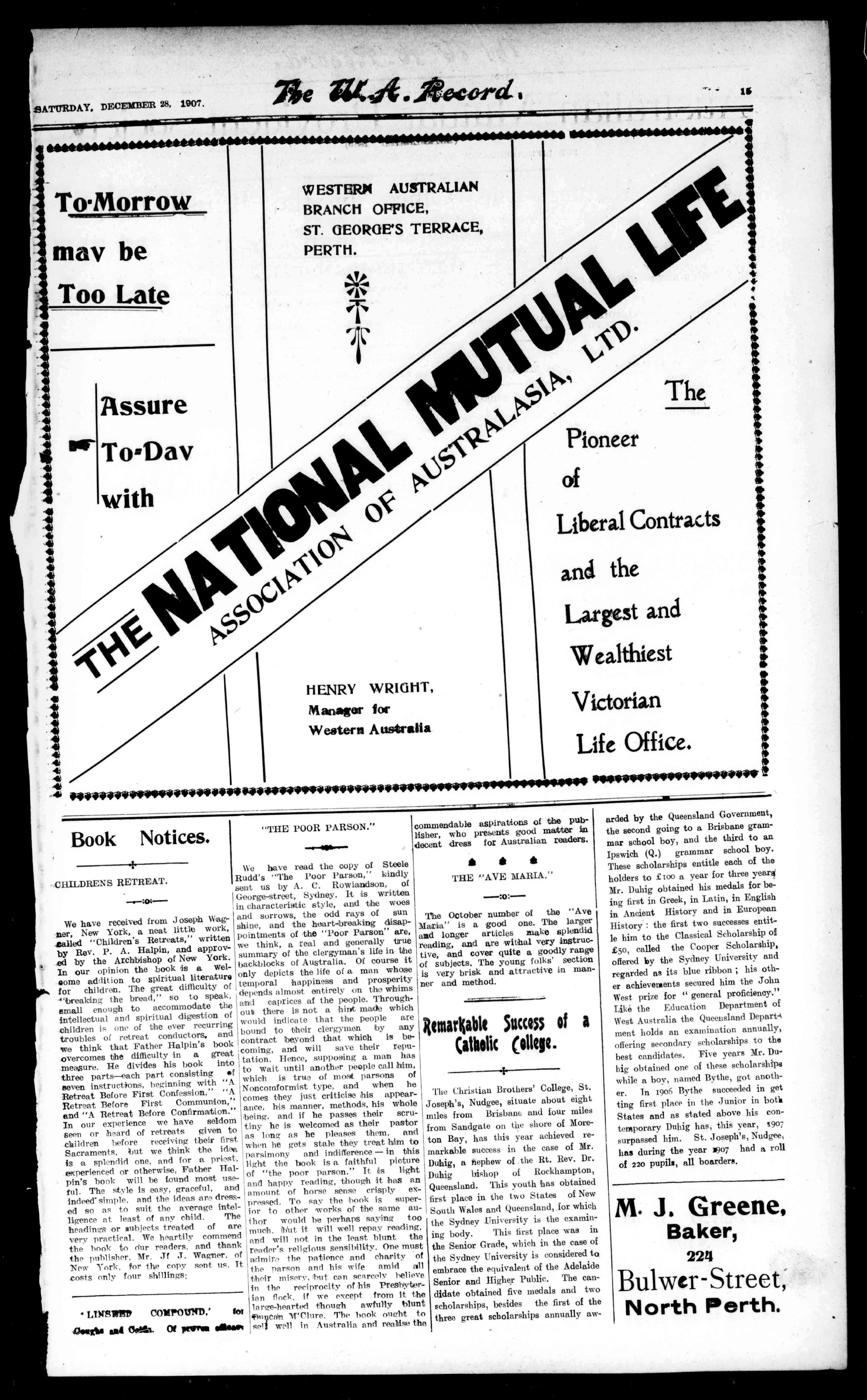 ardedbytheQueenslandGovernment, thesecondgoingtoaBrisbanegrammarschoolboy,andthethirdtoan Ipswich(Q.)grammarschoolboy. Thesescholarshipsentitleeachofthe holderstotooayearforthreeyear4 Mr.DuhigobtainedhismedalsforbeingfirstinGreek,inLatin,inEnglish inAncientHistoryandinEuropean HistorythefirsttwosuccessesentitlehimtotheClassicalScholarshipof £50,calledtheCooperScholarship, offeredbytheSydneyUniversityand regardedasitsblueribbon;hisotherachievementssecuredhimtheJohn Westprizefor"generalproficiency." LiketheEducationDepartmentof WestAustraliatheQueenslandDeparts mentholdsanexaminationannually, offeringsecondaryscholarshipstothe bestcandidates.FiveyearsMr.Duhigobtainedoneofthesescholarships whileaboy,namedBythe,gotanother.In1906Bythesucceededinget tingfirstplaceintheJuniorinboth StatesandasstatedabovehiscontemporaryDuhighas,thisyear,s9o7 surpassedhim.St.Joseph's,Nudgee, hasduringtheyearisoshadaroll of220pupils,allboarders. M.