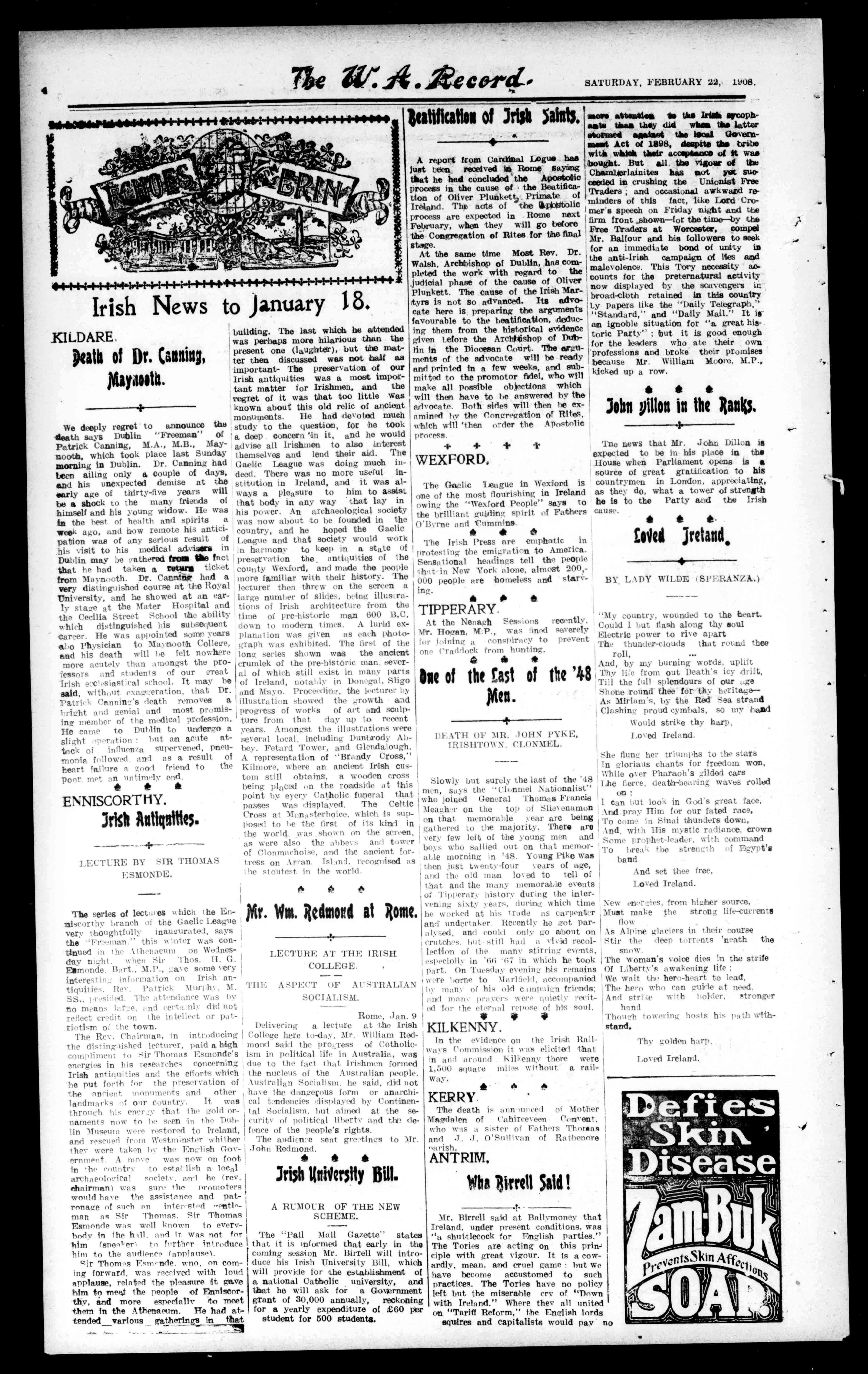 Wedeeplyregrettoannouncethe deathsaysDublin"Freeman"of PatrickCanning,M.A.,M.B.,Maynooth,whichtookplacelastSunday morningInDublin.Dr.Canninghad beenailingonlyacoupleofdays, andhisunexpecteddemiseatthe earlyageofthirty-fiveyearswill beashocktothemanyfriendsof himselfandhisyoungwidow.Hewas inthebestofhealthandspiritsa weekago,andhowremotehisanticipationwasofanyseriousresultof hisvisittohismedicaladvisorsin Dublinmaybe:slitheredfp liefact thathehadtakenareeler.ticket fromMaynooth.Dr.Canna"hada verydistinguishedcourseatteeRoyal University,andheshowedatanearlystareattheMaterHospitaland theCeciliaStreetSchooltheability whichdistinguishedhissubsequent Career.Hewasappointedsomeyears aloPhysiciantoMaynoothCohere, andhisdeathwilleefeltnowhere moreacutelythanamongsttheprofessorsandstudentsofourereat Irishecclesiasticalschool.Itmayhe said,withoutexareseration,thatDr. PatrickCarmine'sdeathremovesa refightandgenialandmostpromisingmemberofthemedicalprofession. HecametoDublintoundergoa slightoperationbutanacuteattackofinfluenzasupervened,pneumoniafollowed,andasaresultof heartfailureagaolfriendtothe poormetan#nntinteend