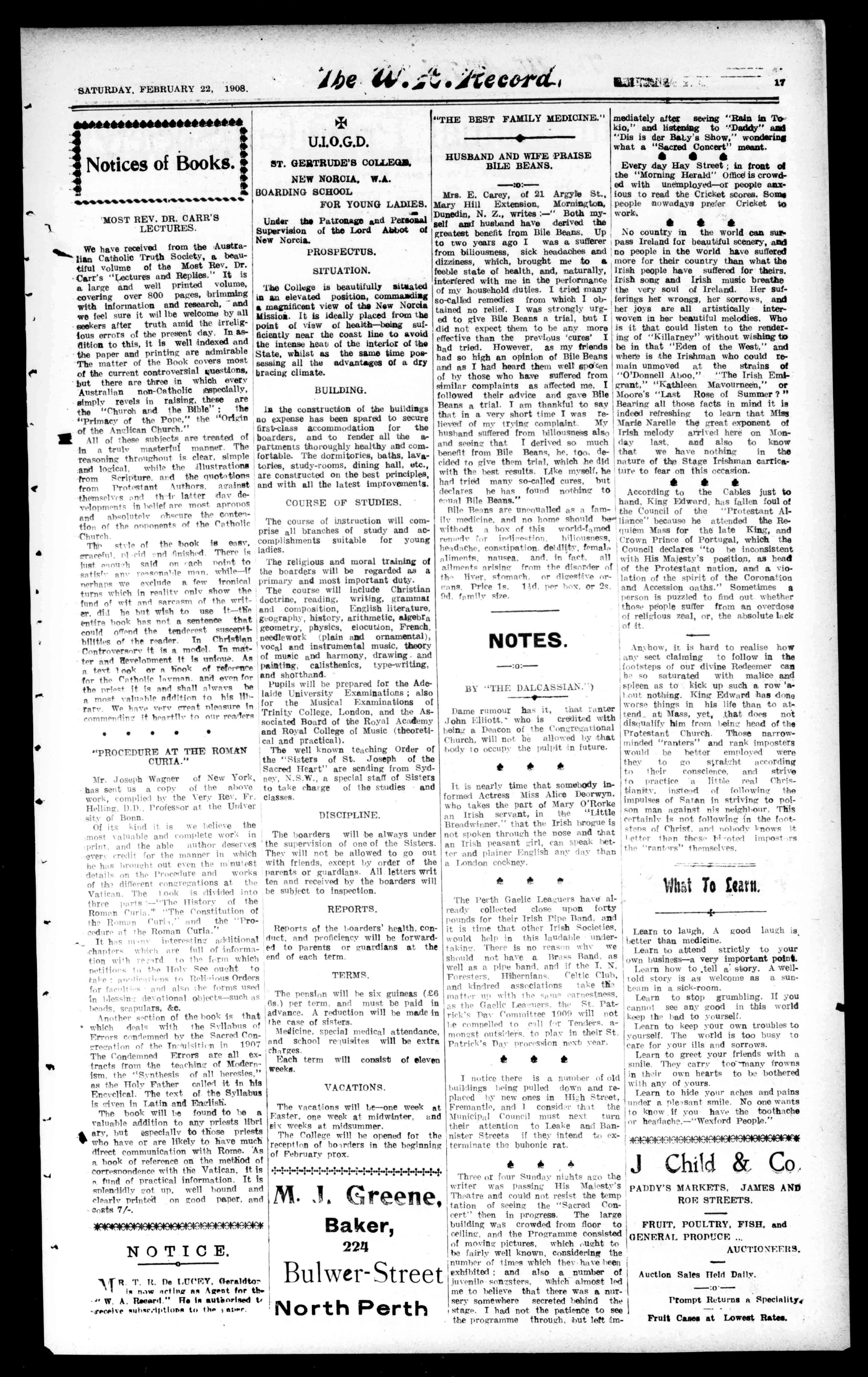 Mrs.E.Carey,of21ArgyleSt., MaryHillExtension,Mornington, Dunedin,N.Z.,writes:-"Bothmyselfandhusbandhavederivedthe greatestbenefitfromBileBeans.Up totwoyearsagoIwasasufferer frombiliousness,sickheadachesand dizziness,which,broughtmetoa feeblestateofhealth,and,naturally, interferedwithmeintheperformance ofmyhouseholdduties.Itriedmany so-calliedremediesfromwhichIobtainednorelief.IwasstronglyurgedtogiveBileBeansatrial,butI didnotexpectthemtobeanymore effectivethantheprevious'cures'I hadtried.However,asmyfriends hadsohighanopinionofBileBeans andasIhadheardthemwellspoken ofbythosewhohavesufferedfrom similarcomplaintsasaffectedme.I followedtheiradviceandgaveBile Beansatrial.Iamthankfultosay thatinaveryshorttimeIwasrelievedofmytrvinrcomplaint..My husbandsufferedfromhilionstiessalso andseeingthatIderivedsomuch benefitfromBileBeans,he,too.decidedtogivethemtrial,whichhedid withthehestresults.Tikemyself,he hailtriedmanyso-calledcures,but declareshehasfoundnethineto esisnlBileBeans."